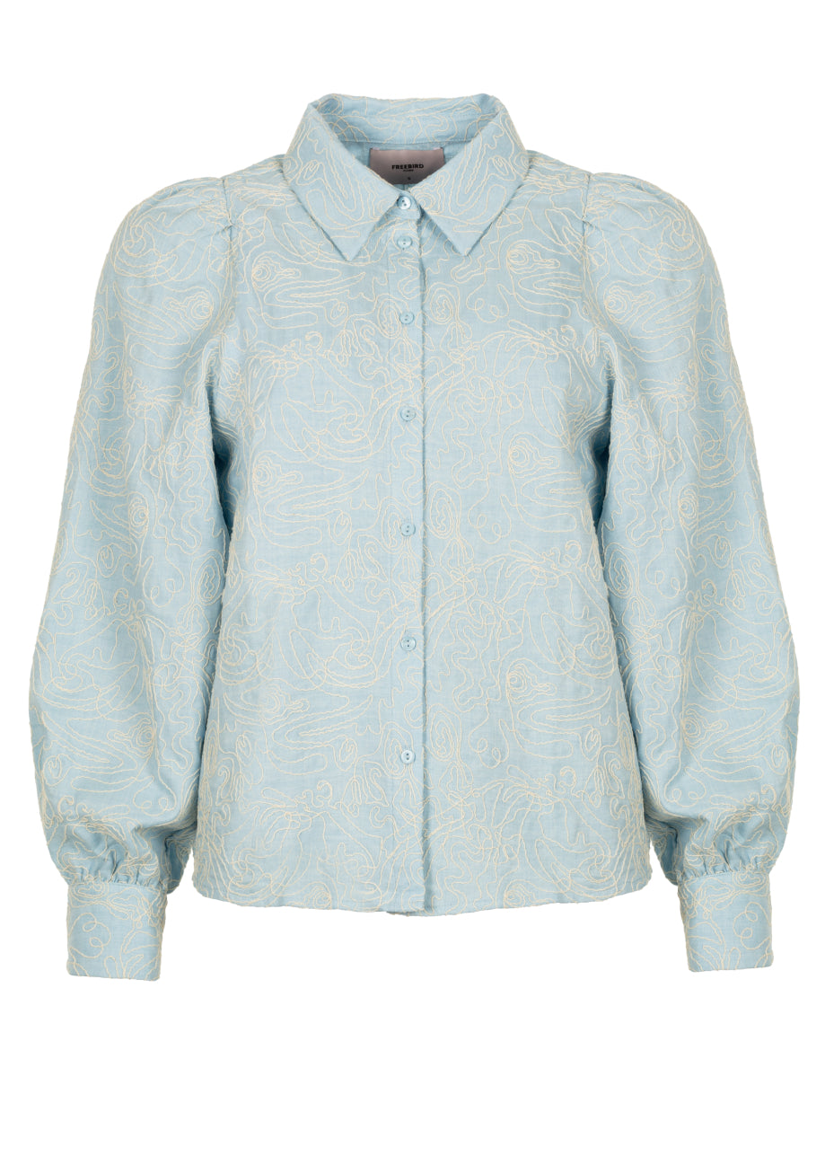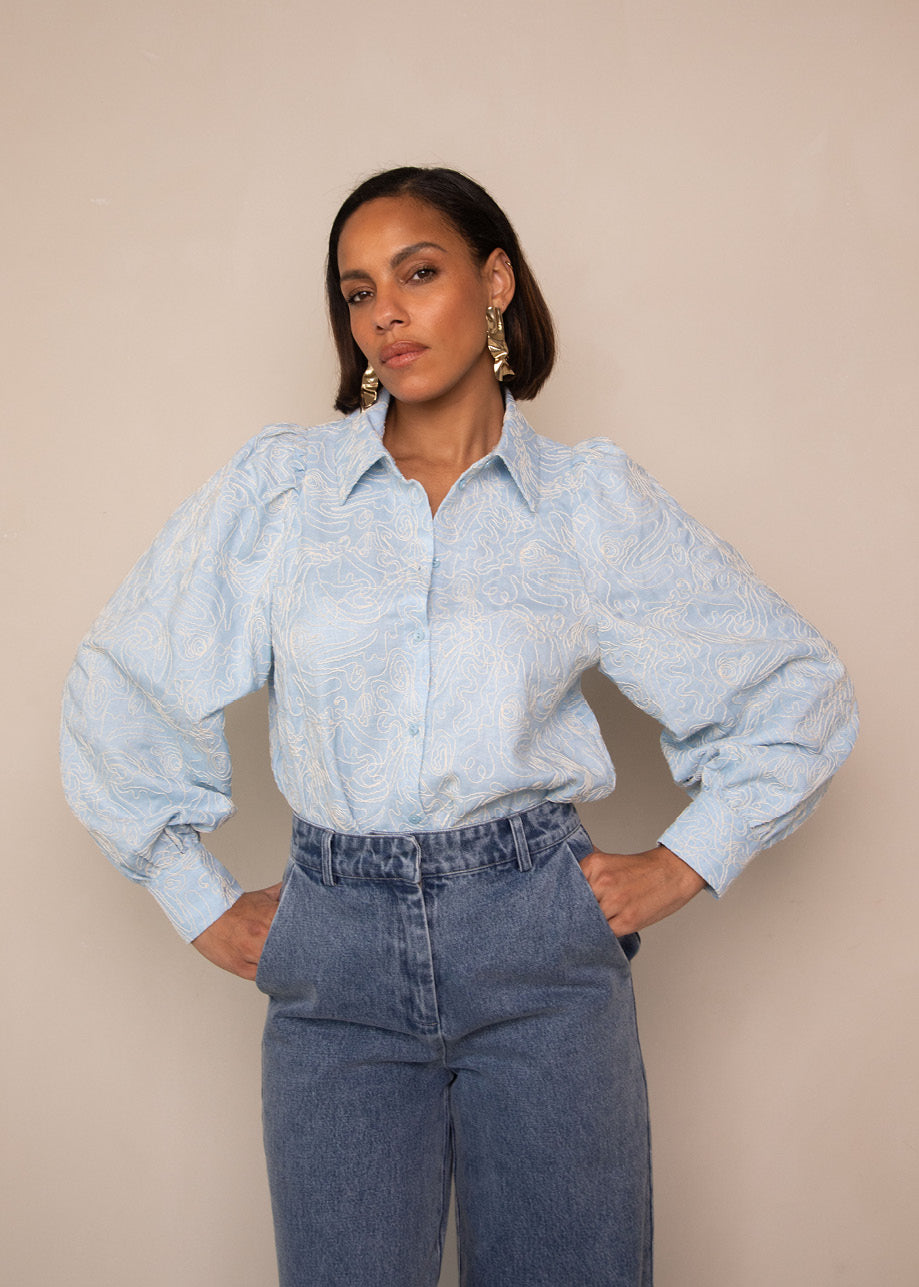 De blouse is ontworpen met mooie ballonmouwen die zorgen voor een vrouwelijk en eigentijds silhouet. De klassieke kraag en knoopsluiting geven het ontwerp een tijdloze uitstraling, ideaal voor zowel dagelijkse als meer geklede gelegenheden.