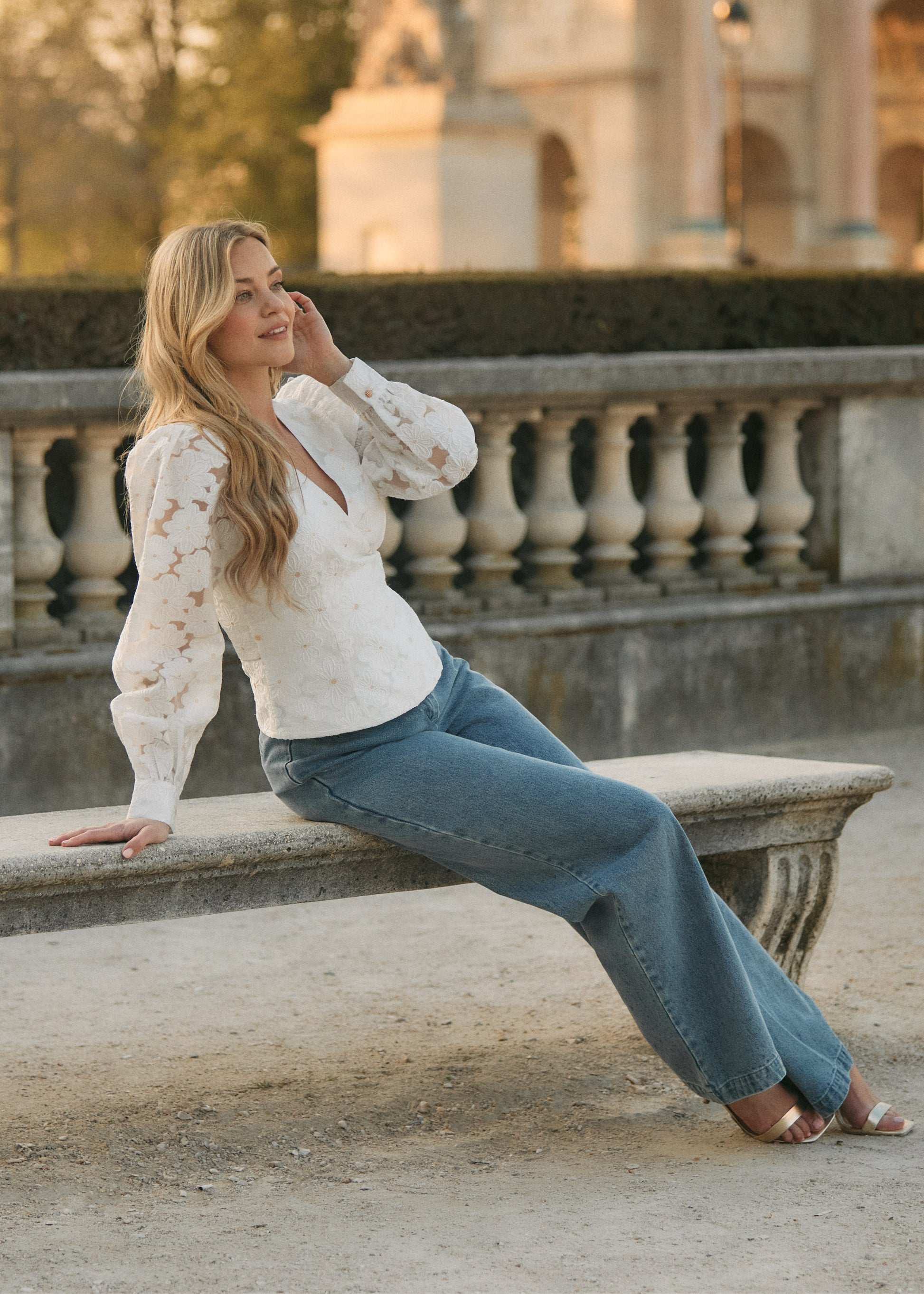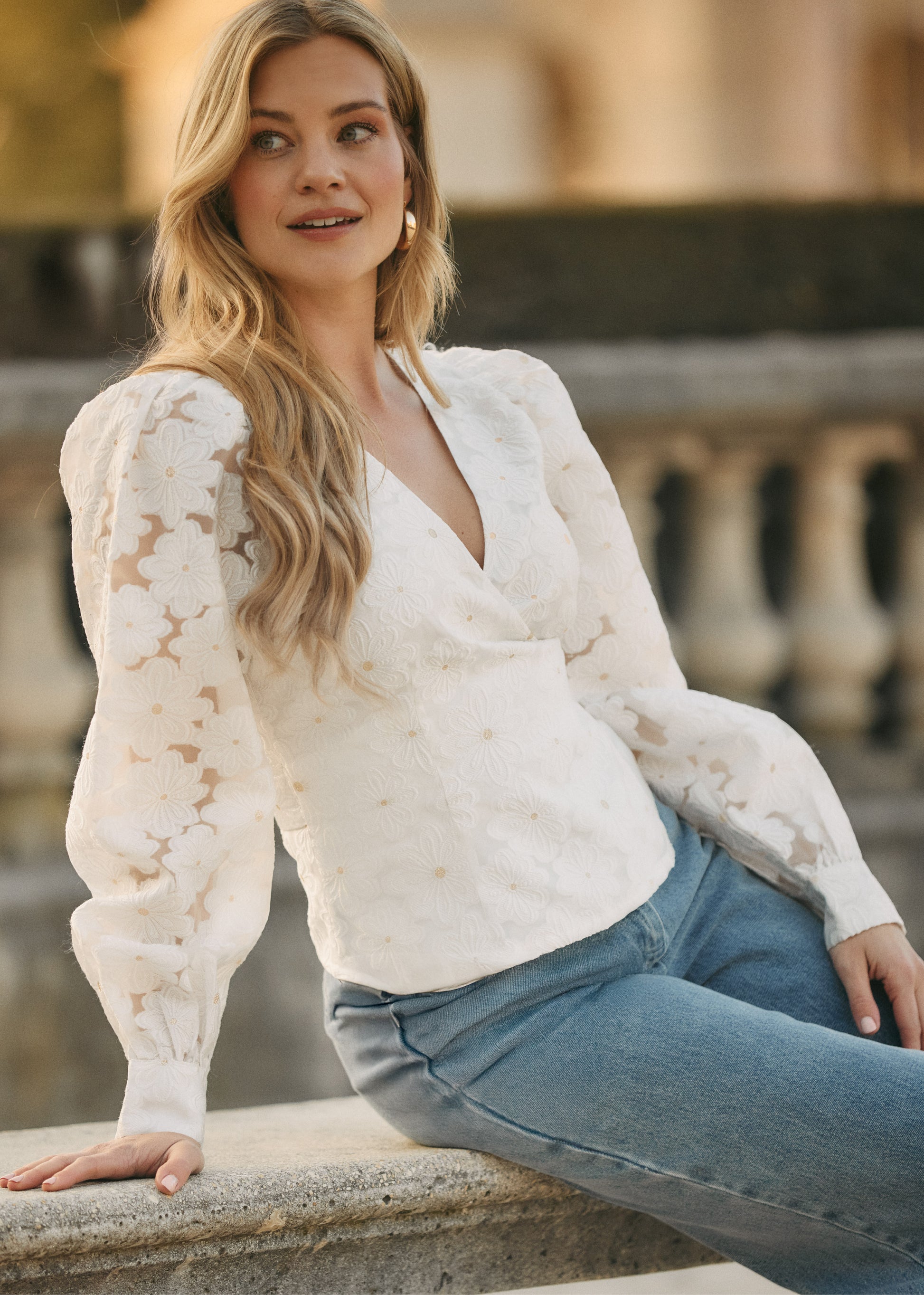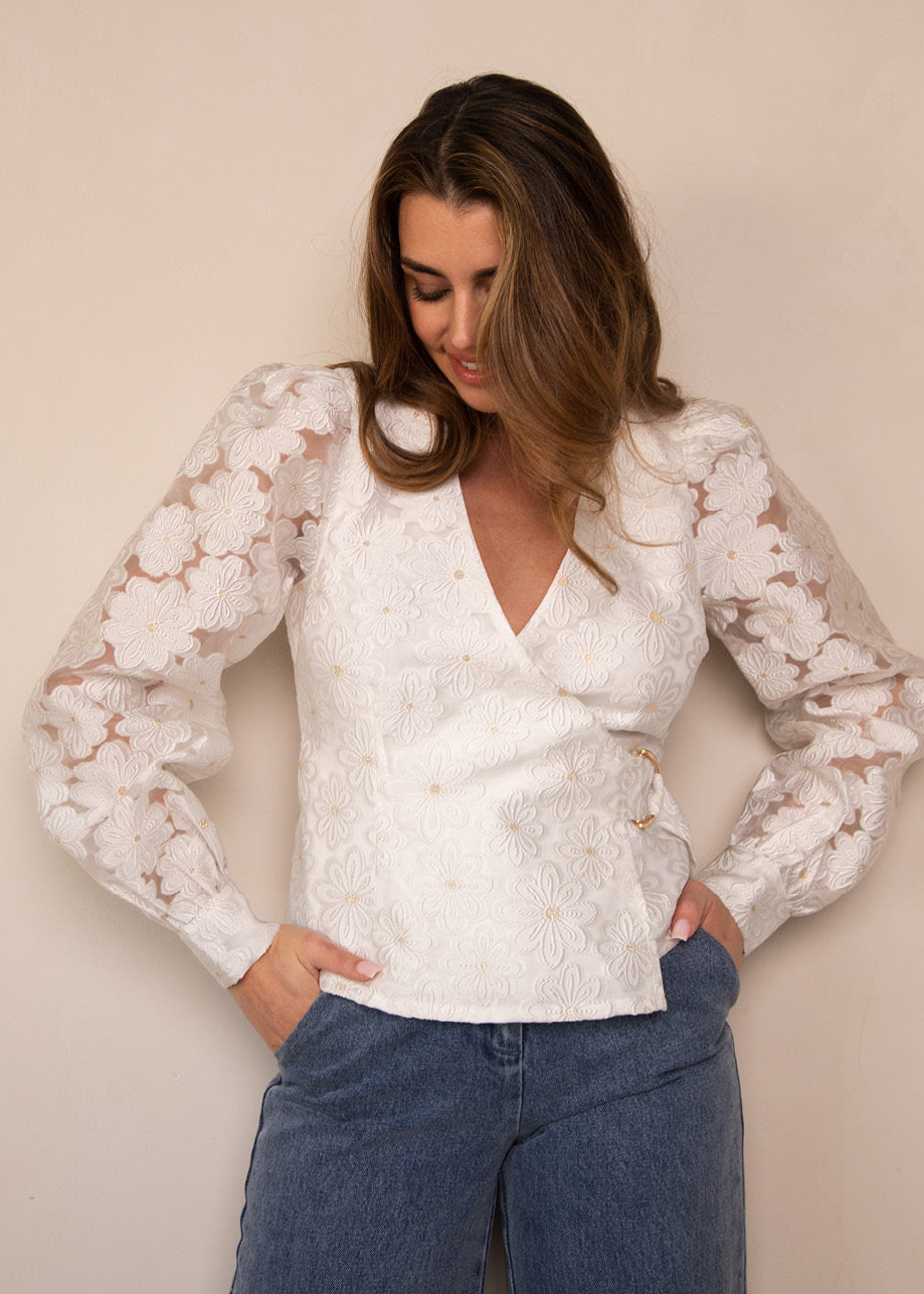 Voeg een vleugje romantiek toe aan je garderobe met deze elegante overslagtop. Gemaakt van een transparante stof met verfijnd bloemenreliëf, biedt deze top een vrouwelijke en luchtige uitstraling. De D-ring sluiting in de taille accentueert het silhouet en zorgt voor een stijlvolle pasvorm. Perfect voor speciale gelegenheden of als chique statement in je dagelijkse look.