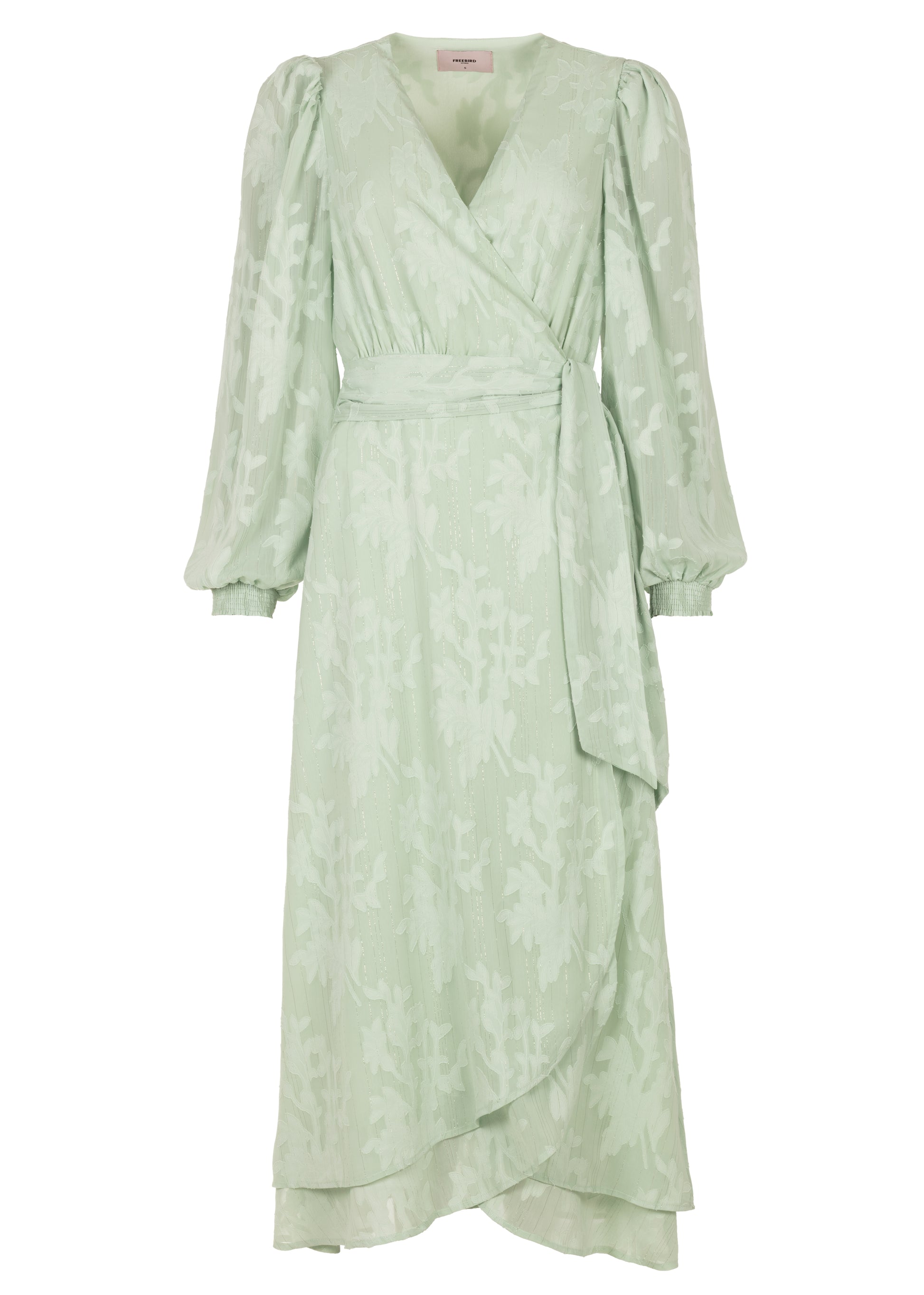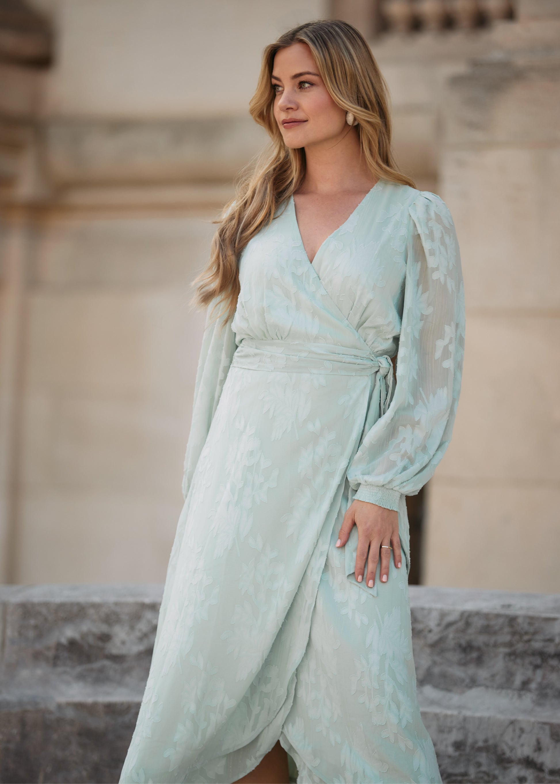 Het overslagdesign zorgt voor een flatterende pasvorm, terwijl de strikceintuur in de taille je silhouet prachtig accentueert. Ideaal voor bruiloften, feestjes of een zomerse avond uit.