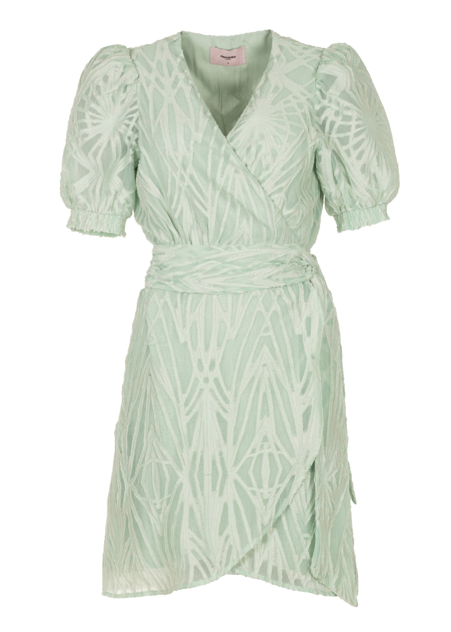 Deze korte wrap dress is gemaakt van een soepelvallende polyester stof met een subtiel jacquard bloemenpatroon, wat zorgt voor een romantische en elegante uitstraling. De jurk heeft korte pofmouwen met elastische smock cuffs voor extra volume en draagcomfort. De strikceintuur in de taille benadrukt het vrouwelijke silhouet, terwijl de overslag aan de voorkant een flatterende V-hals creëert. Perfect voor feestelijke gelegenheden of een zonnige dag.