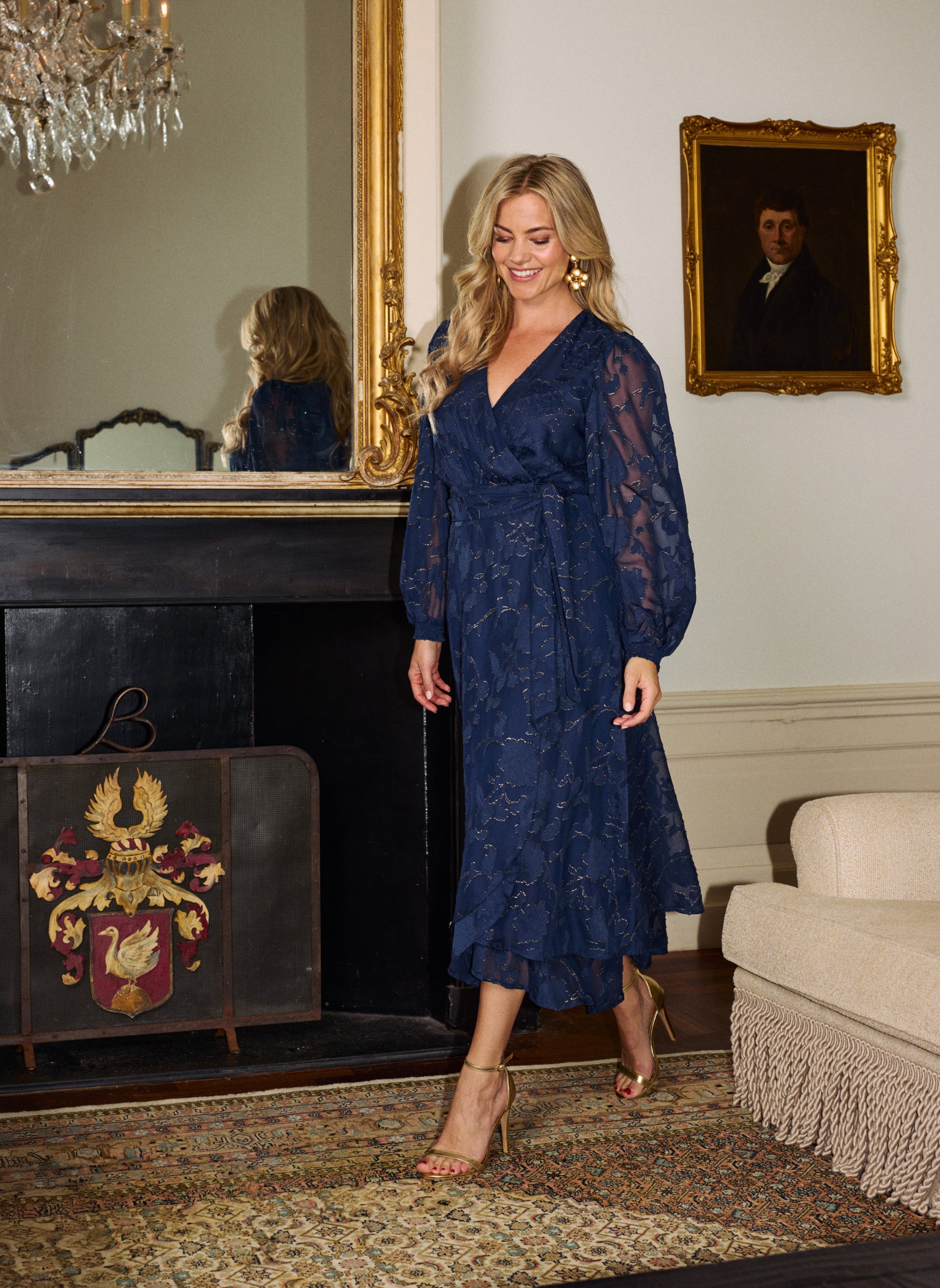 De jurk is gemaakt van een verfijnde jacquard kwaliteit met een subtiel bloemenpatroon dat voor diepte en luxe zorgt. Het overslagmodel accentueert de taille op een natuurlijke manier en kan met de afneembare tailleband zelf gestrikt worden voor een perfecte pasvorm. Dankzij de soepele stof en het tijdloze ontwerp is deze jurk ideaal voor zowel een speciale gelegenheid als een stijlvolle daglook.
