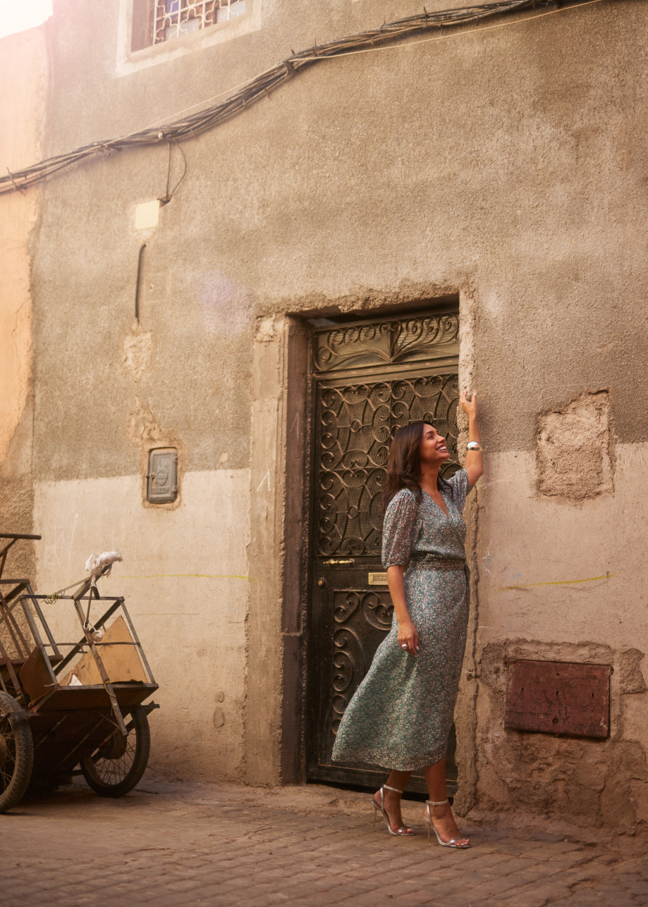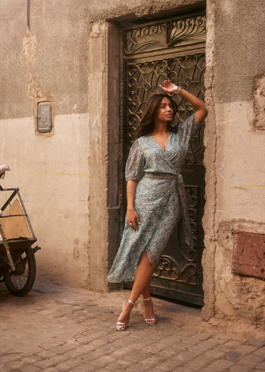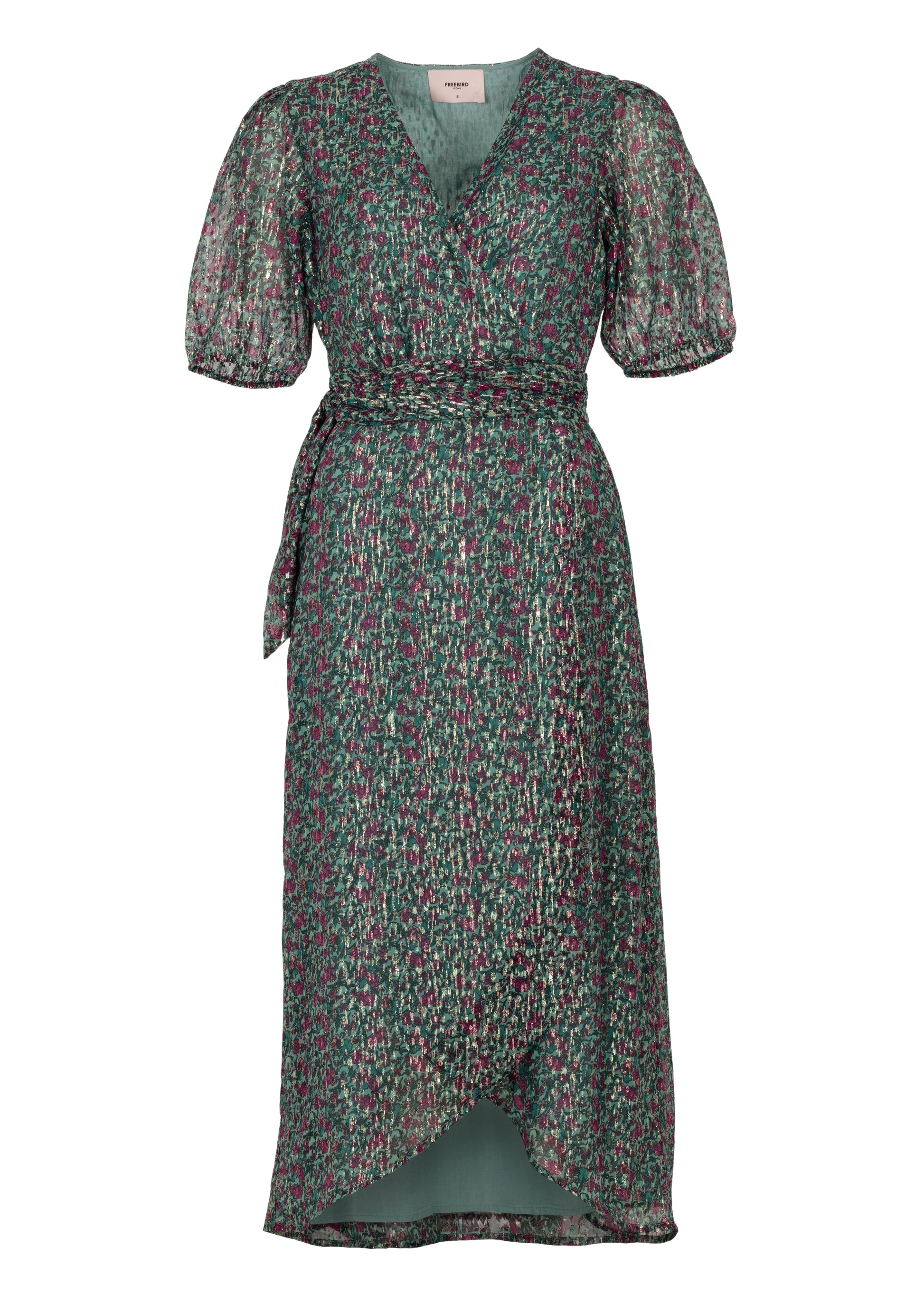 Deze prachtige overslagjurk is een verfijnde combinatie van vrouwelijkheid en elegantie. Gemaakt van een luxe polyester jacquard stof met subtiele lurex details, geeft de jurk een subtiele glans en een luxe uitstraling. De speelse bloemenprint voegt een romantische touch toe, terwijl de tailleband je silhouet mooi accentueert.