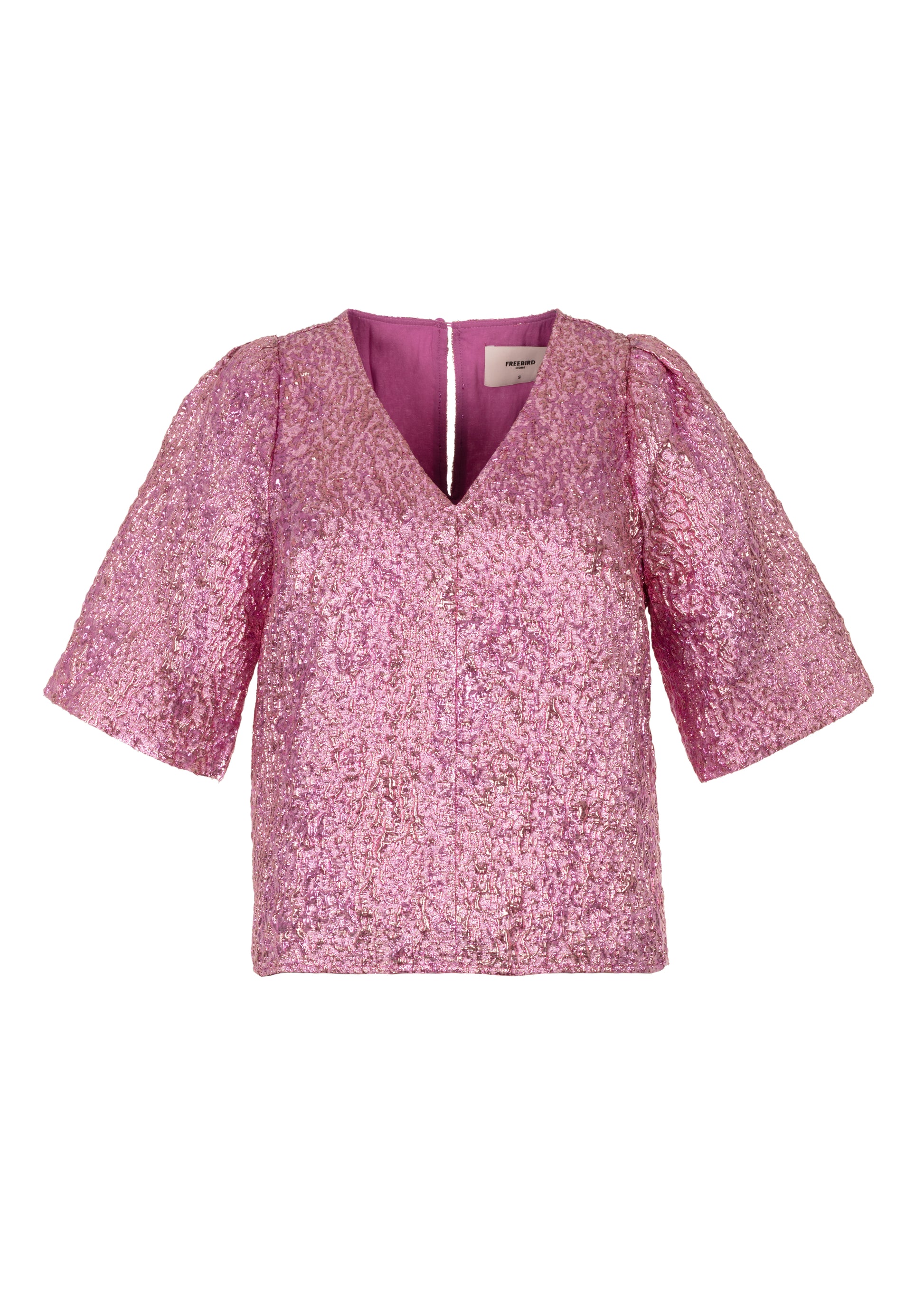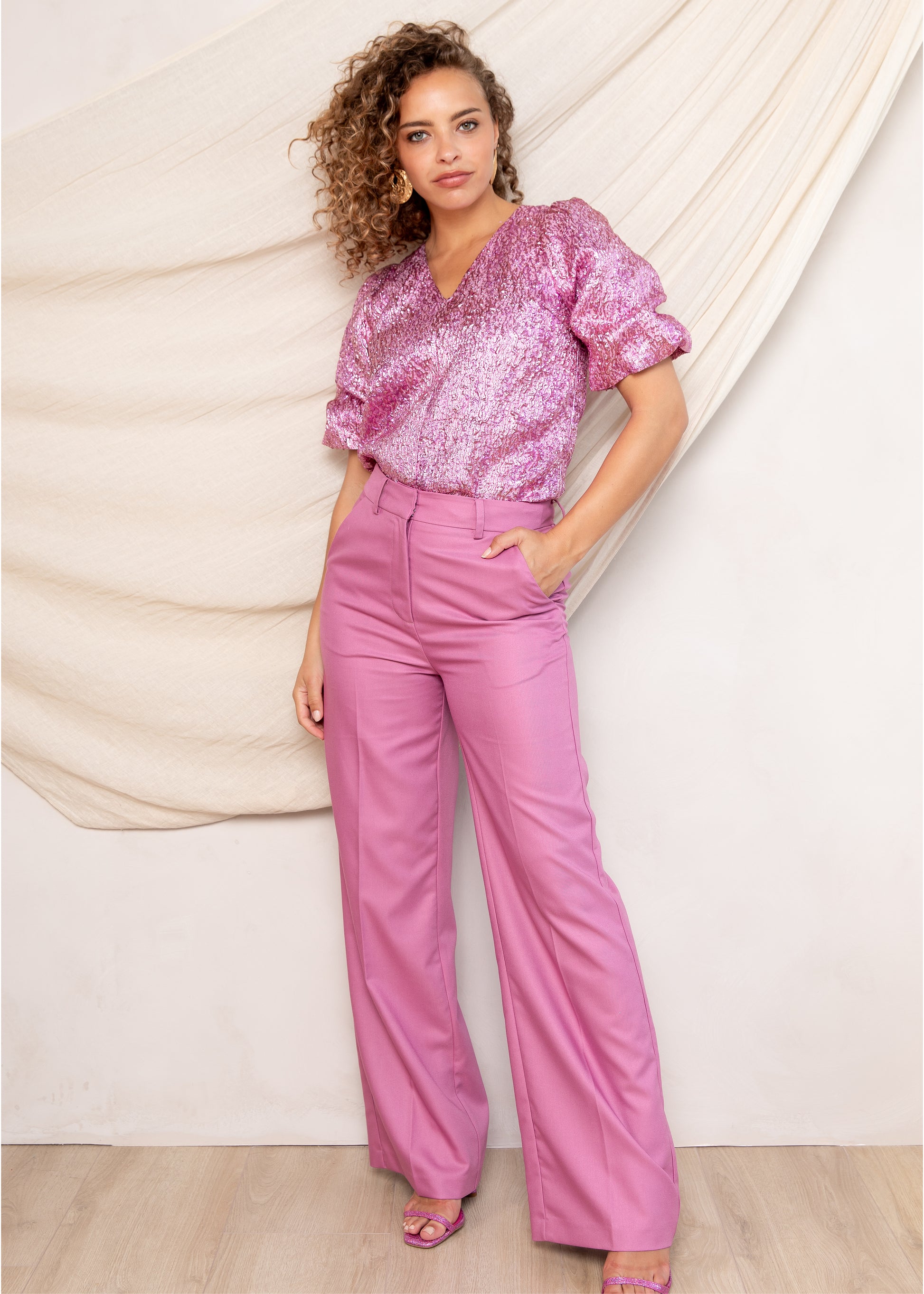 Breng een vleugje glamour in je garderobe met deze opvallende top, perfect voor feestelijke gelegenheden. Gemaakt van een luxe jacquard stof met lurex voor een subtiele glans, straalt deze top elegantie uit. De V-hals en korte pofmouwen zorgen voor een stijlvolle en speelse uitstraling, ideaal om je look compleet te maken.