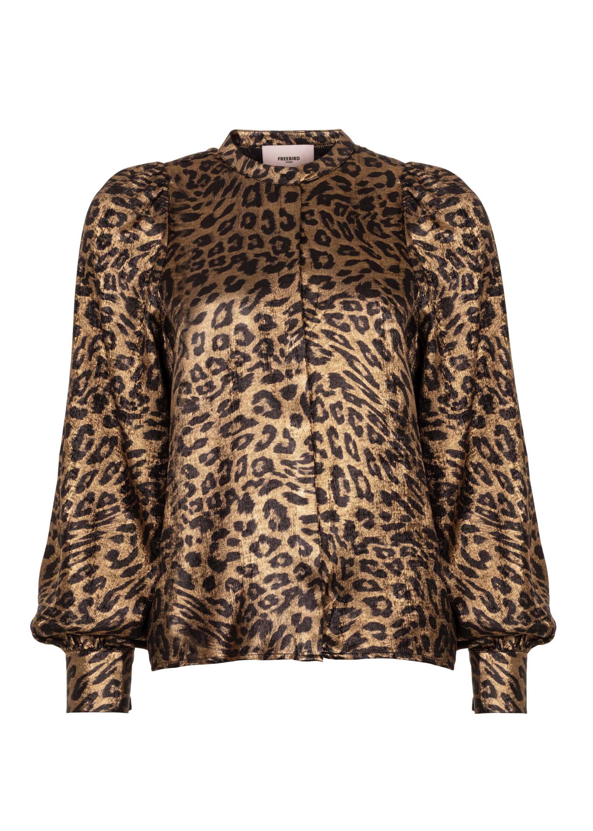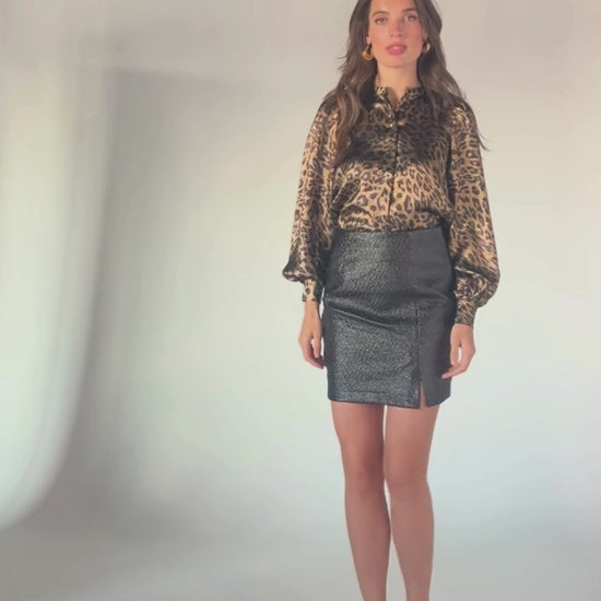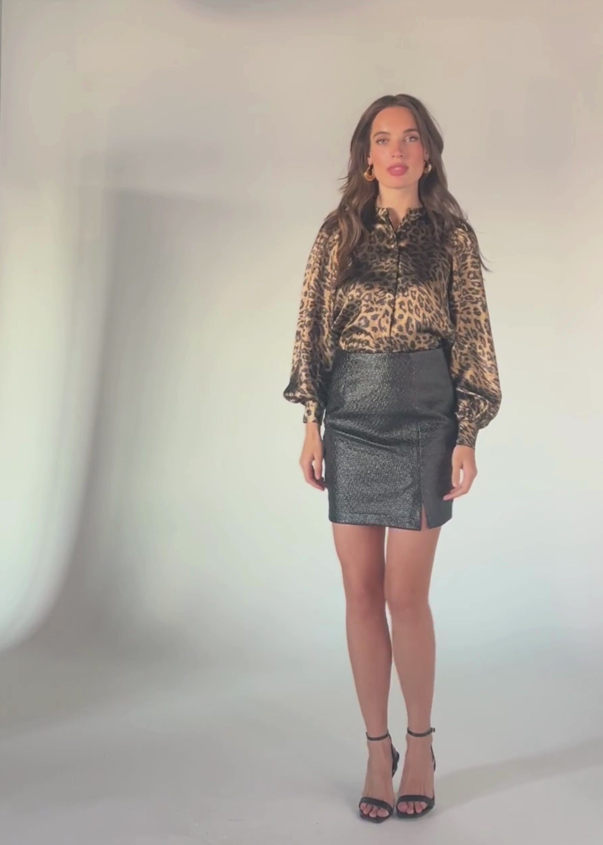 De blouse is uitgevoerd in een glanzende polyester kwaliteit en afgewerkt met een foil panterprint die het ontwerp een krachtige en trendy uitstraling geeft. De lange, volumineuze mouwen zorgen voor extra flair en een speelse balans tussen vrouwelijk en stoer. Perfect om te combineren met een leren broek voor een edgy look of met een rok voor een elegante twist.