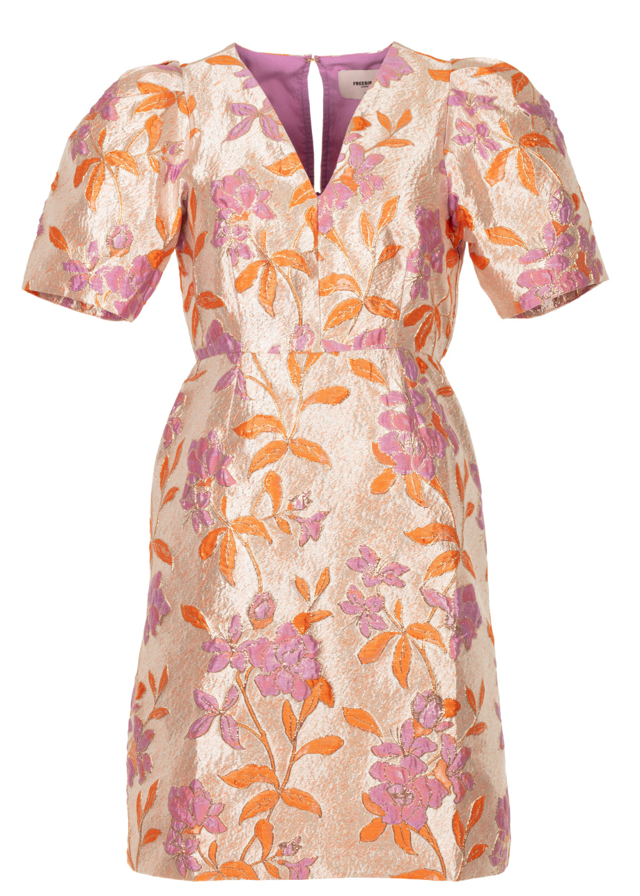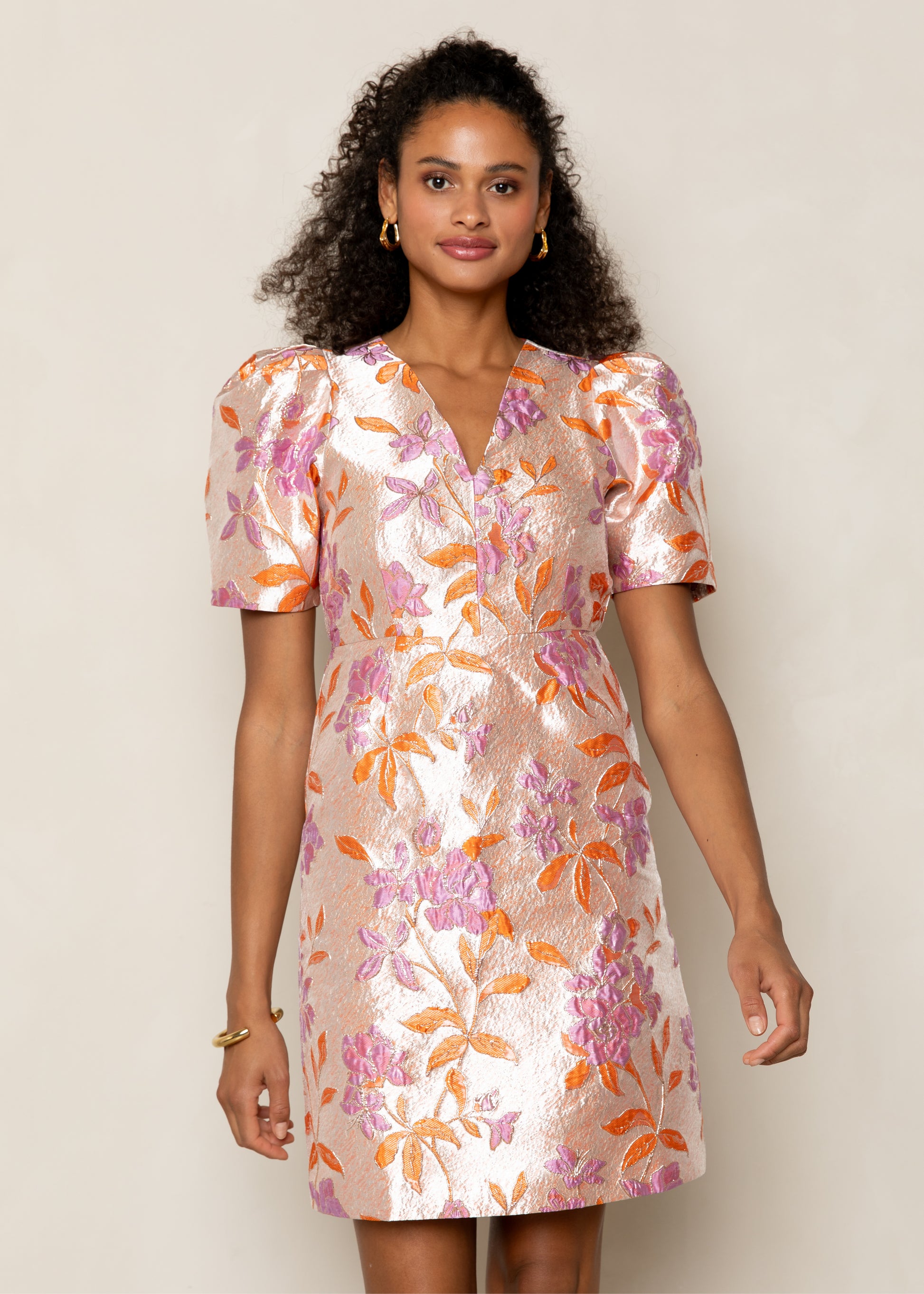 Add a touch of glamour to your festive wardrobe with this stunning short dress. Made from luxurious jacquard fabric with lurex accents, this dress exudes elegance and sophistication. The V-neckline and short puff sleeves add a playful and feminine touch, making it perfect for festive occasions.