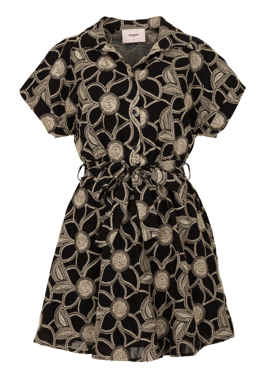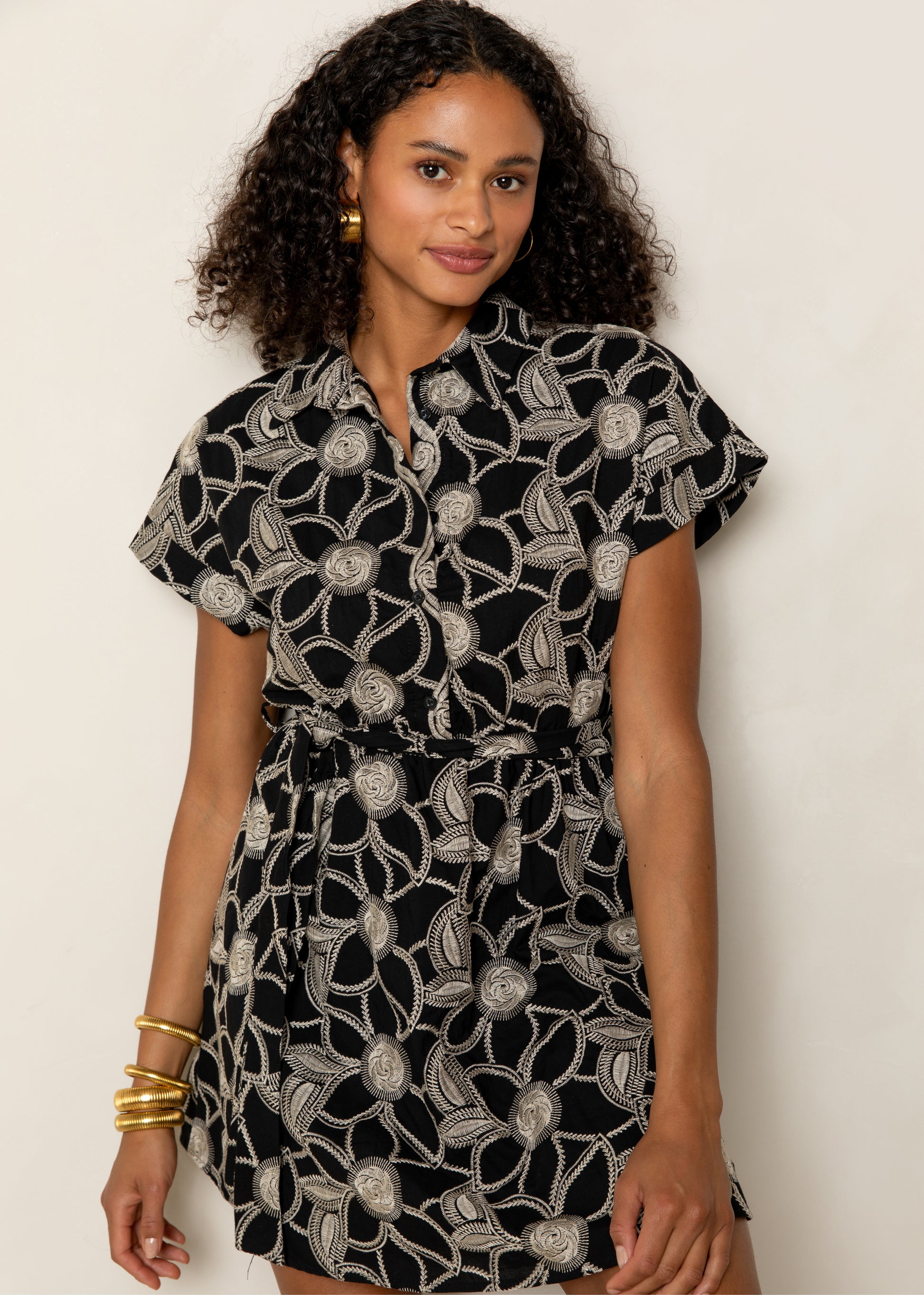 Deze jurk met korte mouwen is gemaakt van een comfortabele katoenen stof met prachtig borduursel, wat zorgt voor een speelse en elegante uitstraling. De knoopsluiting aan de voorkant en de ceintuur in de taille creëren een vrouwelijk en flatterend silhouet. Perfect voor zowel een casual zomerse dag als een feestelijke gelegenheid.