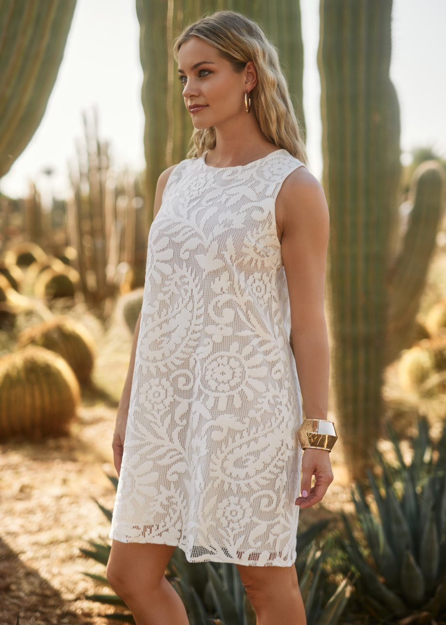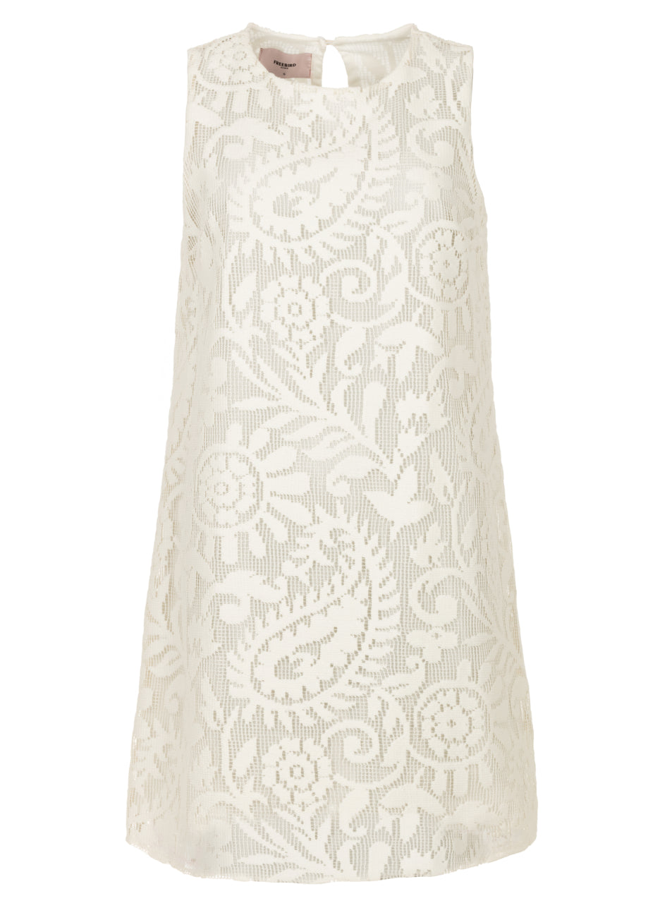 Deze vrouwelijke en luchtige jurk is gemaakt van een katoenen crochet stof in een comfortabele polyesterblend. Het ontwerp is kort en licht uitlopend, wat zorgt voor een flatterende pasvorm en speelse beweging tijdens het dragen. De hoge halslijn geeft de jurk een elegante touch, perfect voor zonnige dagen of zomerse gelegenheden.