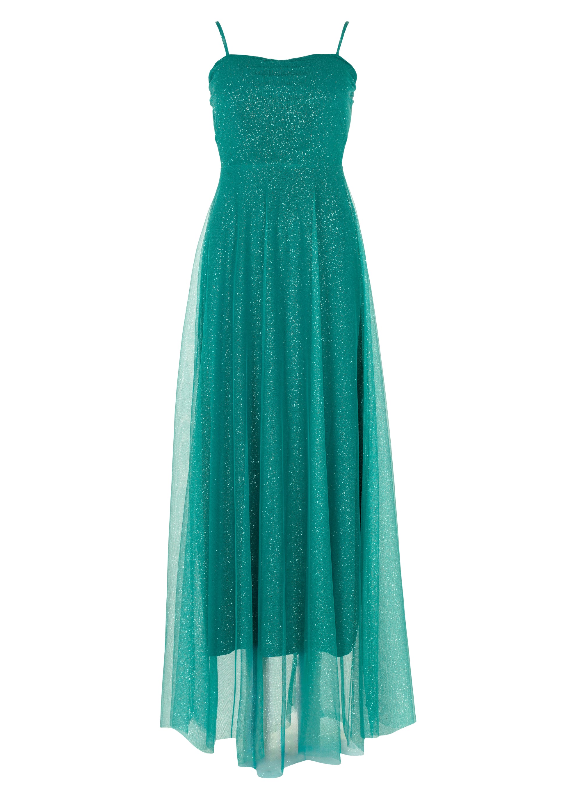 Deze schitterende maxi-jurk straalt pure elegantie uit. Gemaakt van delicate mesh met subtiele glitterdetails, vangt de stof prachtig het licht en creëert een glamoureuze uitstraling. De jurk heeft verstelbare spaghettibandjes en een voorgevormde cup voor een flatterende pasvorm.