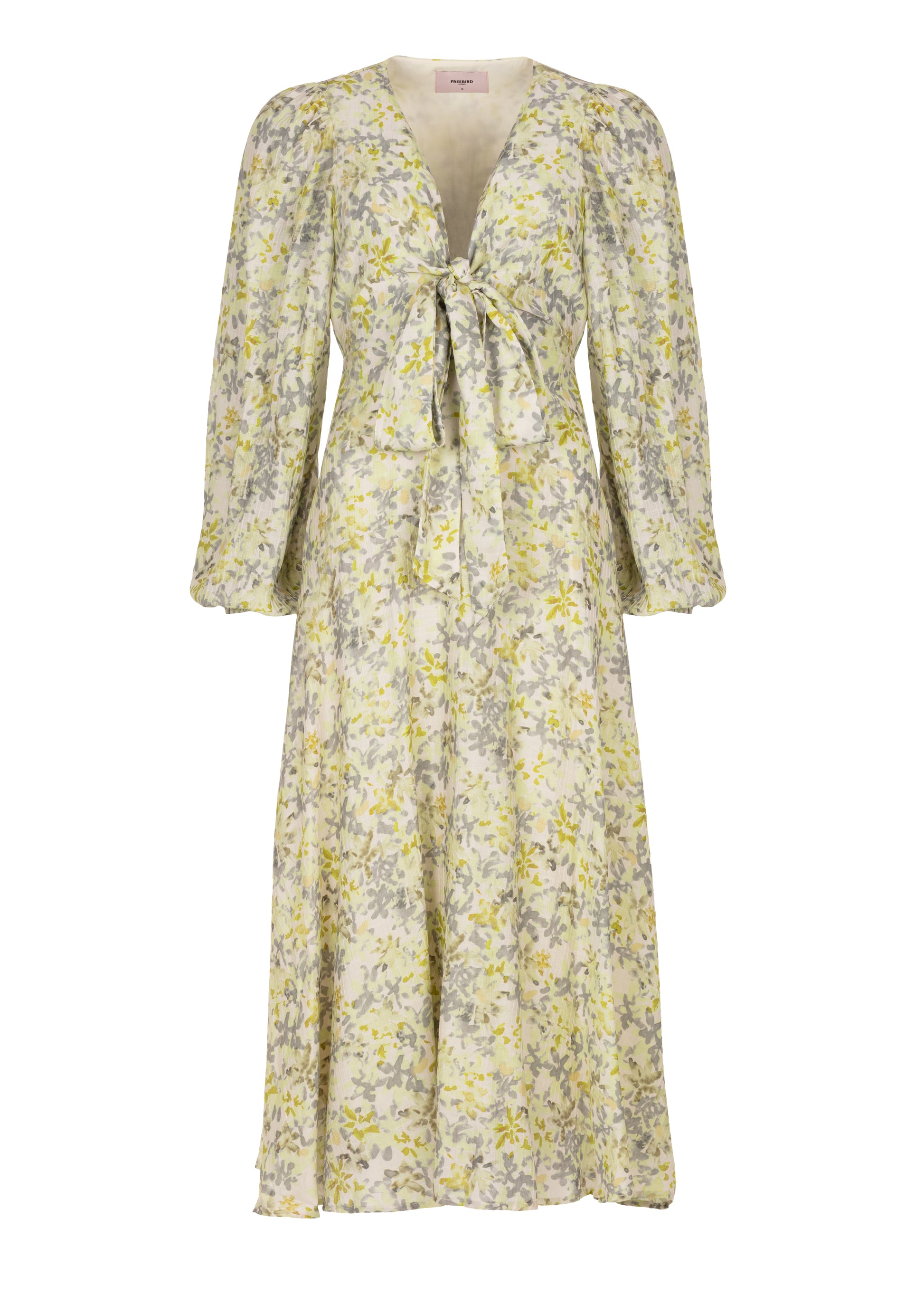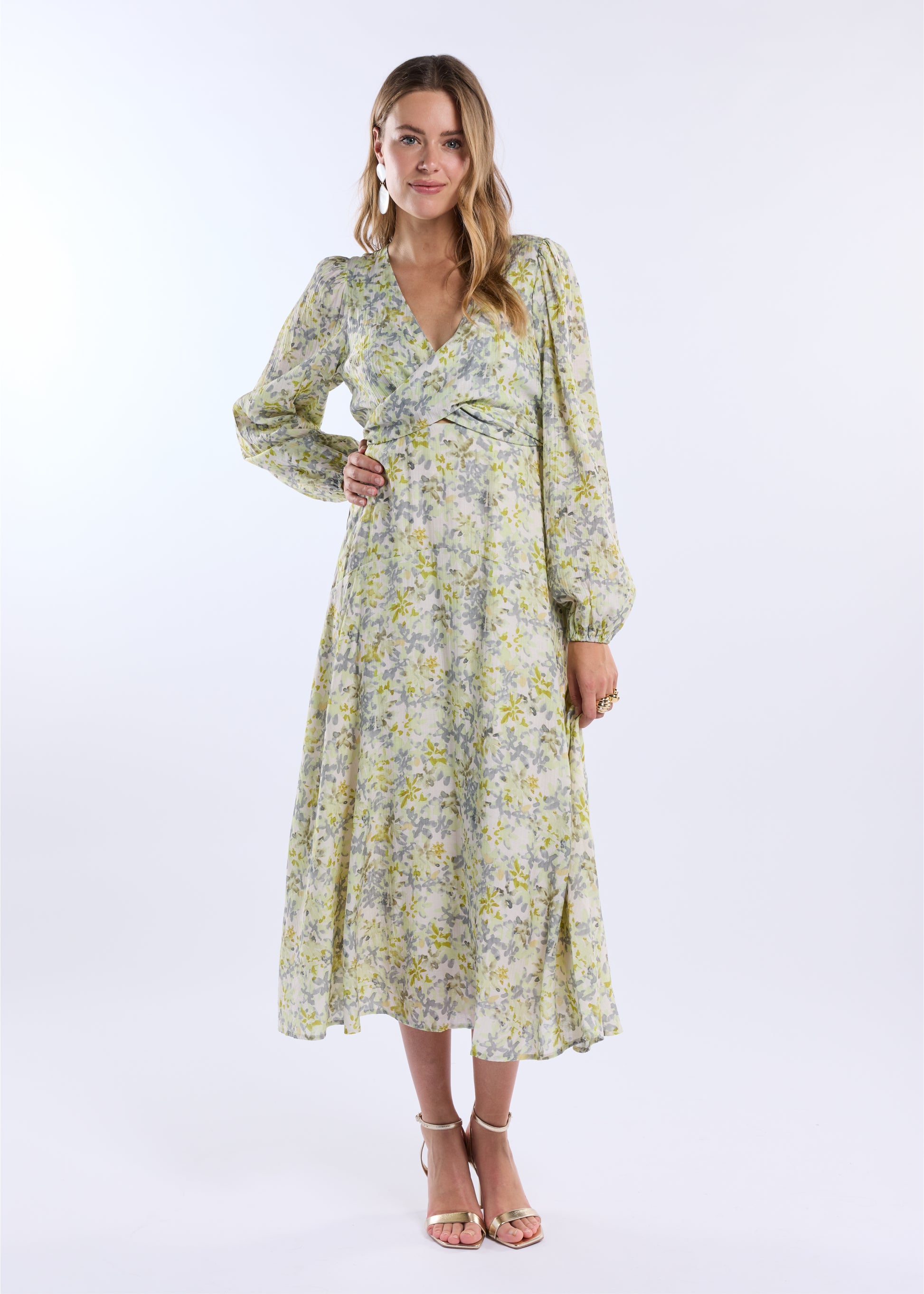 Deze jurk is uitgevoerd in een soepel geweven stof met een verfijnd bloemenpatroon. Het overslagdetail aan de voorzijde creëert een vrouwelijke V-hals, terwijl het strikdetail aan de achterzijde de taille subtiel accentueert. De vloeiende stof en elegante belijning zorgen voor een tijdloos en flatterend silhouet, geschikt voor zowel dagelijkse momenten als speciale gelegenheden.