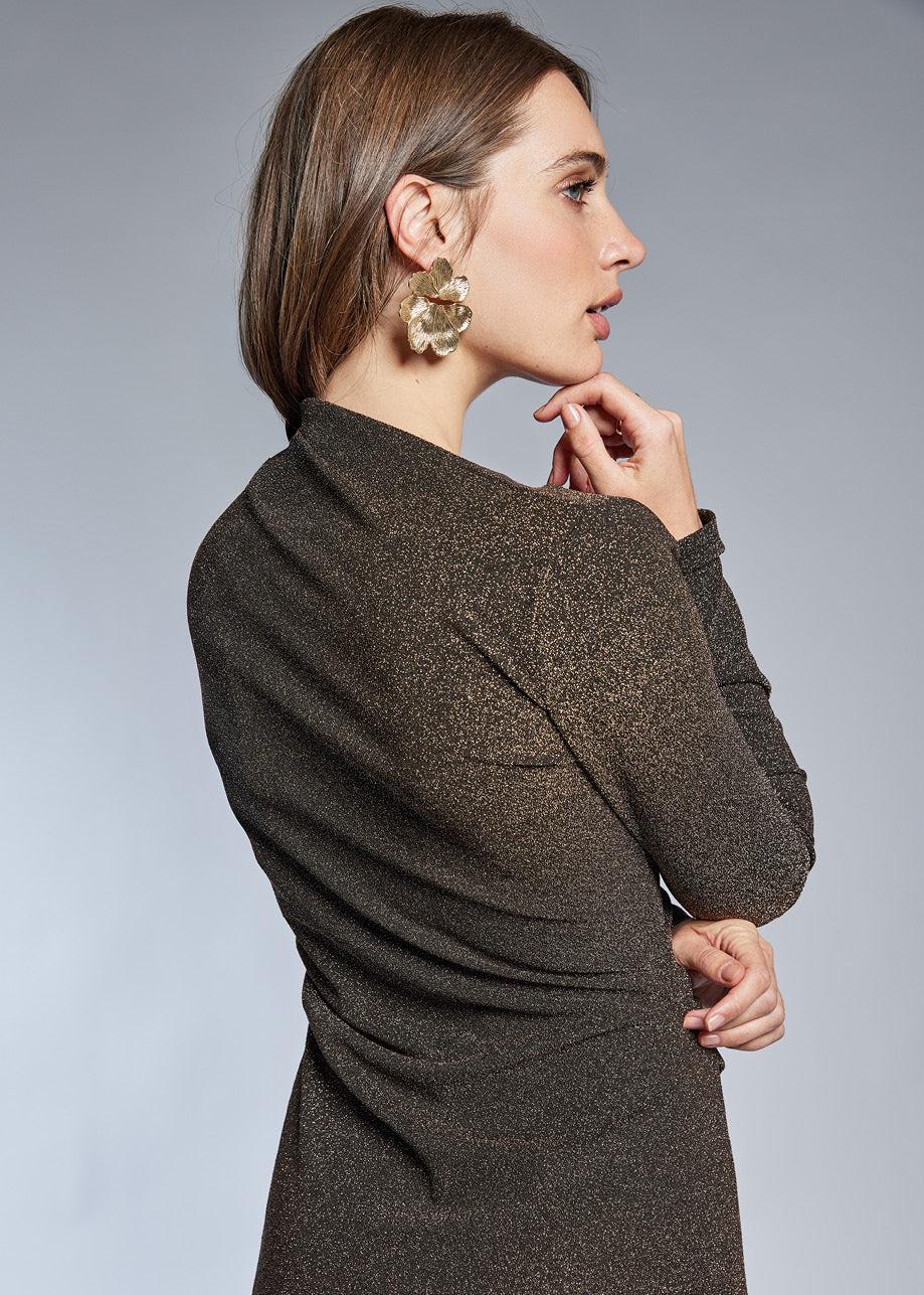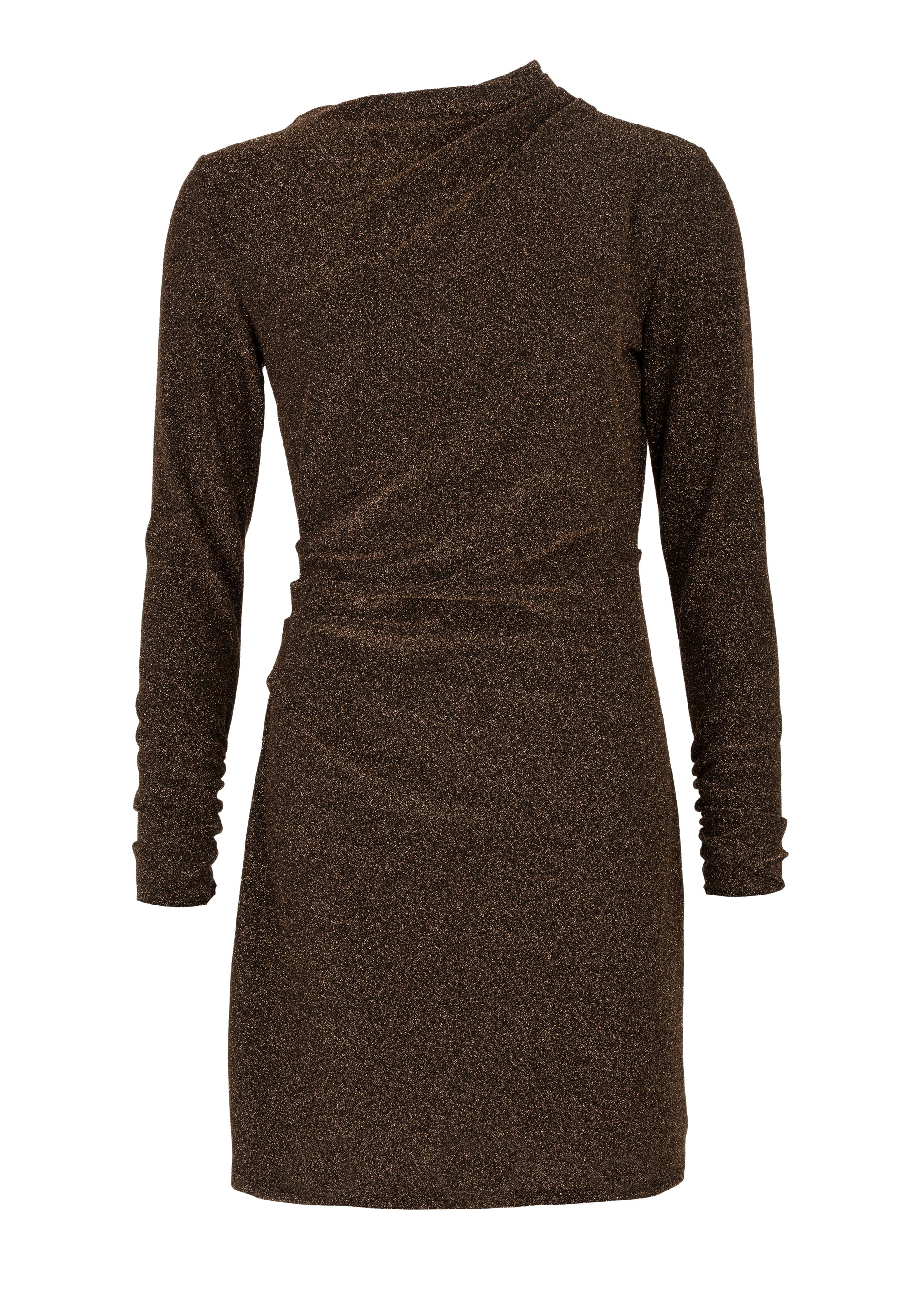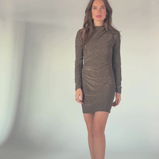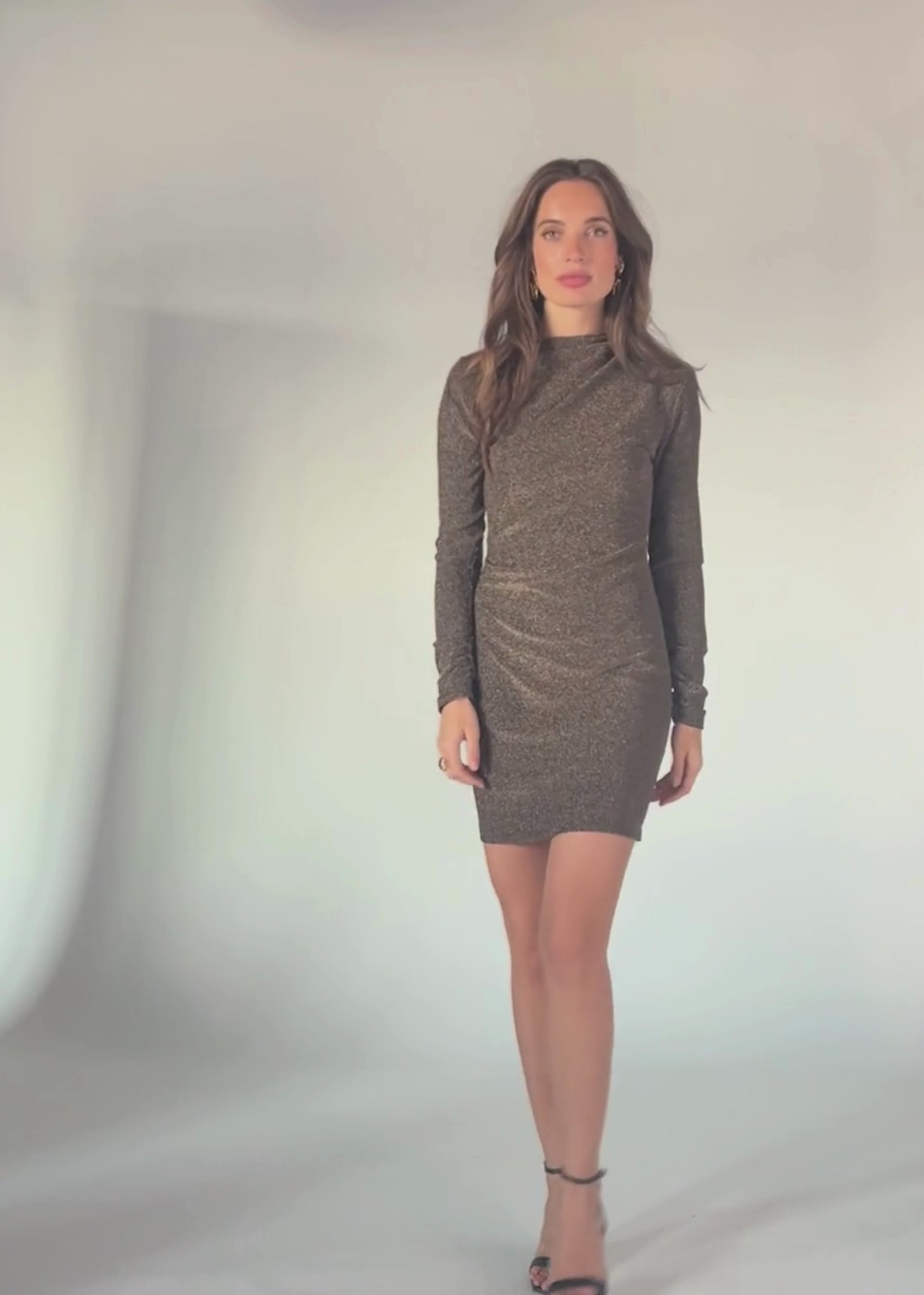 De jurk is gemaakt van een comfortabele jersey kwaliteit met stretch, waardoor hij mooi aansluit en prettig draagt. De fijne glitterdraad geeft het ontwerp een feestelijke touch zonder te overdrijven. Dankzij de korte lengte en de flatterende pasvorm is dit de perfecte jurk om je look een moderne en elegante uitstraling te geven.