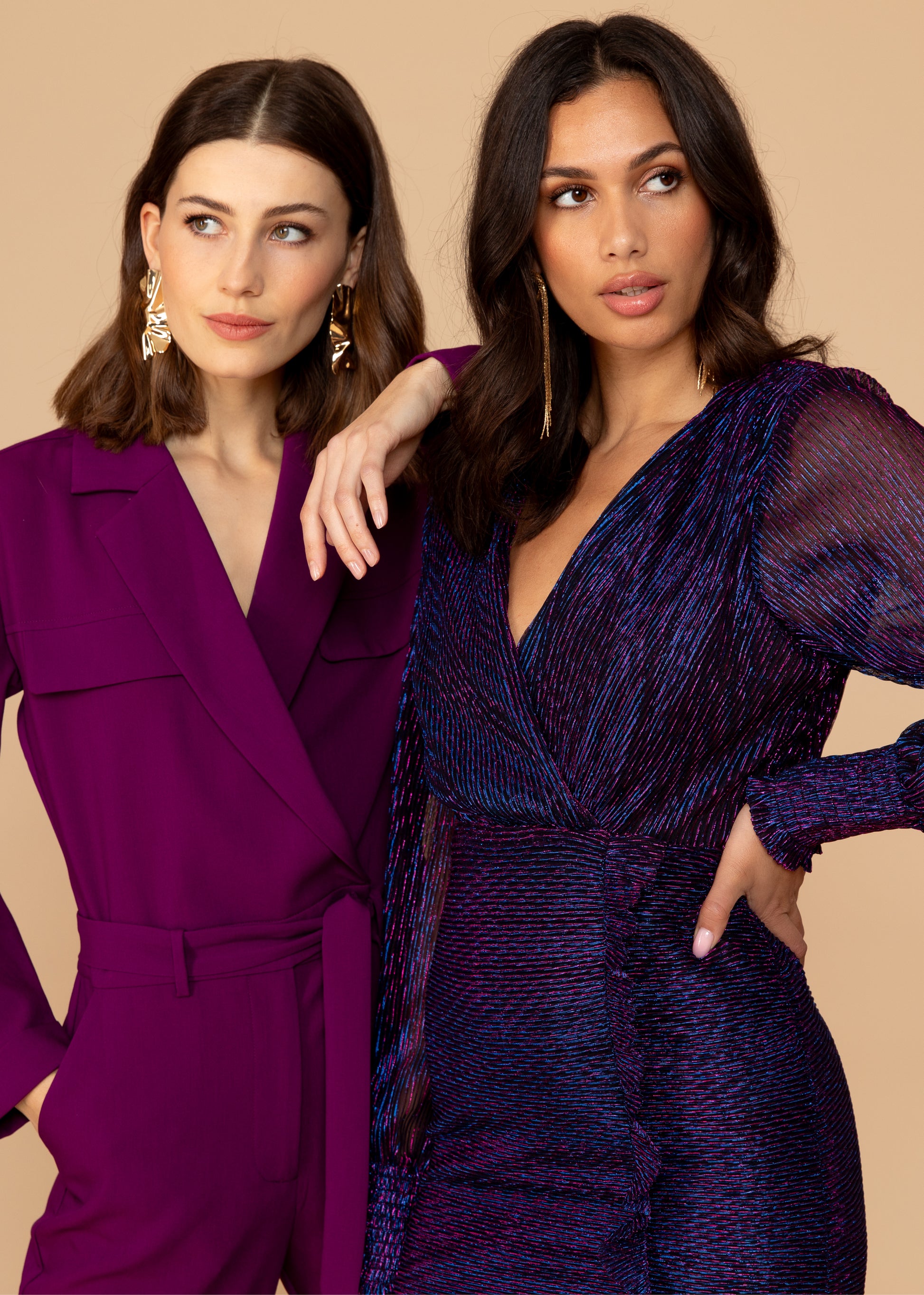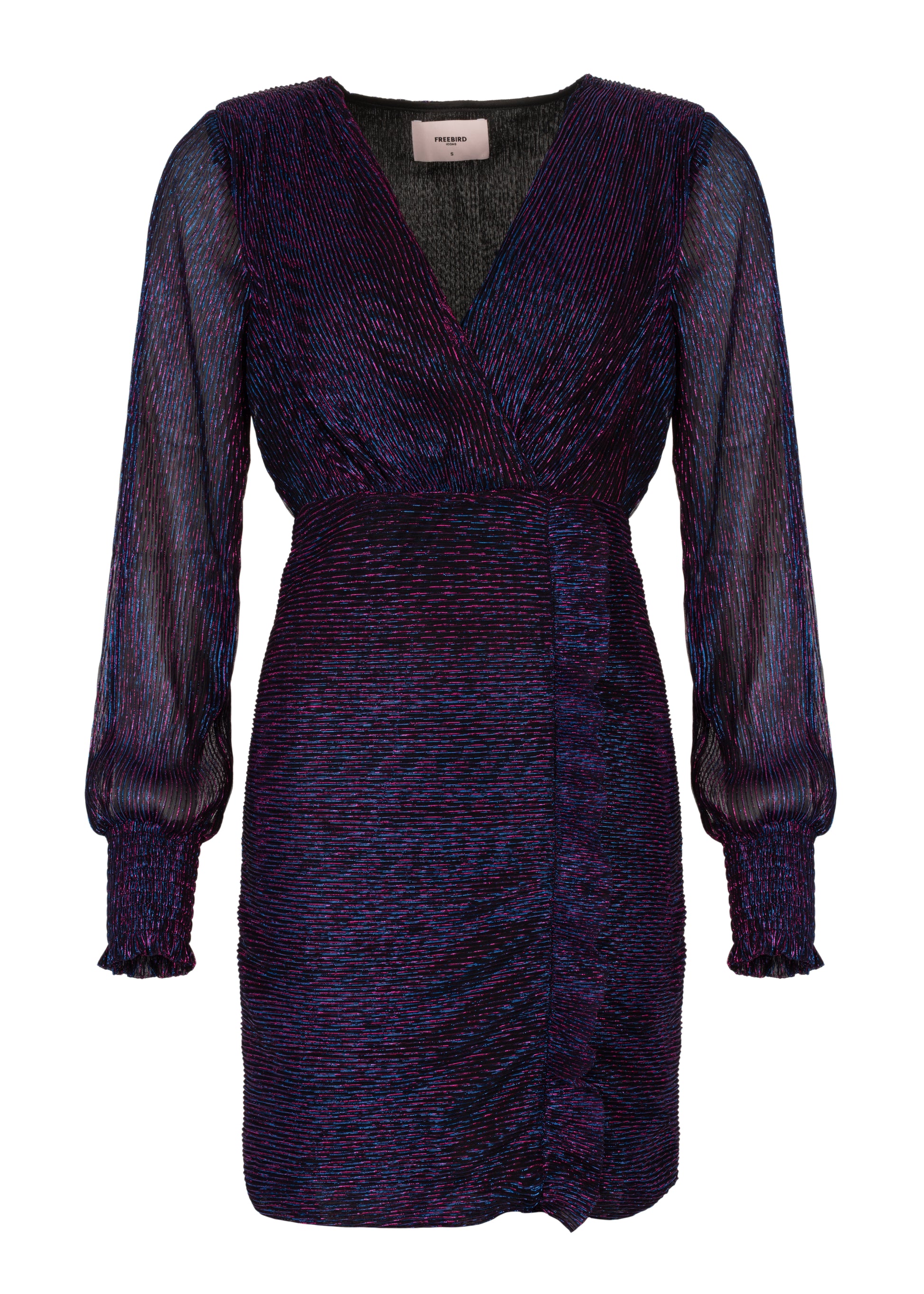 Deze feestelijke jurk is gemaakt van een glanzende plissé stof met lurex, wat zorgt voor een subtiele schittering. De jurk heeft lange mouwen en een aangesloten pasvorm.