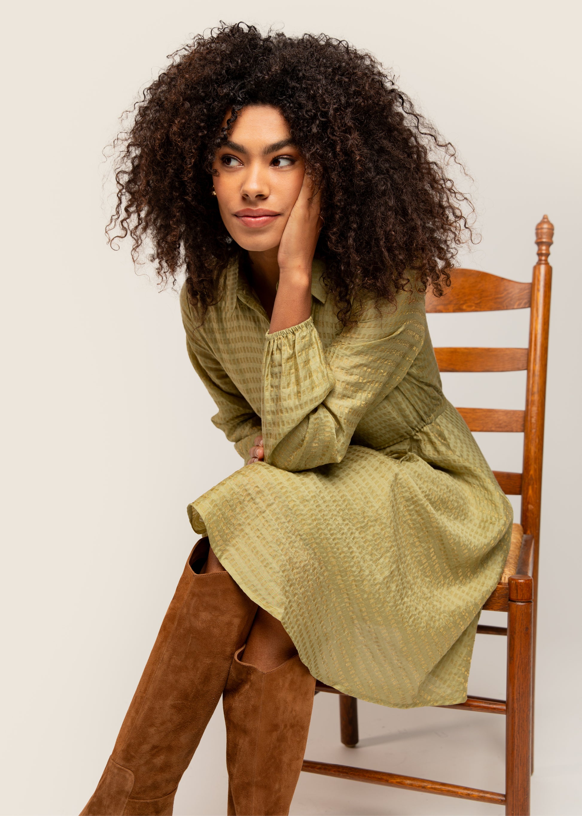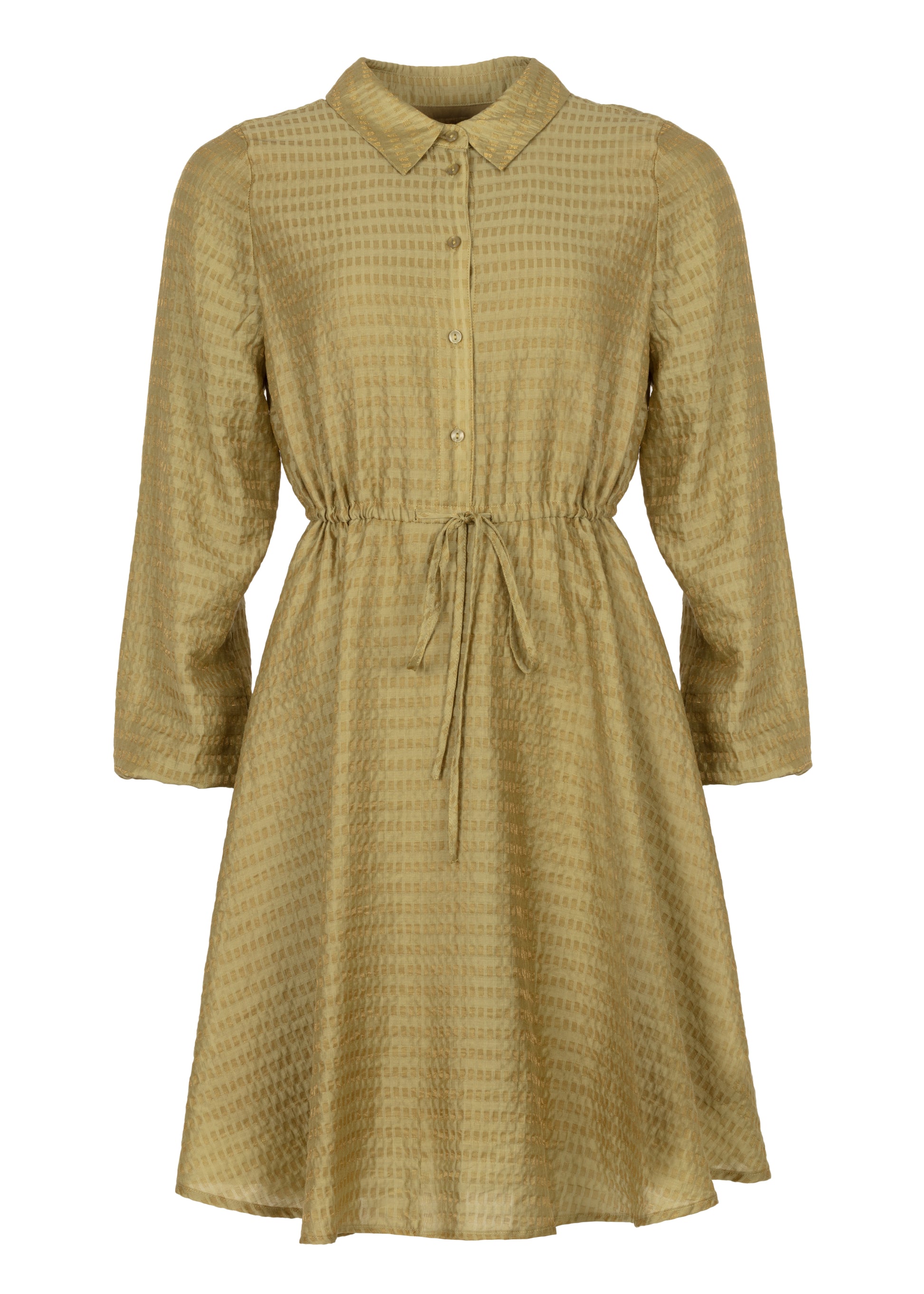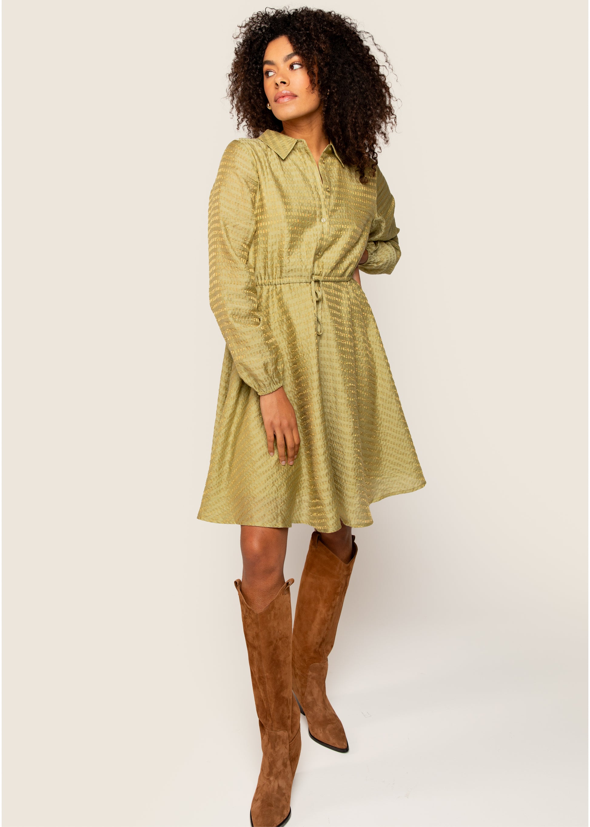 Deze elegante mini jurk in een zachte groene tint biedt een verfijnde en stijlvolle uitstraling. Gemaakt van lyocell stof met lurex detail, voegt de jurk een subtiele glans toe aan je look. De jurk heeft lange mouwen en een strikdetail in de taille voor een vrouwelijke en flatterende pasvorm.