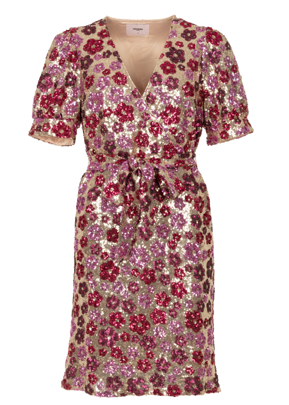 Deze feestelijke jurk is een echte eyecatcher dankzij de sprankelende sequins op een luchtige meshbasis. De jurk heeft een flatterende V-hals met een elegant overslagdetail en korte mouwen voor een vrouwelijke uitstraling. De ceintuur in de taille benadrukt het silhouet en zorgt voor een mooie pasvorm. Perfect voor speciale gelegenheden waarbij je wilt stralen.