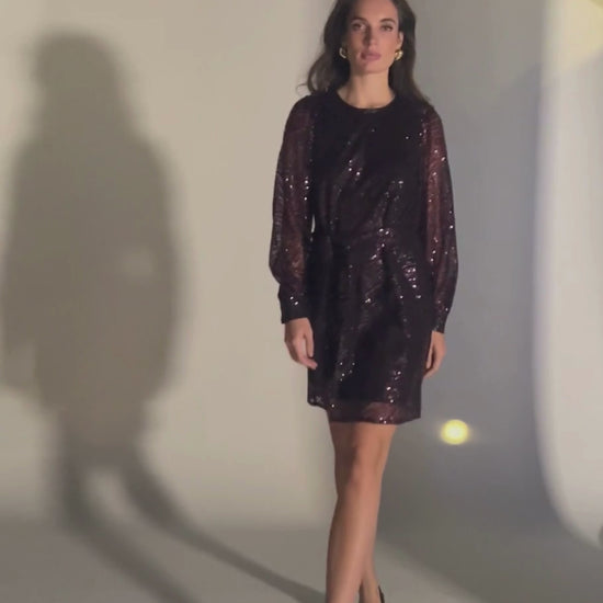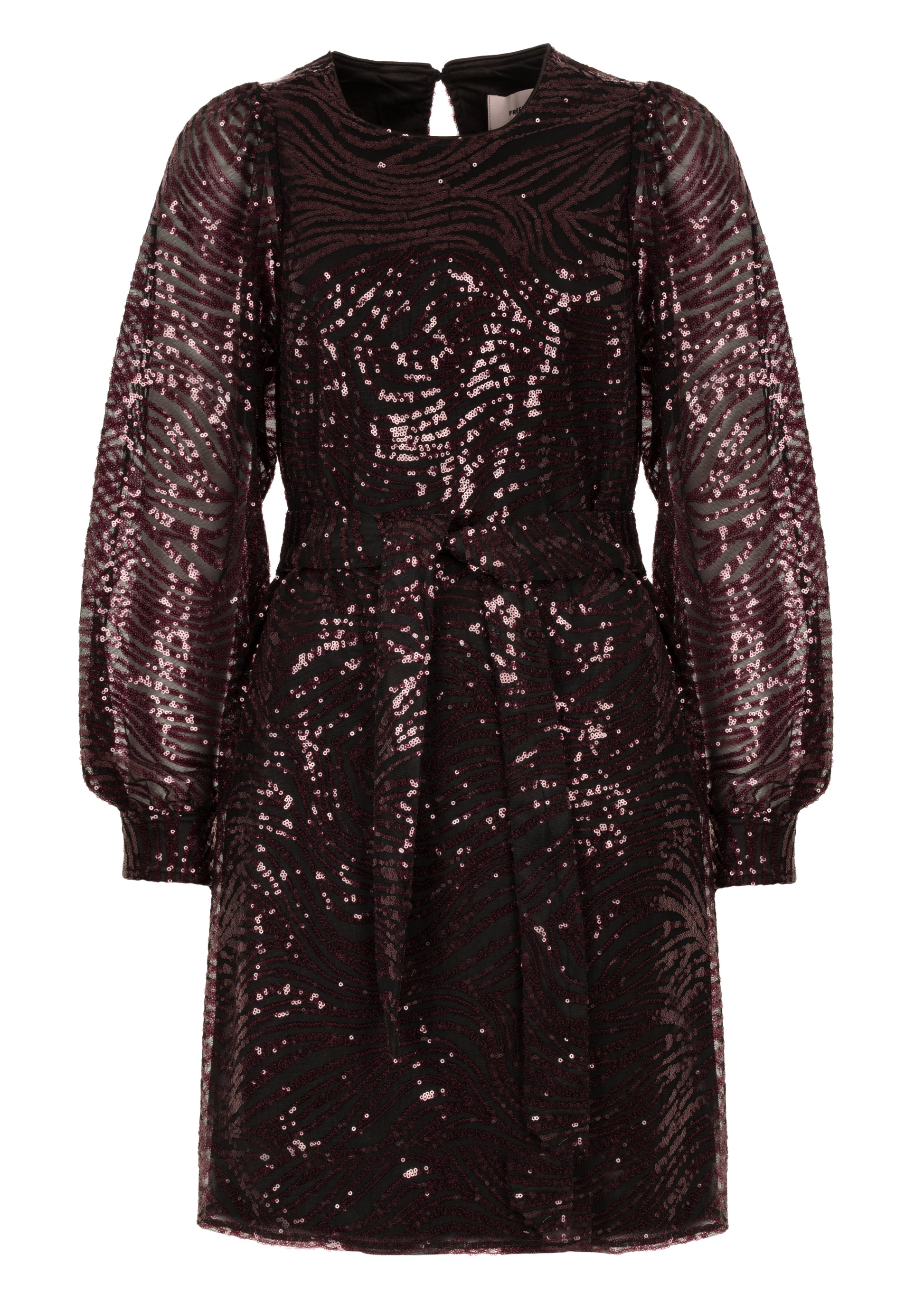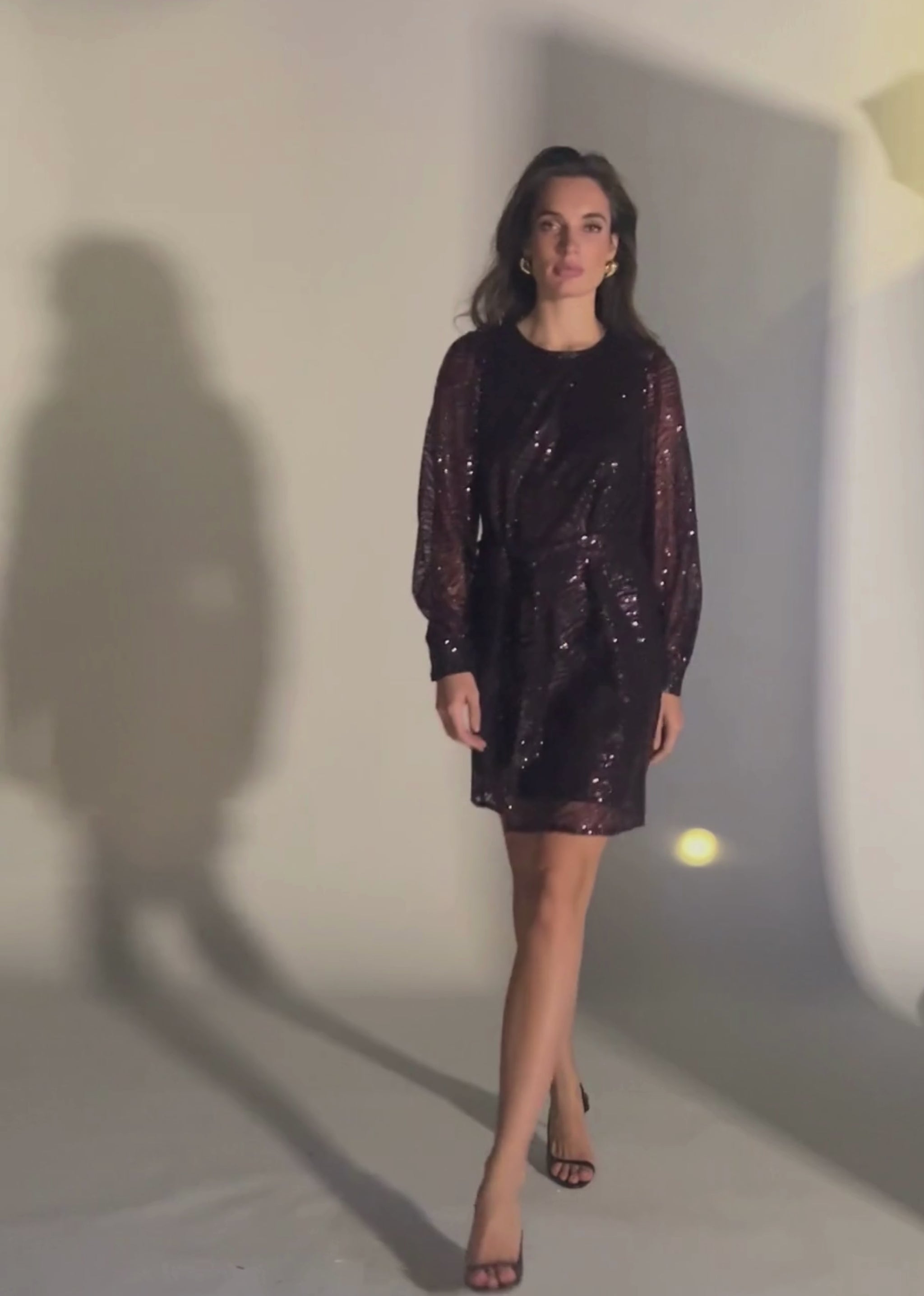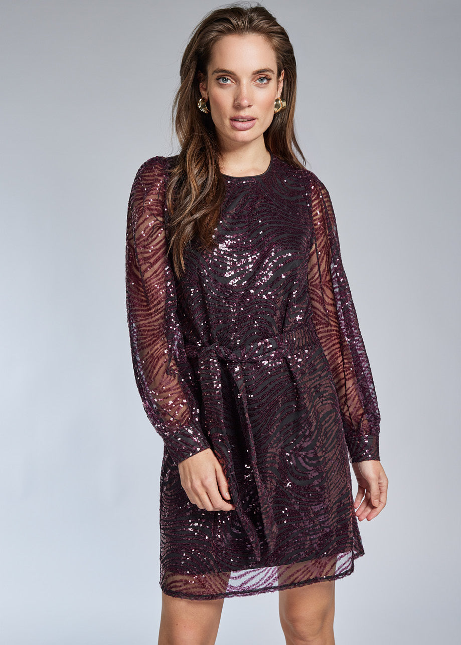 De jurk is uitgevoerd in een transparante mesh kwaliteit, verrijkt met een all-over paillettenpatroon dat zorgt voor een schitterend en feestelijk effect. Het rechte model wordt geaccentueerd door een tailleband die je zelf kunt strikken voor een vrouwelijke pasvorm. Met de lange mouwen en subtiele glans is dit de perfecte jurk voor feestelijke gelegenheden en avondlooks.