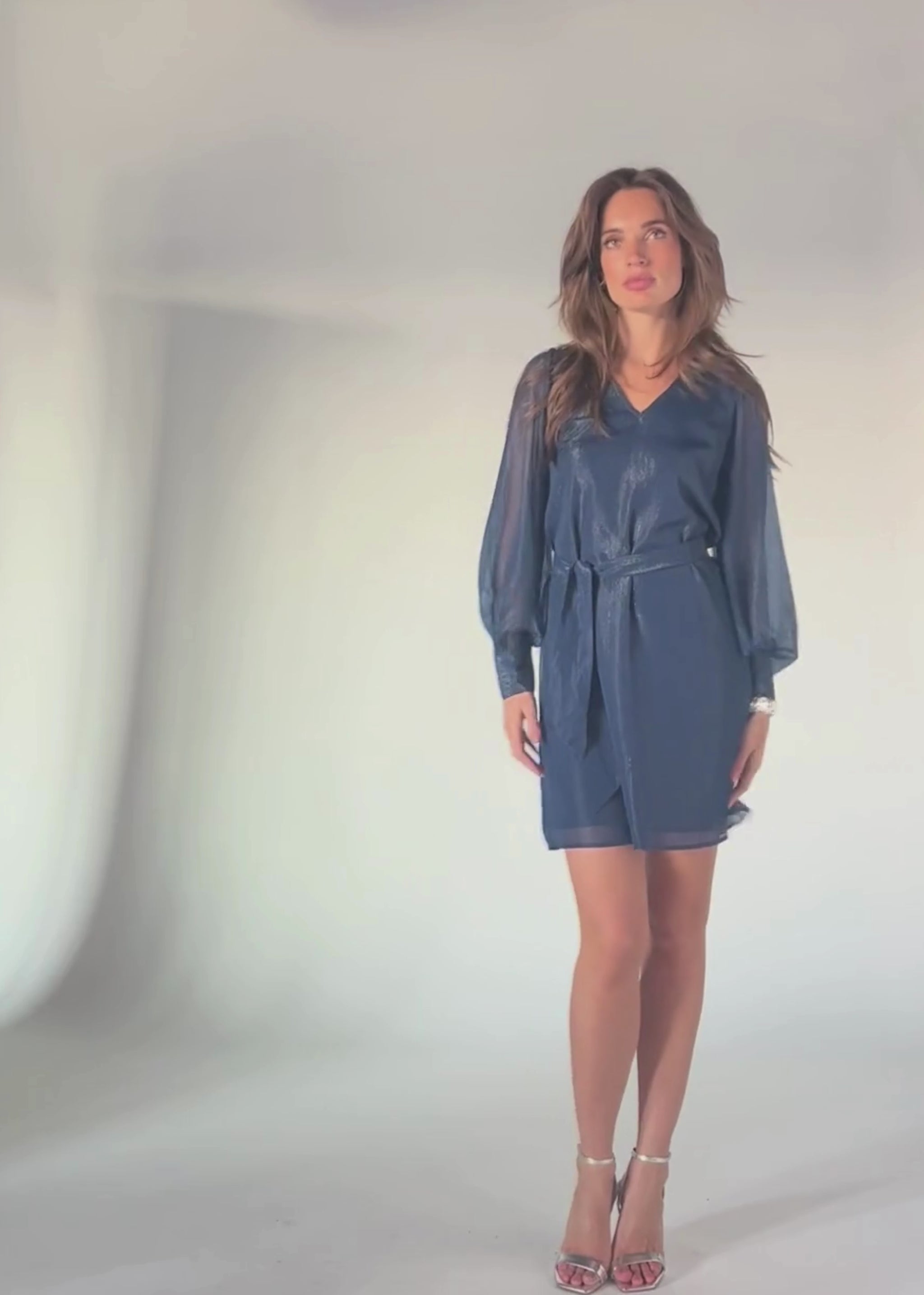 De jurk is gemaakt van een luchtige woven kwaliteit met zilverkleurige lurexstrepen die subtiel schitteren bij iedere beweging. Het rechte model geeft een moderne uitstraling, terwijl de tailleband die je zelf kunt strikken zorgt voor een vrouwelijk accent en een flatterende pasvorm. De lange mouwen met manchetten maken het ontwerp helemaal af. Perfect voor zowel een diner als een feestelijke gelegenheid.