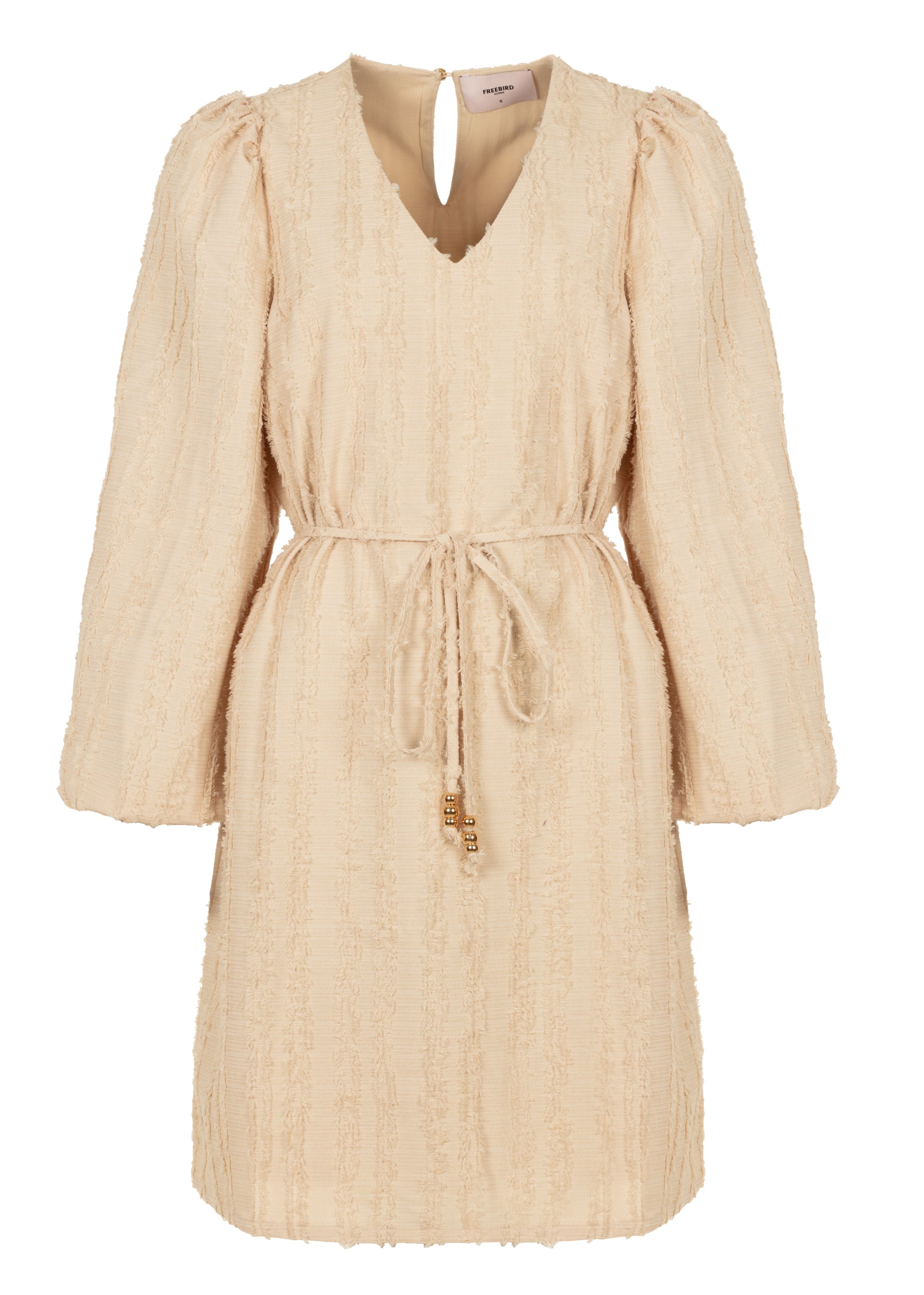 De ballonmouwen geven het silhouet een eigentijdse en vrouwelijke uitstraling, terwijl de bijpassende ceintuur in dezelfde stof je taille elegant accentueert. Of je haar nu combineert met hakken of laarsjes, deze jurk is perfect voor een stijlvolle dag of een feestelijk moment.