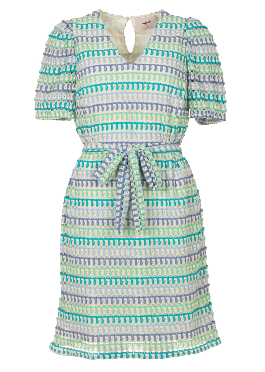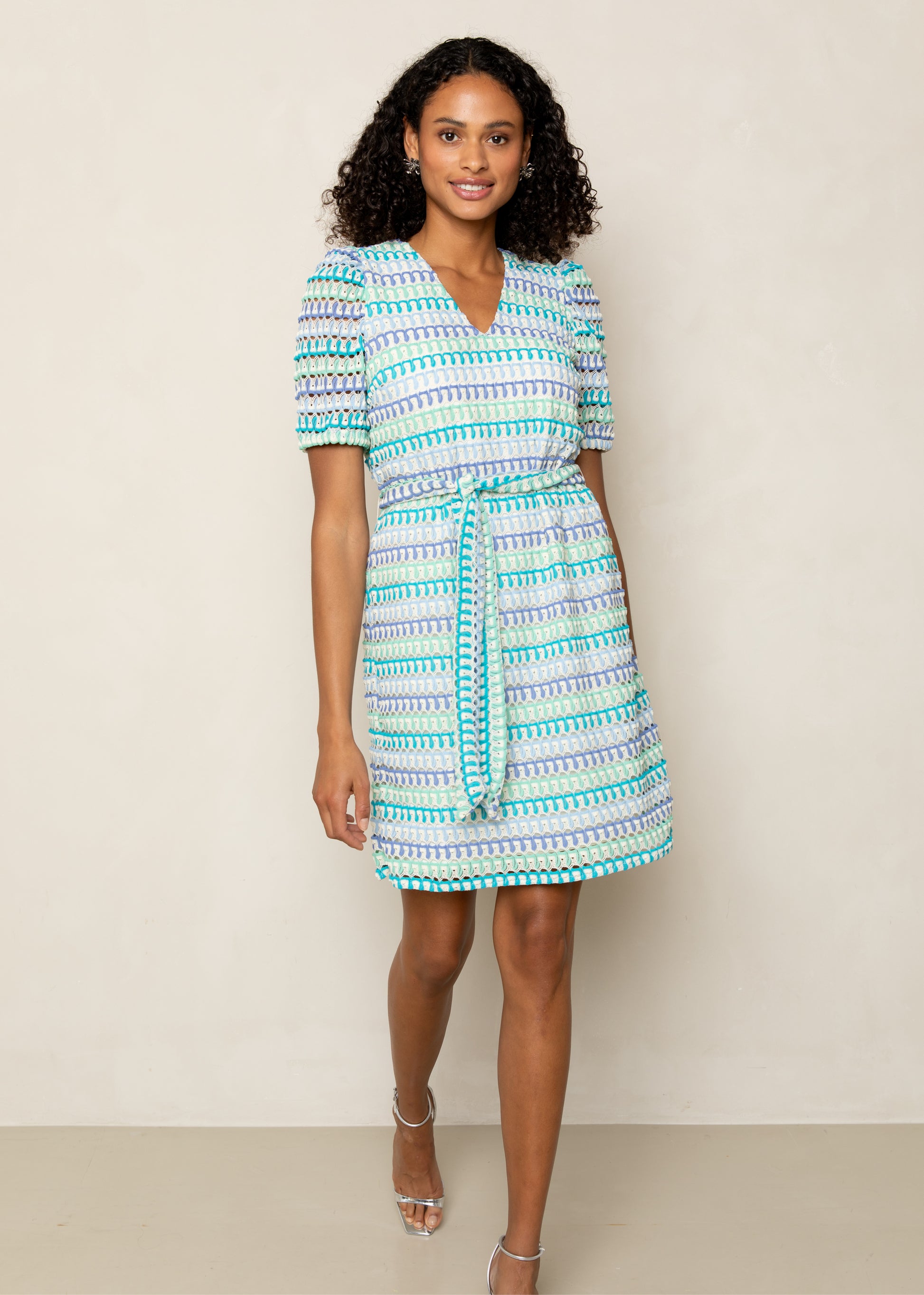 Deze zomerse korte jurk is gemaakt van een gebreide crochet kwaliteit met een speels streepdessin, wat zorgt voor een luchtige en stijlvolle uitstraling. De jurk is voorzien van een flatterende V-hals, korte pofmouwen met elastische cuffs en een strikceintuur in de taille die het vrouwelijke silhouet mooi benadrukt. Ideaal voor een casual dagje uit of een zomerse gelegenheid.