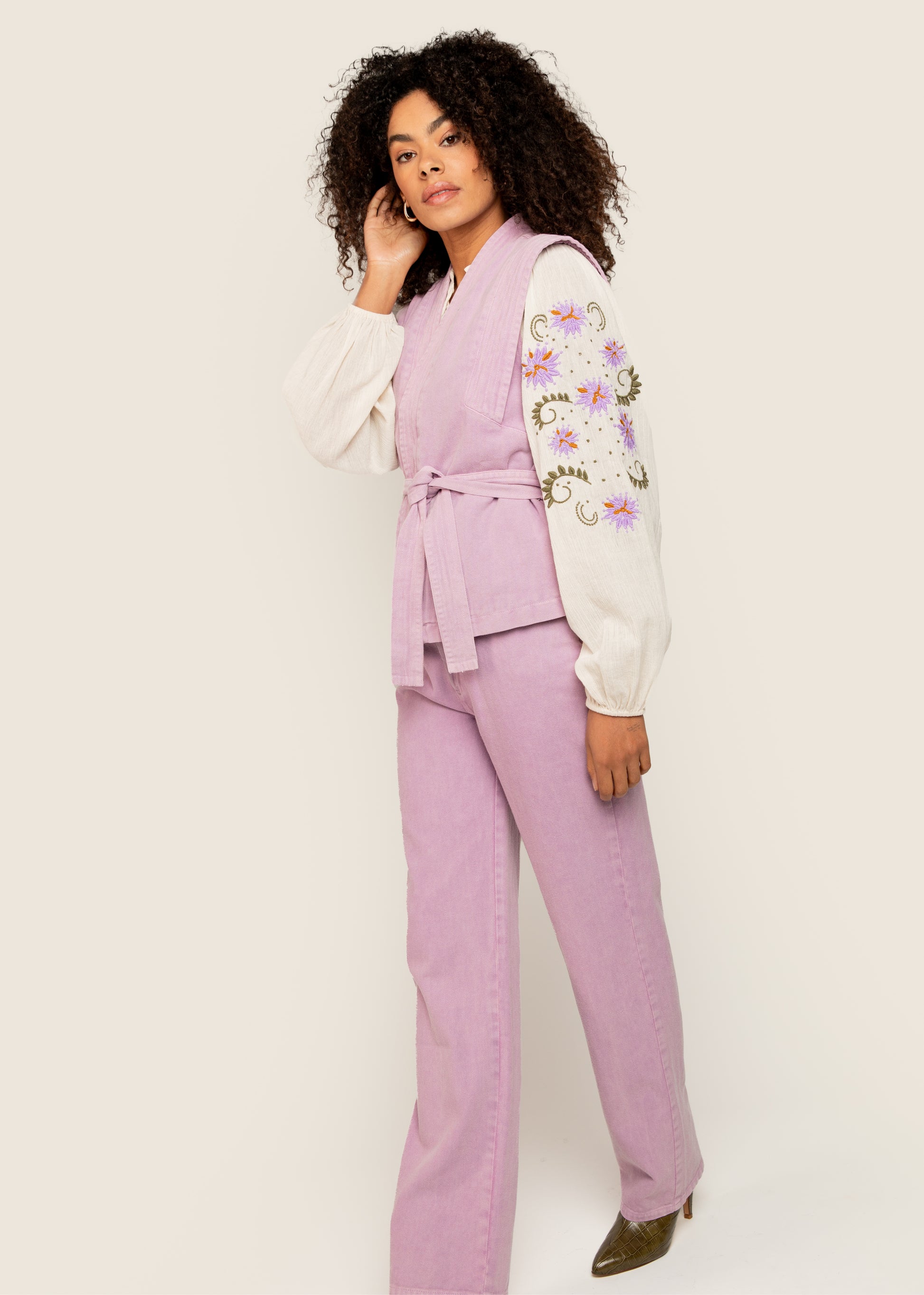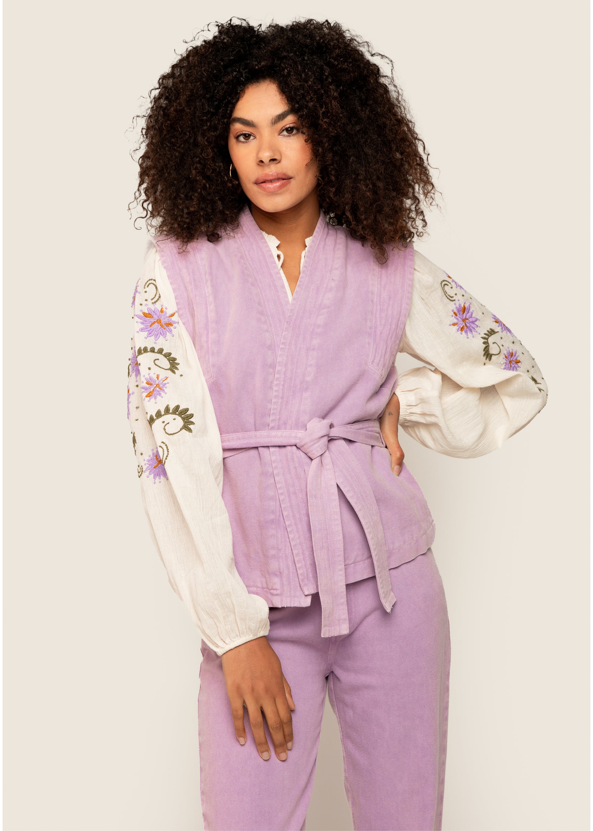 Stijlvol licht paars gilet met een strikceintuur voor een flatterende pasvorm. Perfect voor een casual dagje uit of een ontspannen avond.