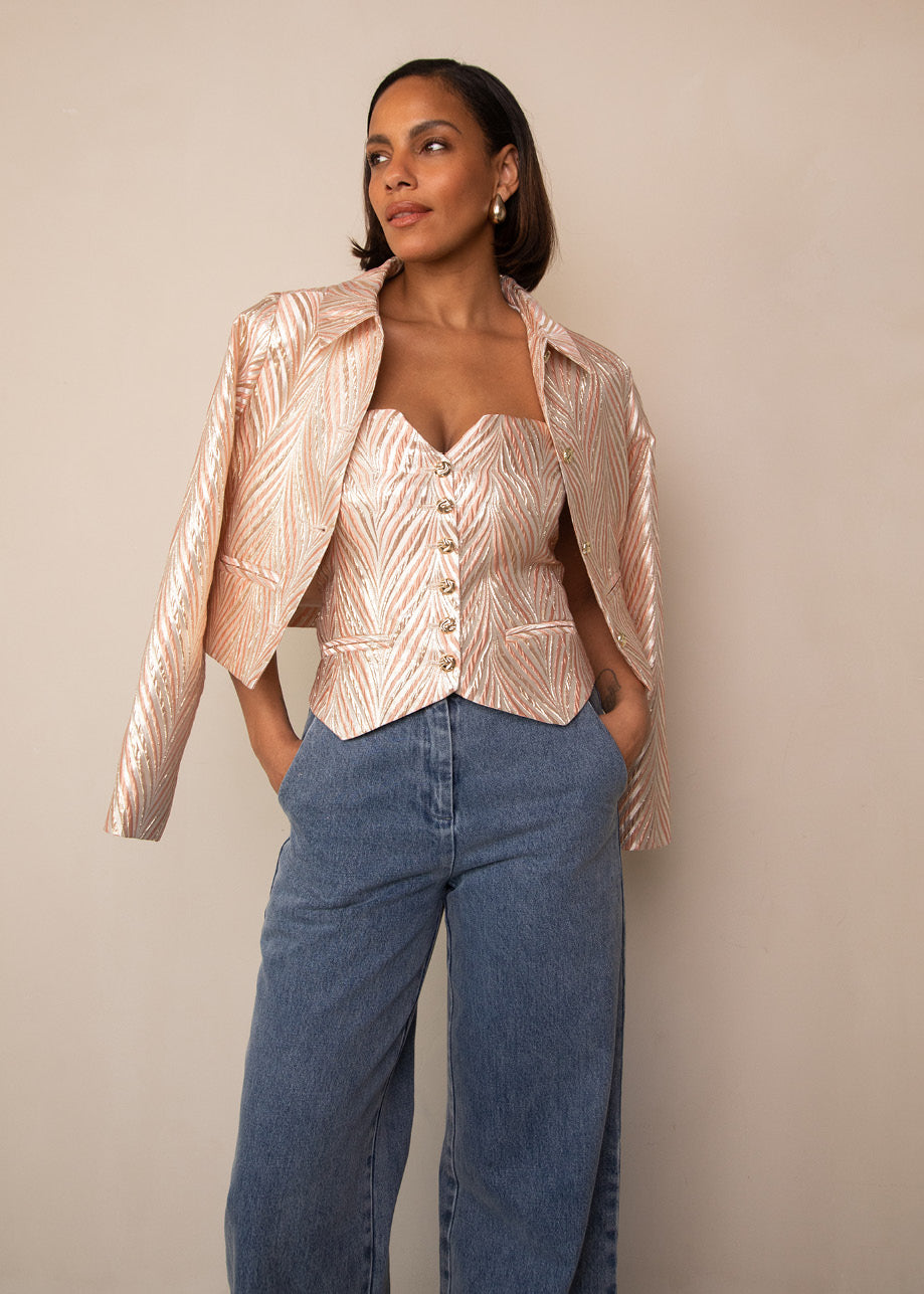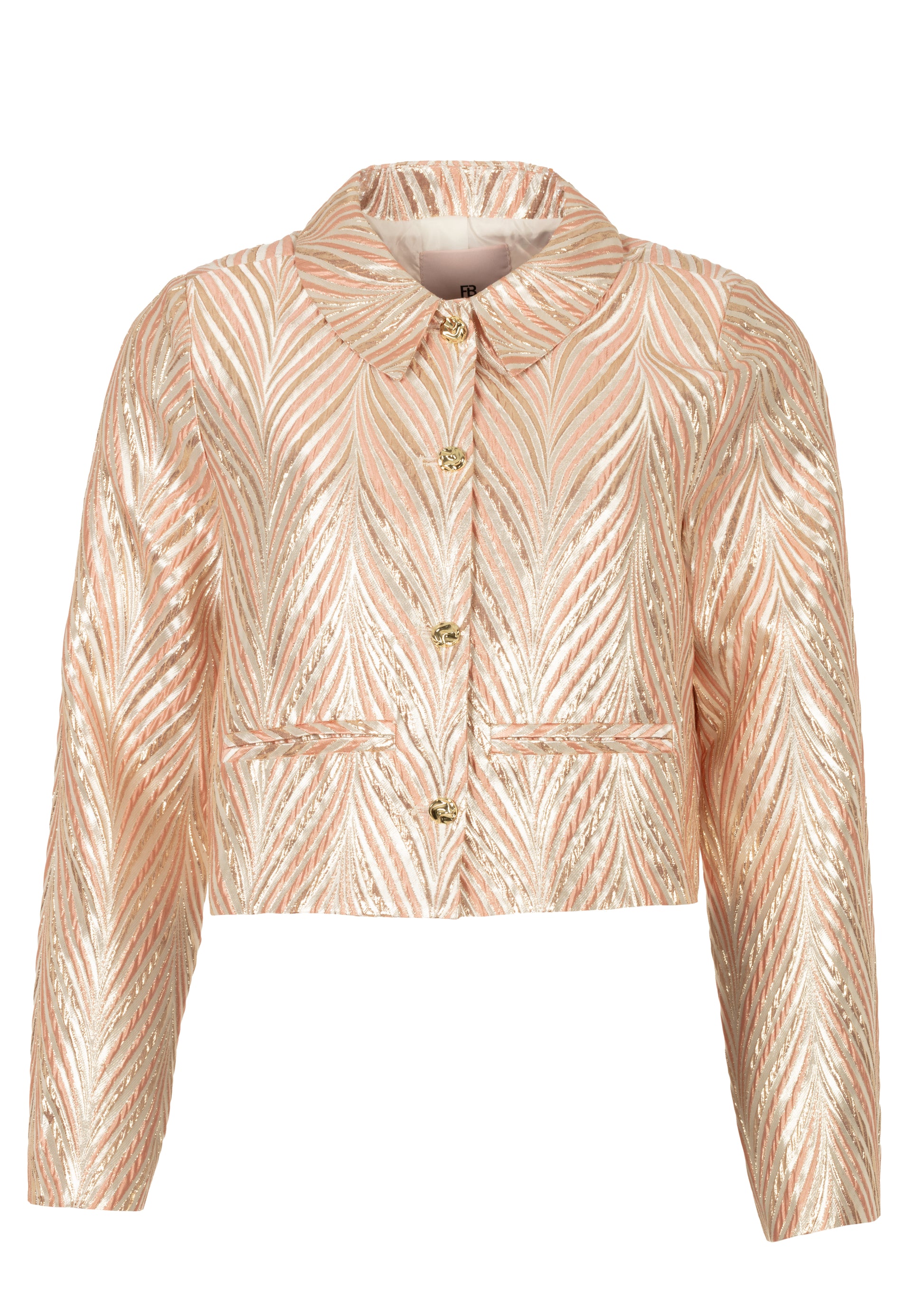 Het Jasmijn Jacket is een opvallend en verfijnd item, uitgevoerd in een rijke jacquardstof met subtiele lurexglans. Het korte silhouet en de lange mouwen geven het jasje een elegante, moderne uitstraling, perfect voor zowel feestelijke gelegenheden als een chique toevoeging aan je dagelijkse look. De glanzende knopen en het gestructureerde materiaal zorgen voor een luxe finish zonder stretch.