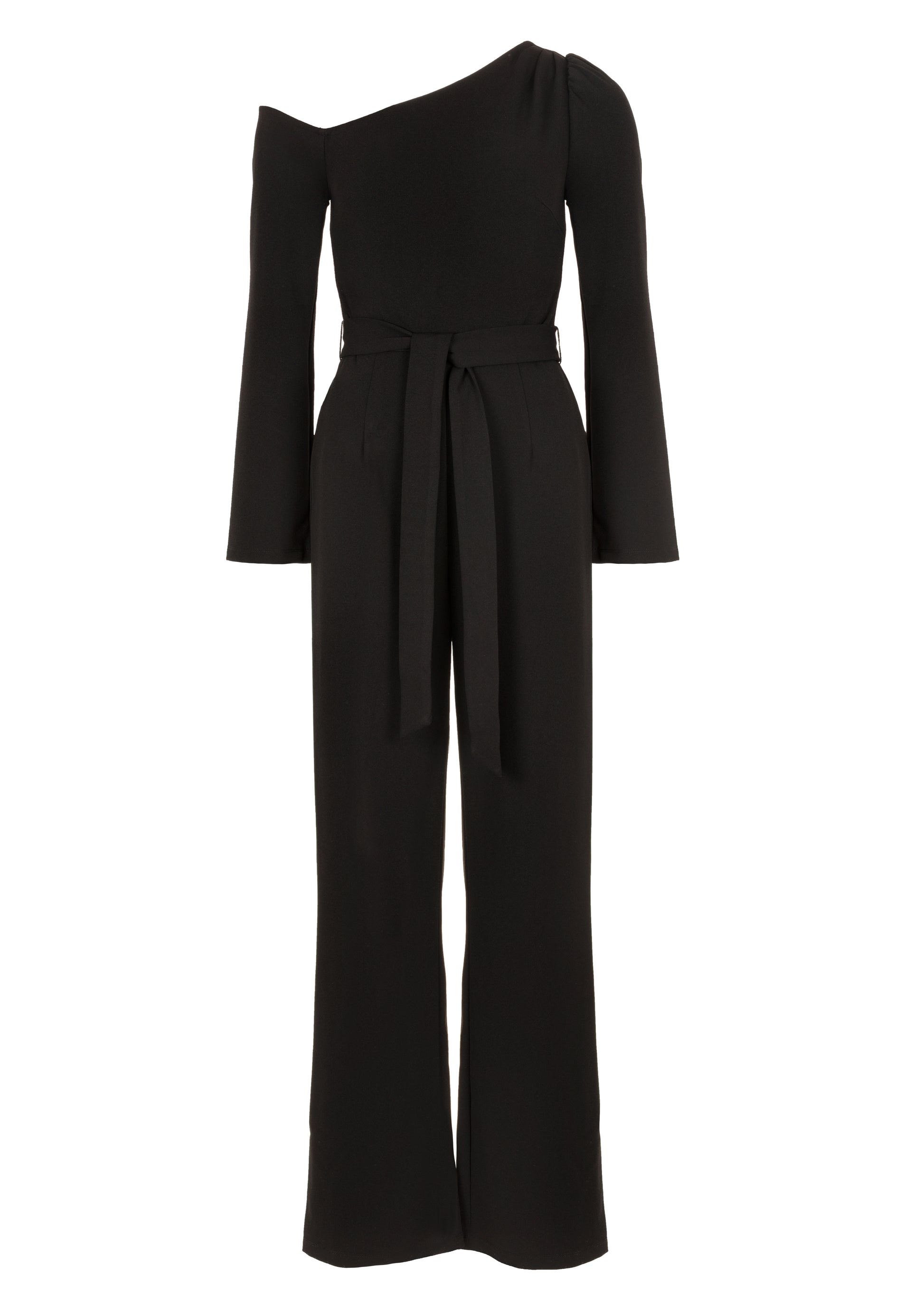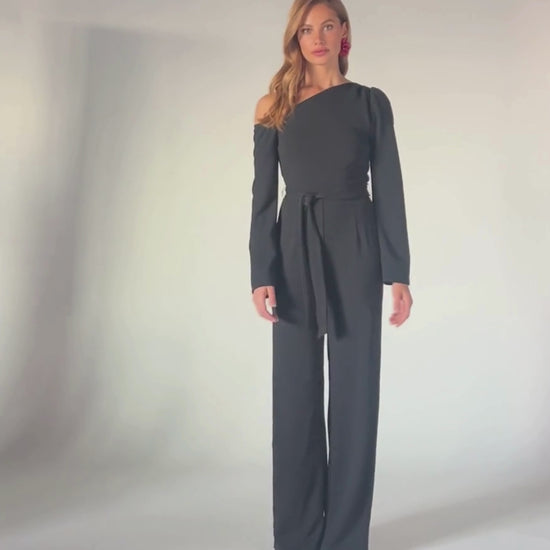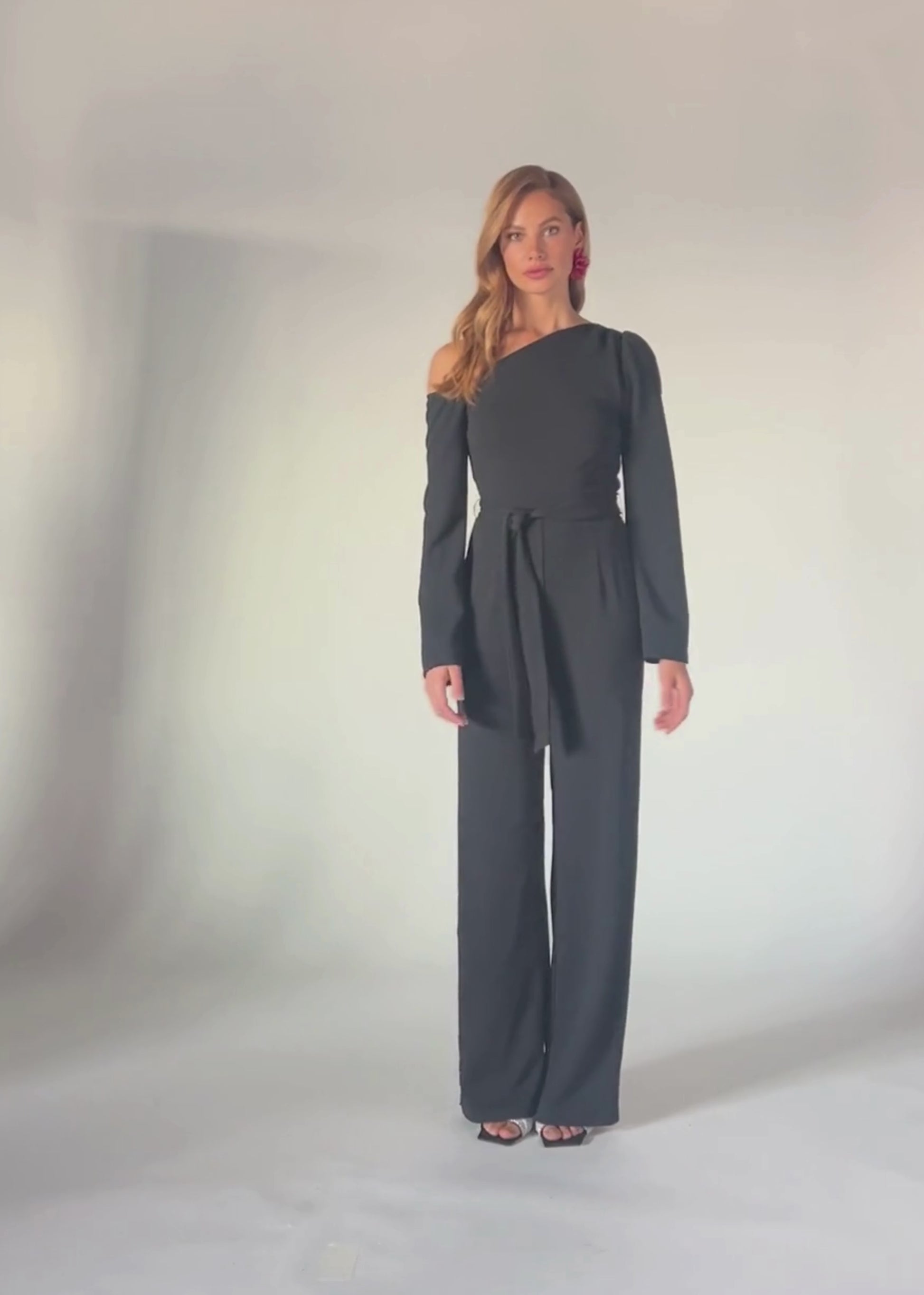 De jumpsuit is gemaakt van een comfortabele crêpe jersey kwaliteit met stretch, waardoor hij soepel valt en een flatterende pasvorm heeft. De asymmetrische schouderlijn geeft het ontwerp een moderne en stijlvolle uitstraling. De tailleband die je zelf kunt strikken accentueert de taille en zorgt voor een vrouwelijk silhouet. Perfect voor zowel een diner als een feestelijke gelegenheid.