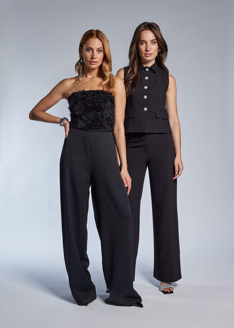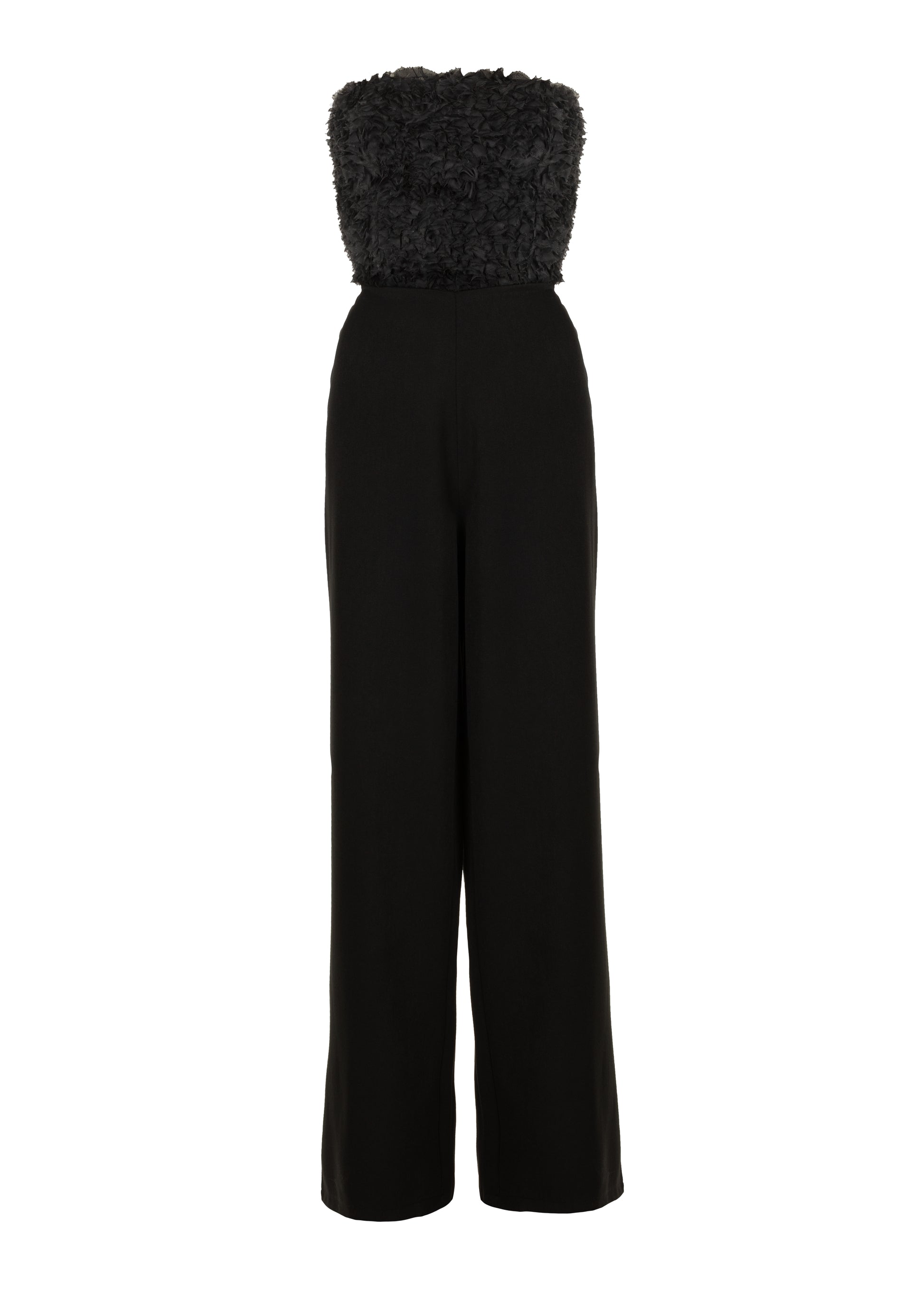 De onderkant is uitgevoerd in een verfijnde woven kwaliteit die soepel valt en zorgt voor een elegante look. De bovenkant is gemaakt van 3D-mesh met een subtiel bloemenpatroon dat zorgt voor een speels en luxueus effect. Dankzij de aansluitende pasvorm en de bandeau top creëert deze jumpsuit een vrouwelijk silhouet dat perfect is voor feestelijke gelegenheden of een avond uit.