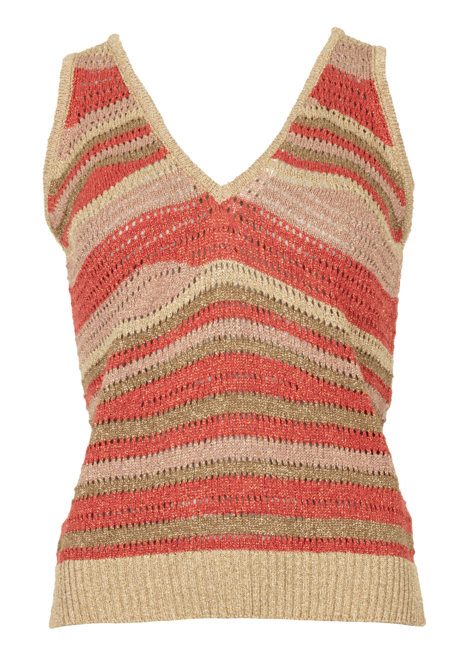 Deze stijlvolle, mouwloze top is gemaakt van een gebreide viscose blend met lurex, wat zorgt voor een zachte feel en een prachtige subtiele glans. De top heeft een vrouwelijke V-hals aan zowel de voor- als achterkant, wat zorgt voor een elegante en luchtige uitstraling. Perfect te combineren met een rok of pantalon voor zowel casual als feestelijke gelegenheden.