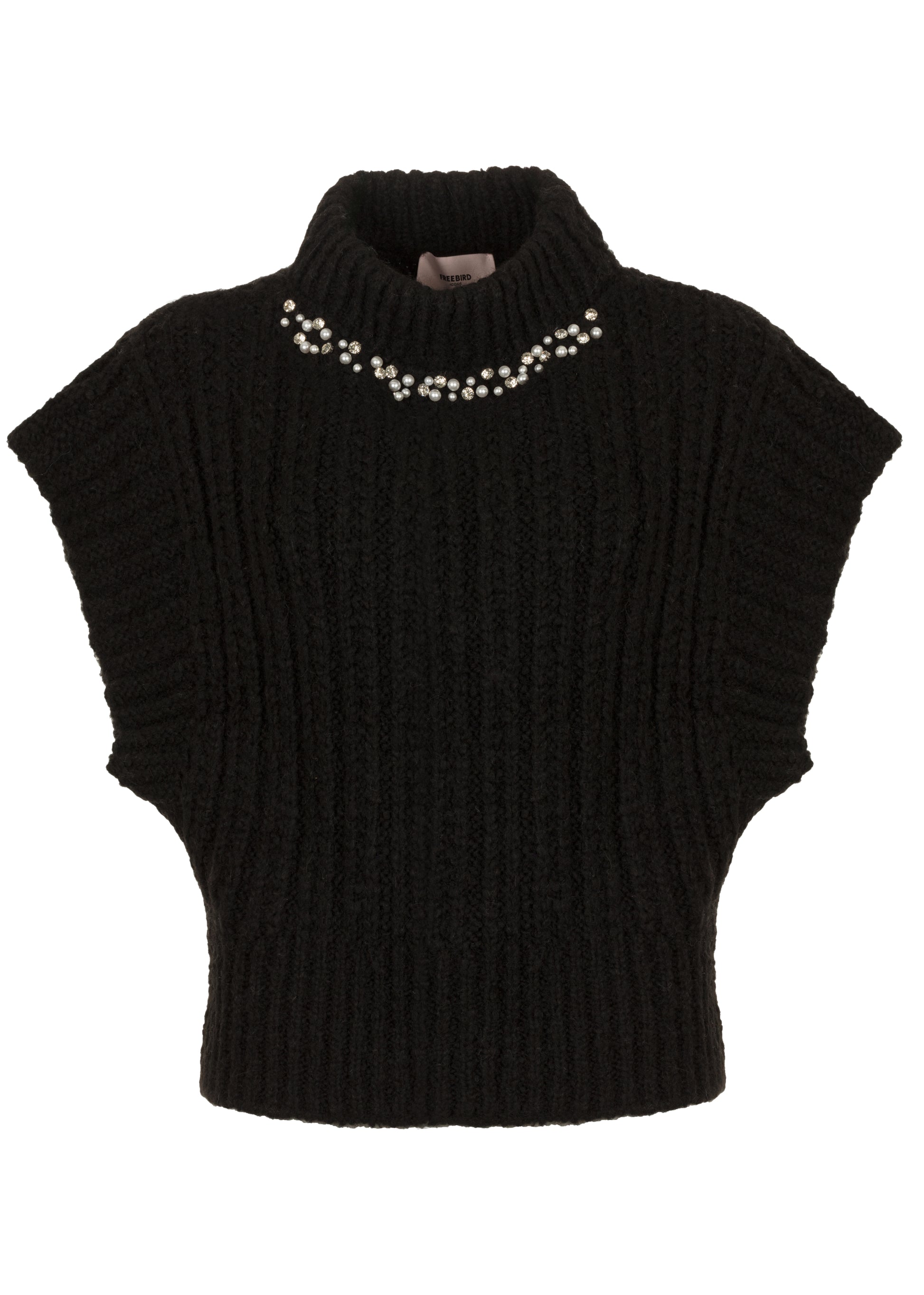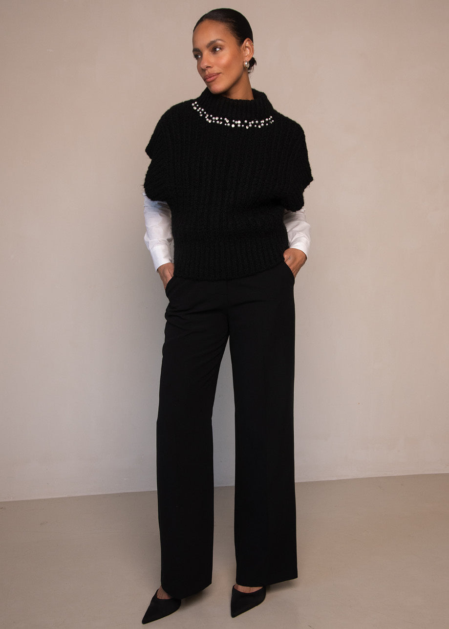 De Kalista Spencer is een eigentijdse, mouwloze knit die moeiteloos stijl en comfort combineert. Gemaakt van een zachte, hairy garenmix, voelt deze spencer warm en luxueus aan. De parel- en steendecoratie langs de halslijn voegt een verfijnde, vrouwelijke touch toe aan het grovere breisel. De hoge col en geribde structuur zorgen voor een moderne, ingetogen look.