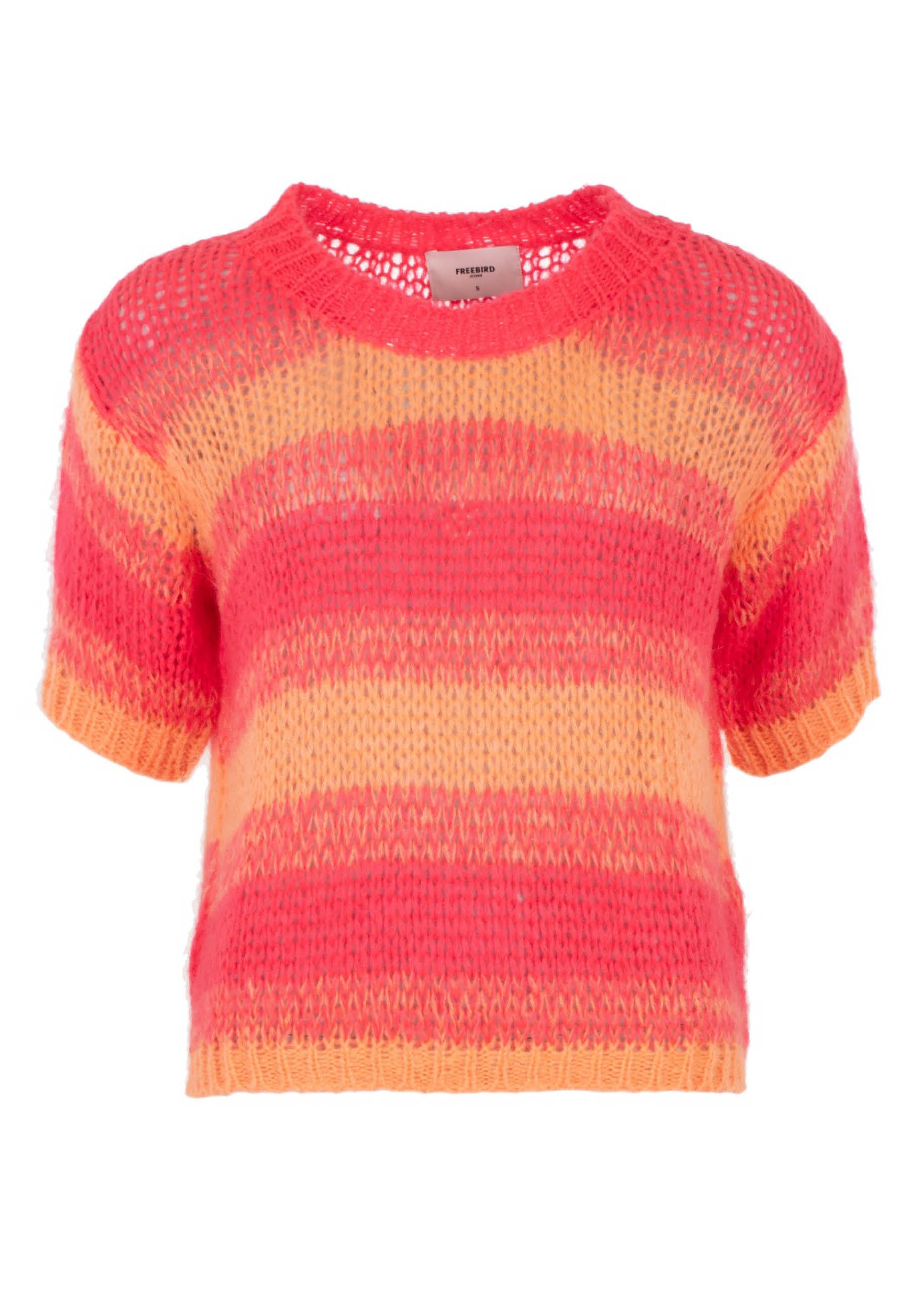 - Roze top met een streepjespatroon, ronde hals en korte mouwen.