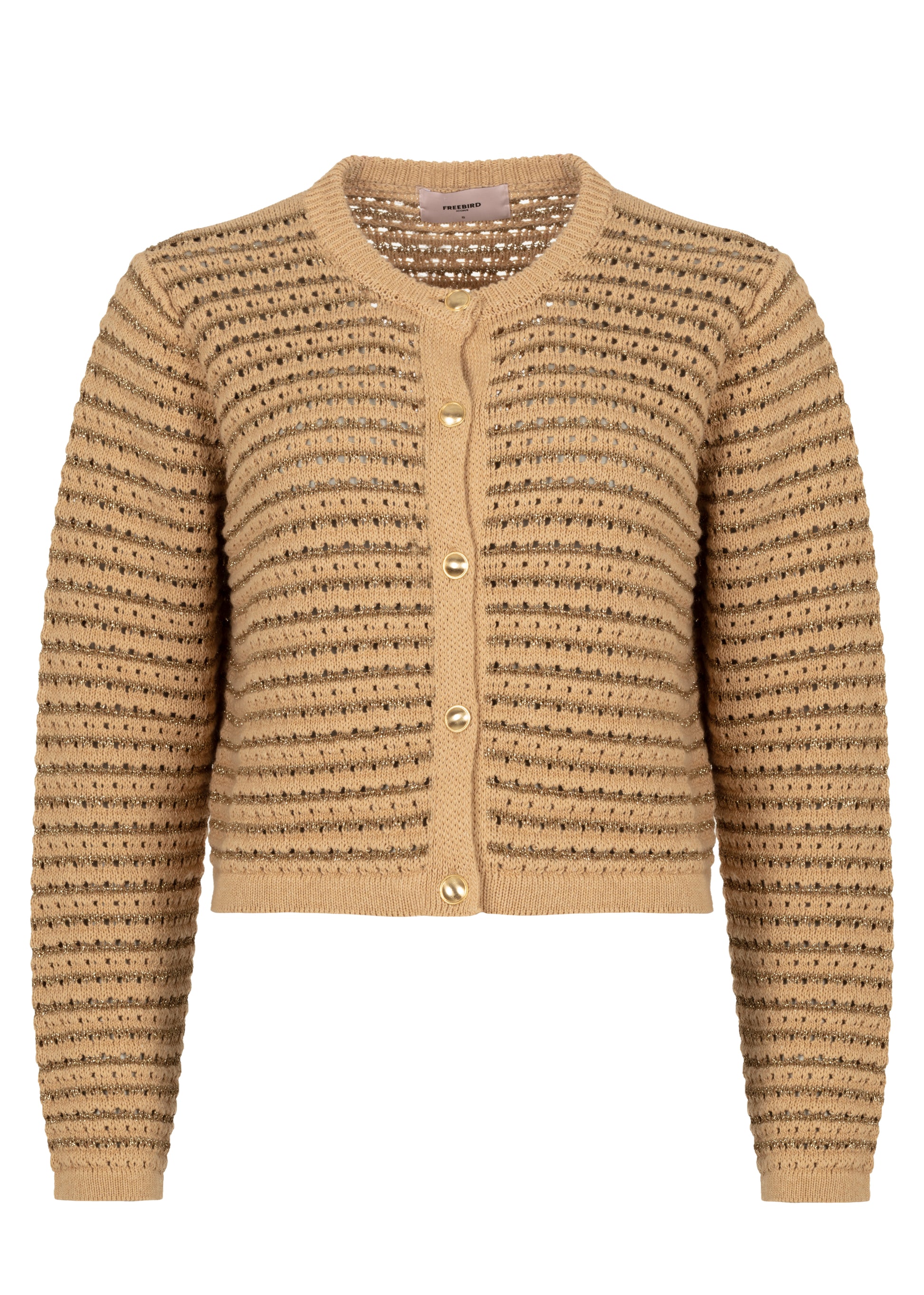 Dit fijne, gebreide vestje met lange mouwen heeft een charmante uitstraling dankzij de horizontale streepstructuur, verweven met subtiel glinsterend lurexgaren. De elegante knoopsluiting met fancy knopen voegt een verfijnde finishing touch toe. Het zachte materiaal en de comfortabele pasvorm maken dit vest perfect om over een blouse of jurk te dragen, zowel casual als gekleed.