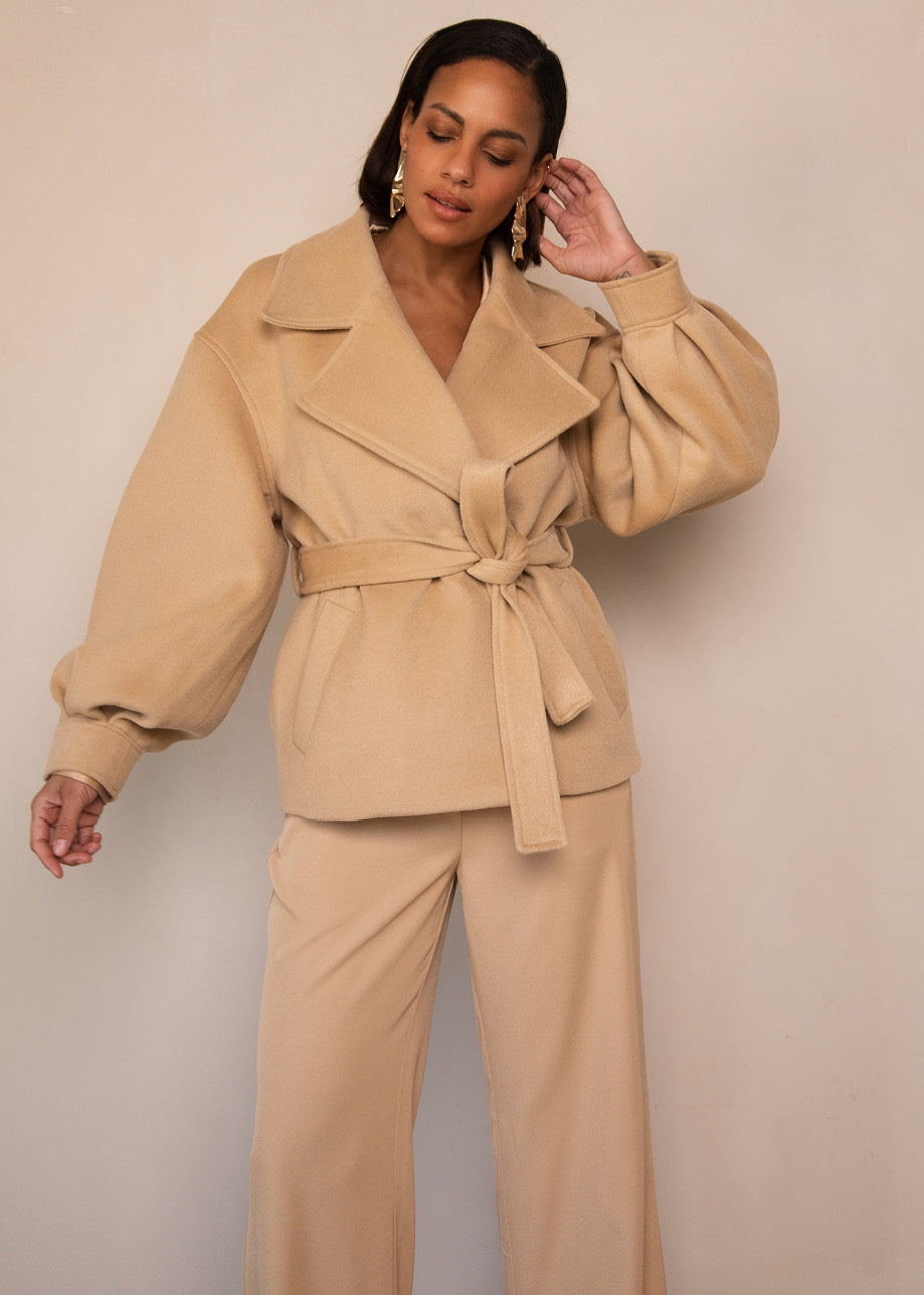 De Leyli Coat is een stijlvolle jas die moeiteloos structuur en vrouwelijkheid combineert. Uitgevoerd in een zachte polyester twill kwaliteit, biedt deze korte double-breasted jas een moderne look met klassieke elementen. De pofmouwen zorgen voor een subtiele, modieuze touch, terwijl de tailleceintuur het silhouet mooi accentueert.