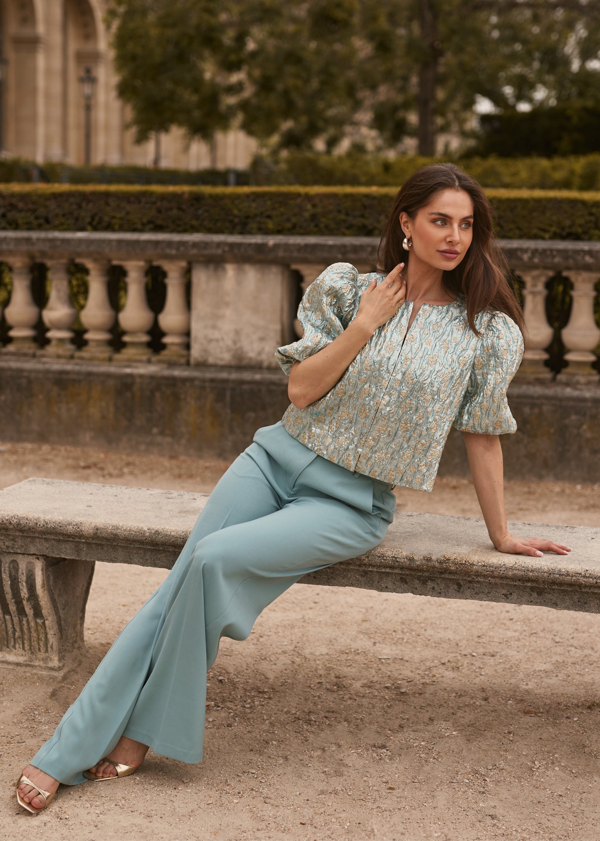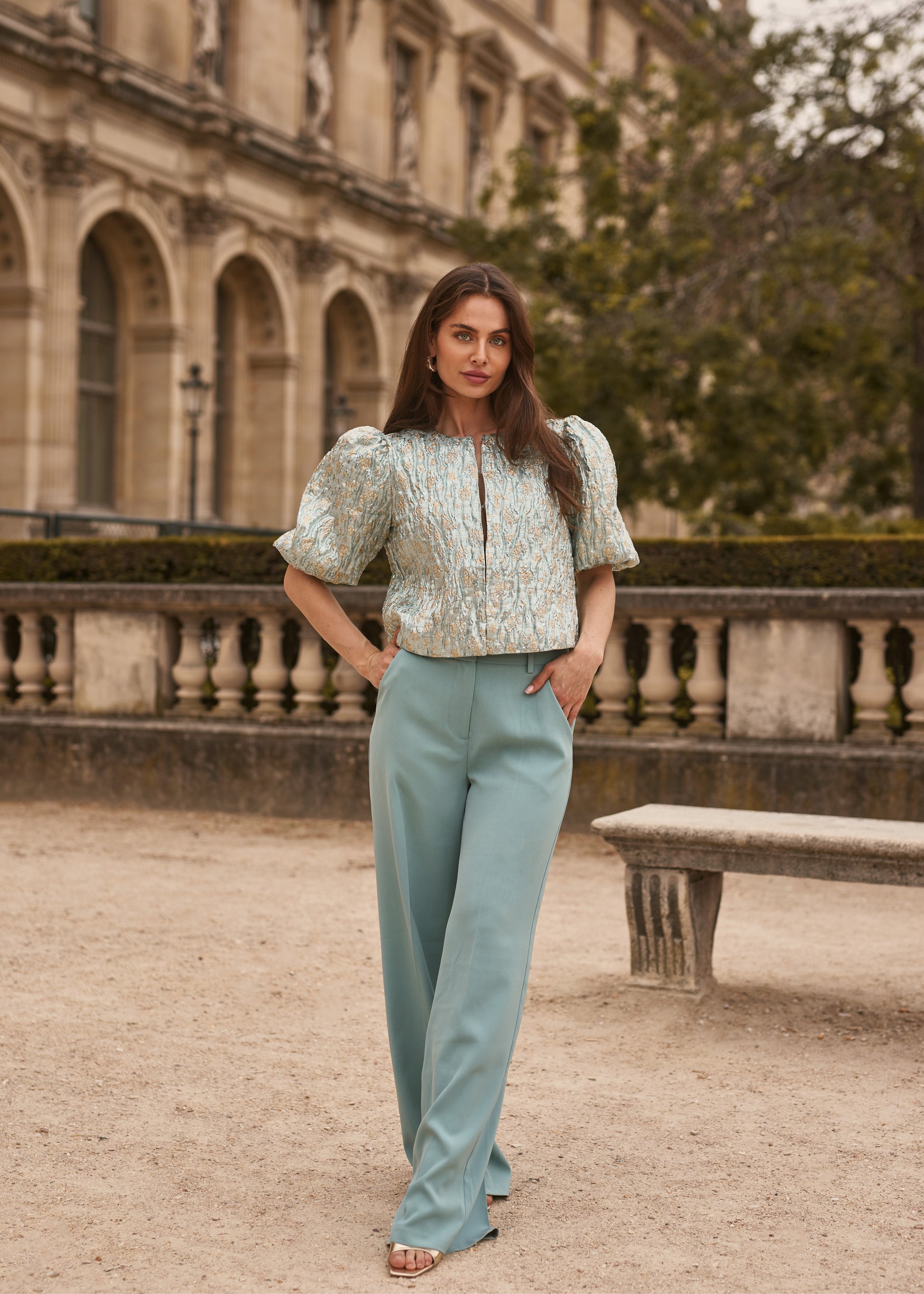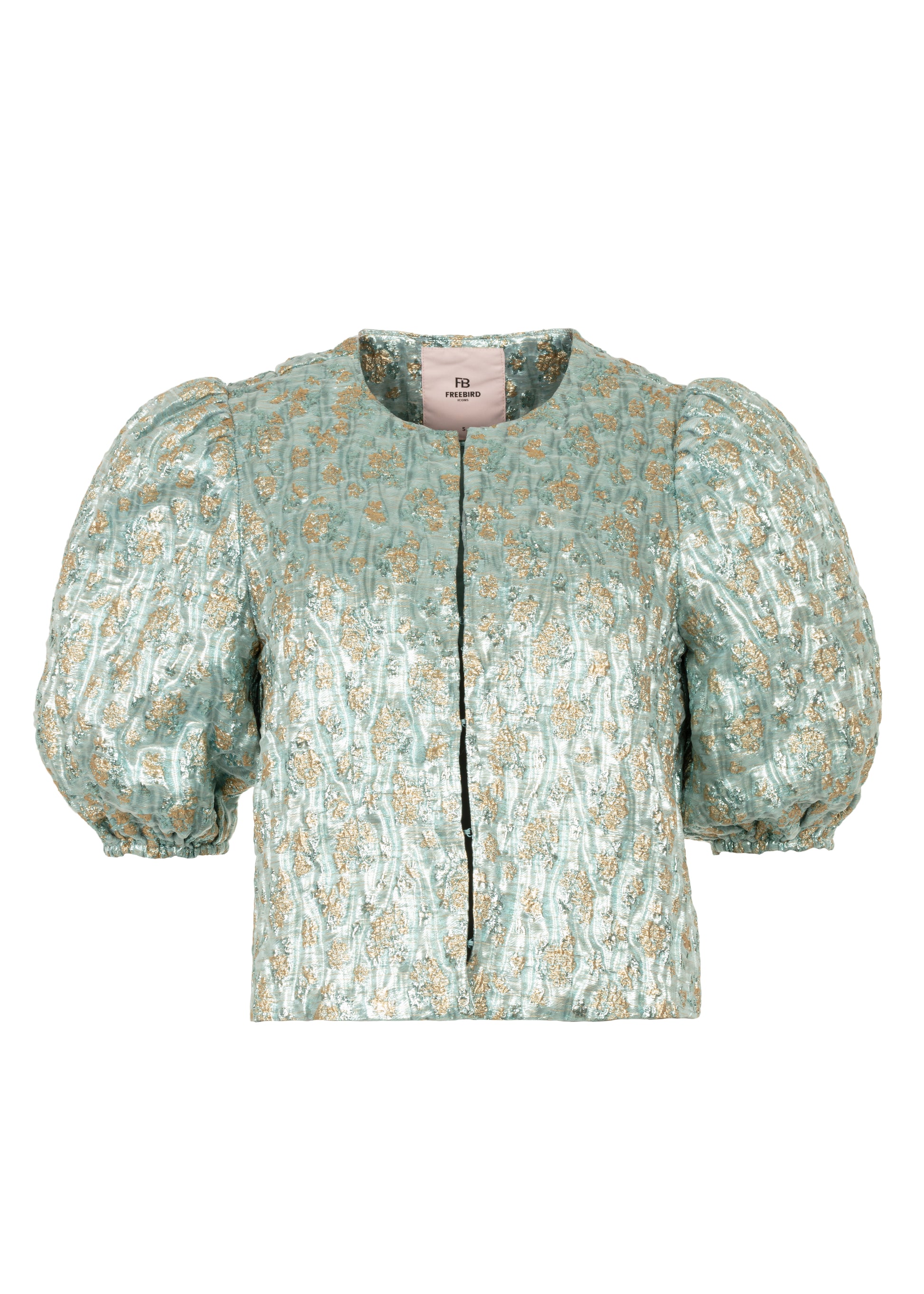 Dit elegante korte jasje is een waar statement piece. Gemaakt van een luxe jacquard stof met glinsterende lurex details, straalt het een feestelijke en verfijnde uitstraling uit. De volumineuze pofmouwen geven een modieuze twist, terwijl de blinde sluiting zorgt voor een strakke en elegante afwerking. Perfect om je outfit een glamoureuze upgrade te geven.