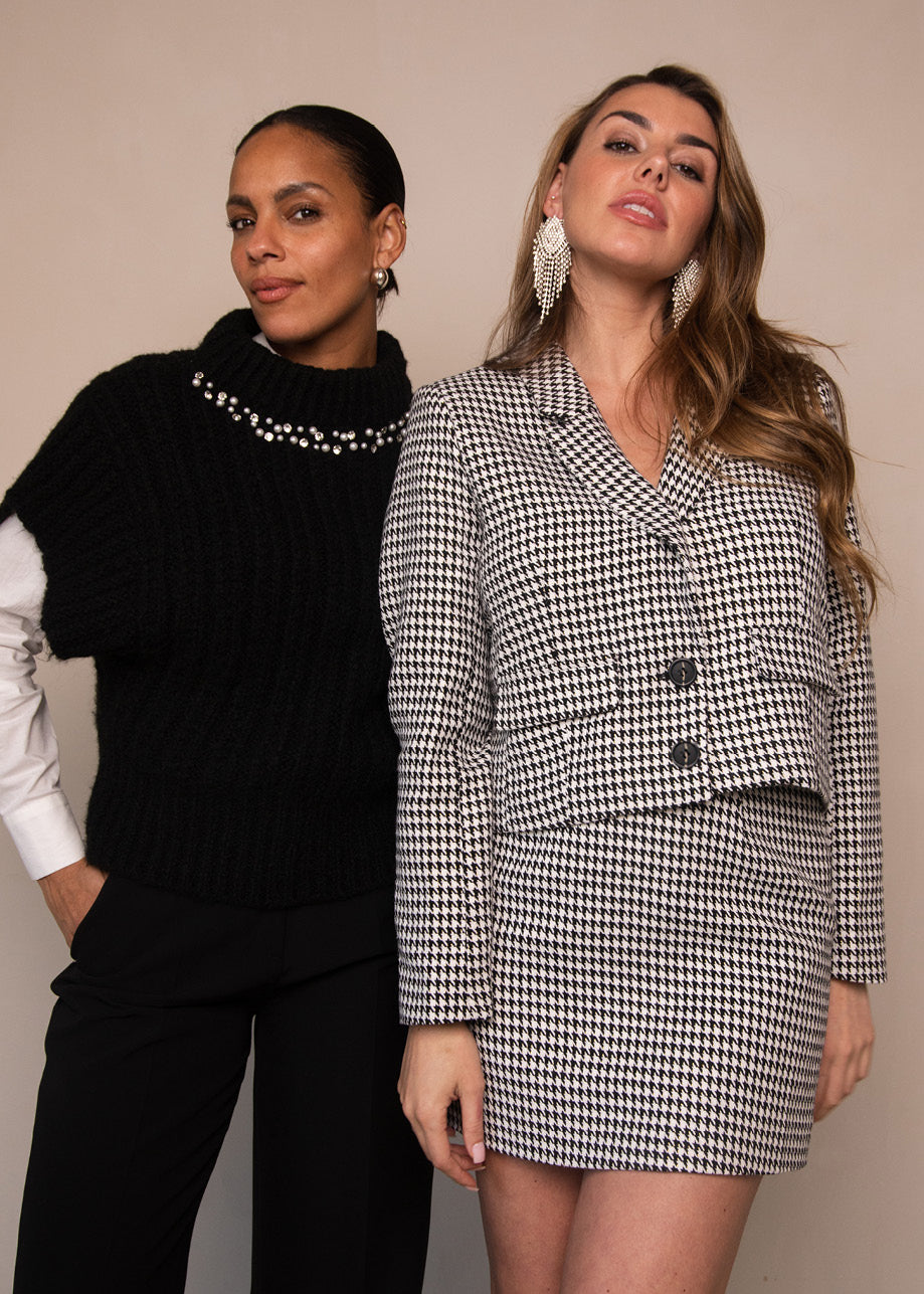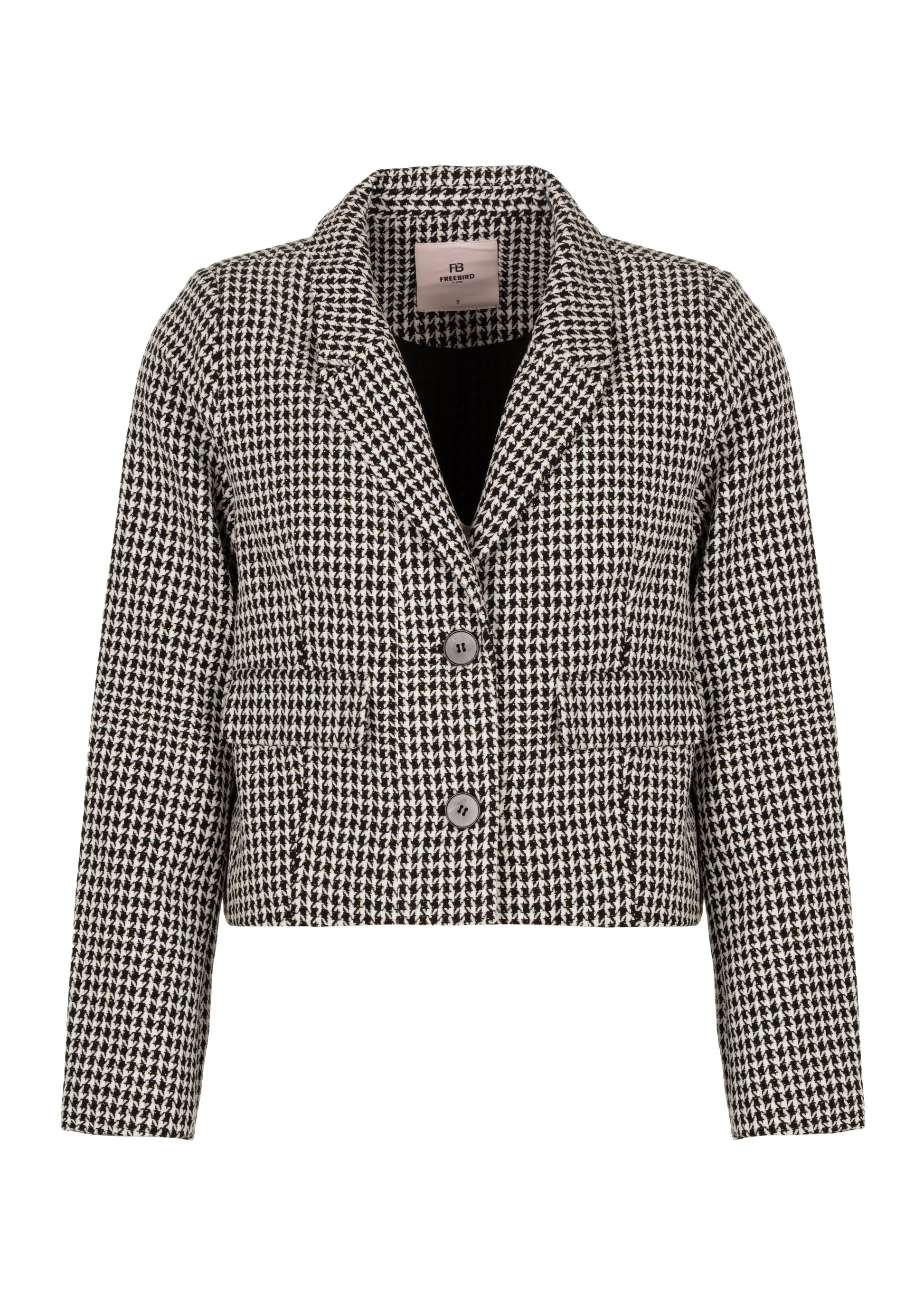 Voeg een klassieke twist toe aan je outfit met deze cropped blazer in pied-de-poule dessin. Gemaakt van een zachte jacquardkwaliteit, combineert dit item moeiteloos tijdloze elegantie met moderne flair. De schoudervullingen zorgen voor een krachtige, gestructureerde look, terwijl de korte lengte perfect balanceert met high-waisted broeken of rokken. De blazer is afgewerkt met een klassieke reverskraag, lange mouwen en een stijlvolle knoopsluiting.