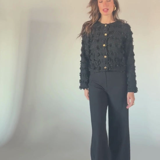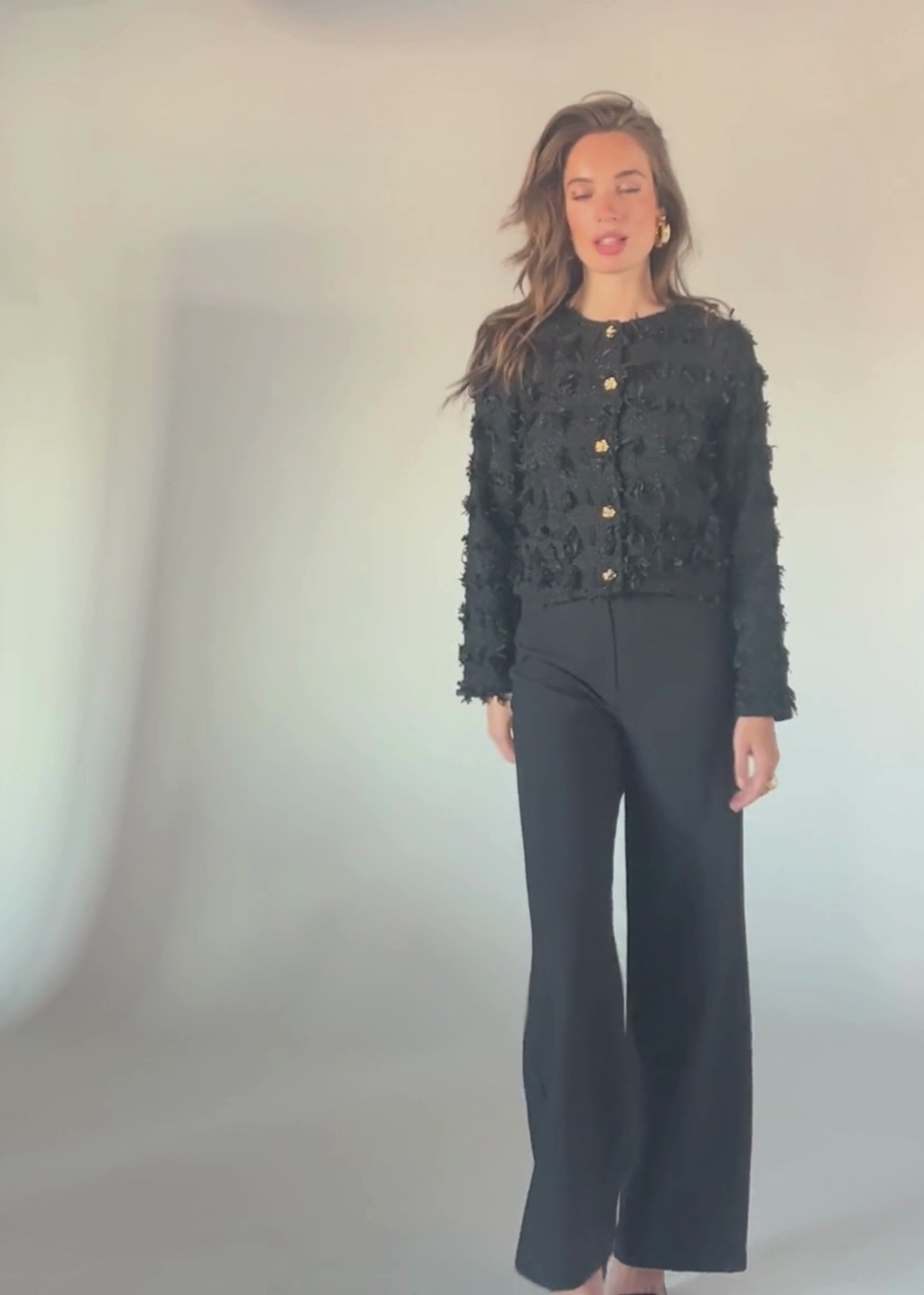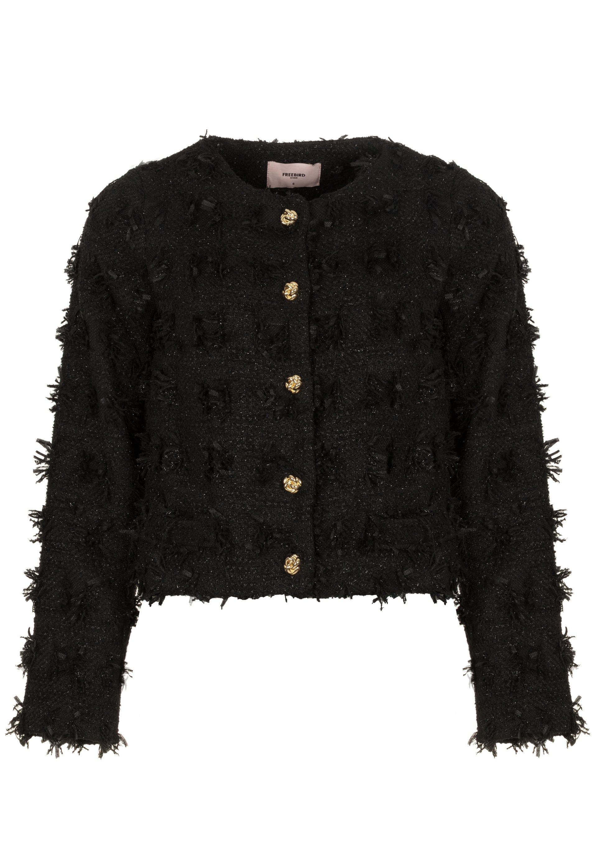 Het jasje is gemaakt van een verfijnde woven bouclé kwaliteit met een subtiel harig effect en glinsterende lurexdraden, wat zorgt voor een rijke en elegante look. De klassieke knoopsluiting en rechte pasvorm geven het ontwerp een stijlvolle, vrouwelijke uitstraling. Perfect te combineren met een pantalon of jurk voor een chique, moderne outfit.