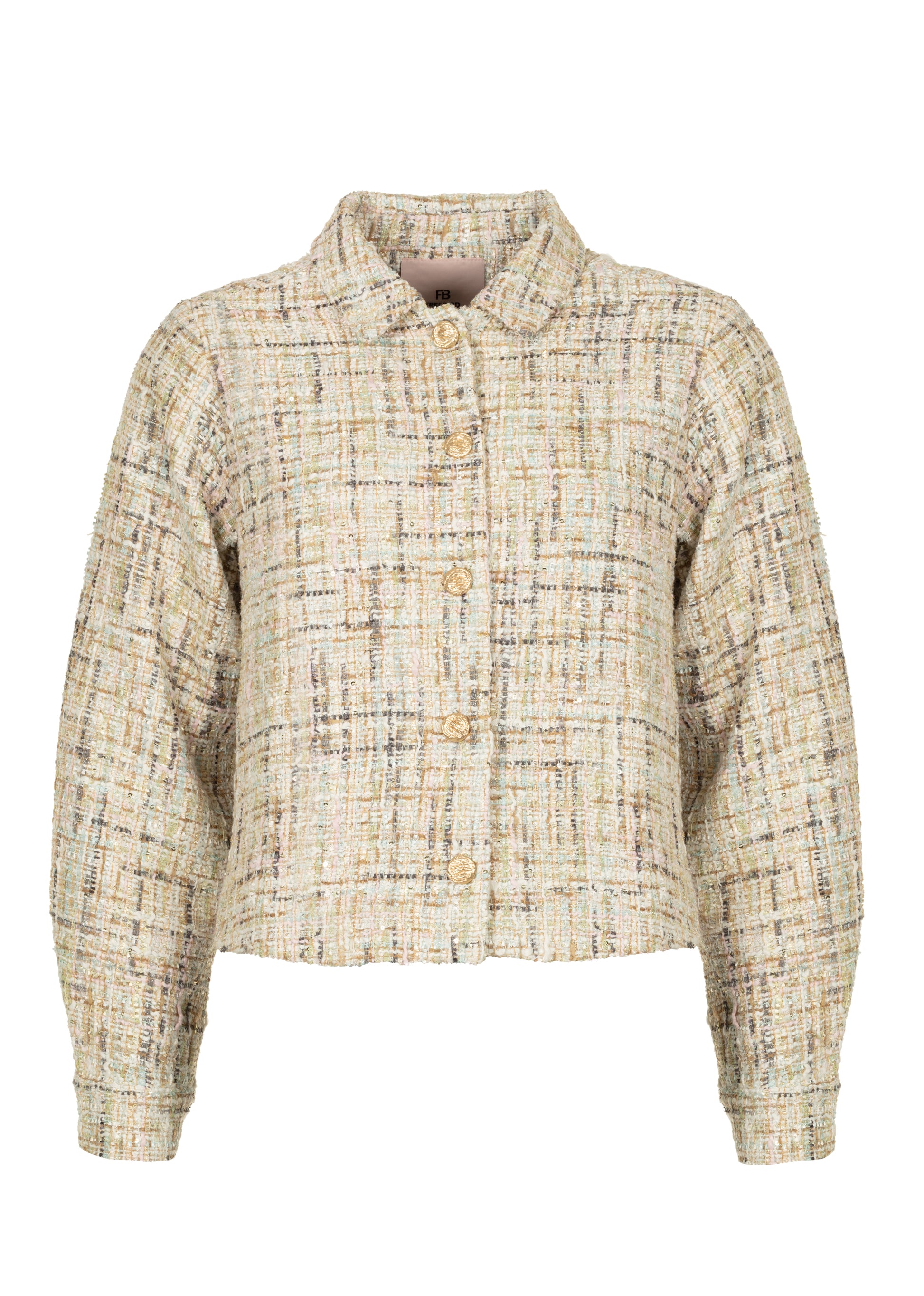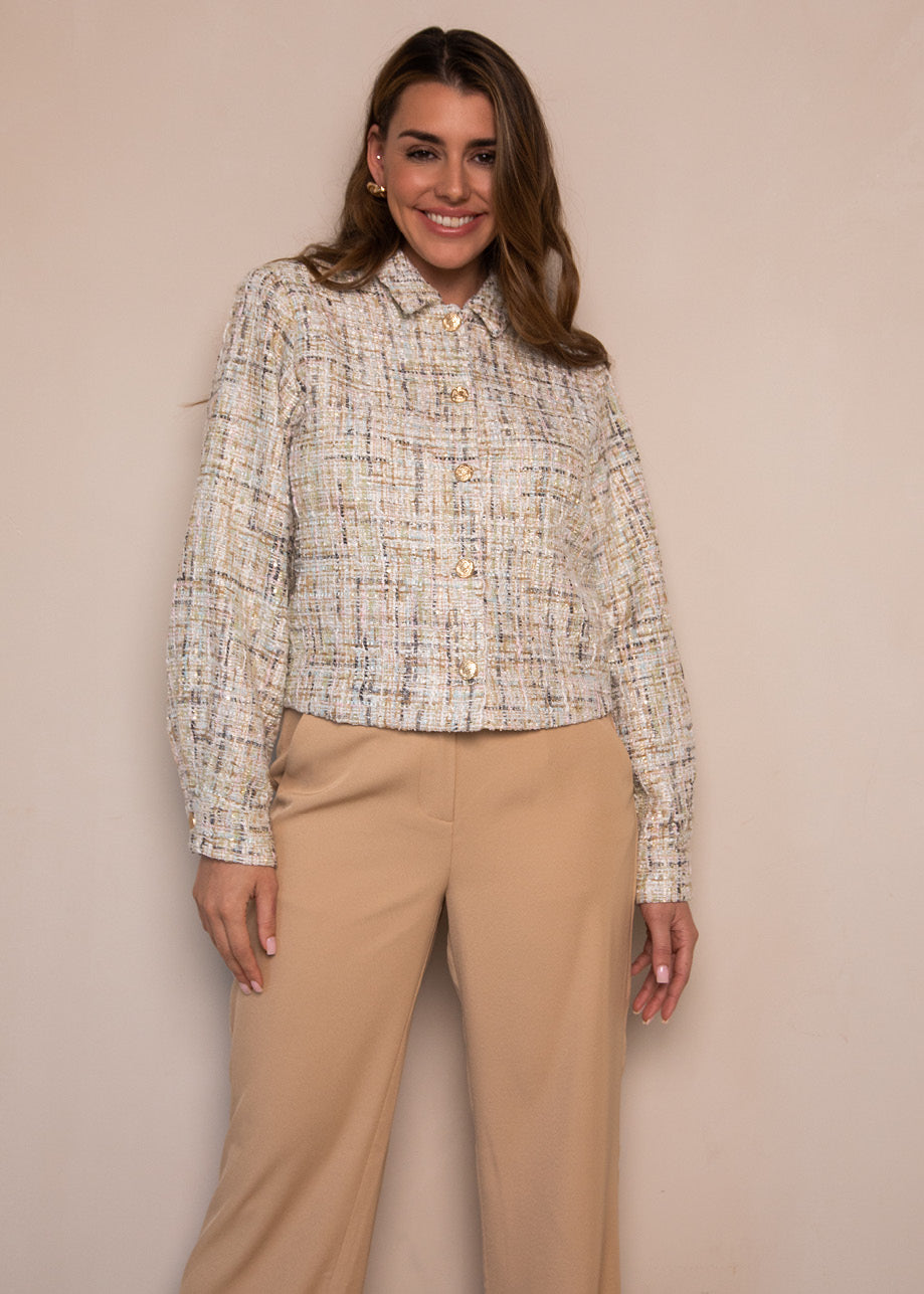 Gemaakt van een zachte bouclé stof met glinsterende accenten en een verfijnde mix van kleuren, straalt dit jasje klasse én speelsheid uit. De rijke textuur zorgt voor een modieuze look, terwijl het cropped model perfect combineert met een high-waisted broek of rok. De klassieke knoopsluiting en lange mouwen maken het geheel tijdloos én veelzijdig — ideaal voor een chique daglook of een feestelijke avond.