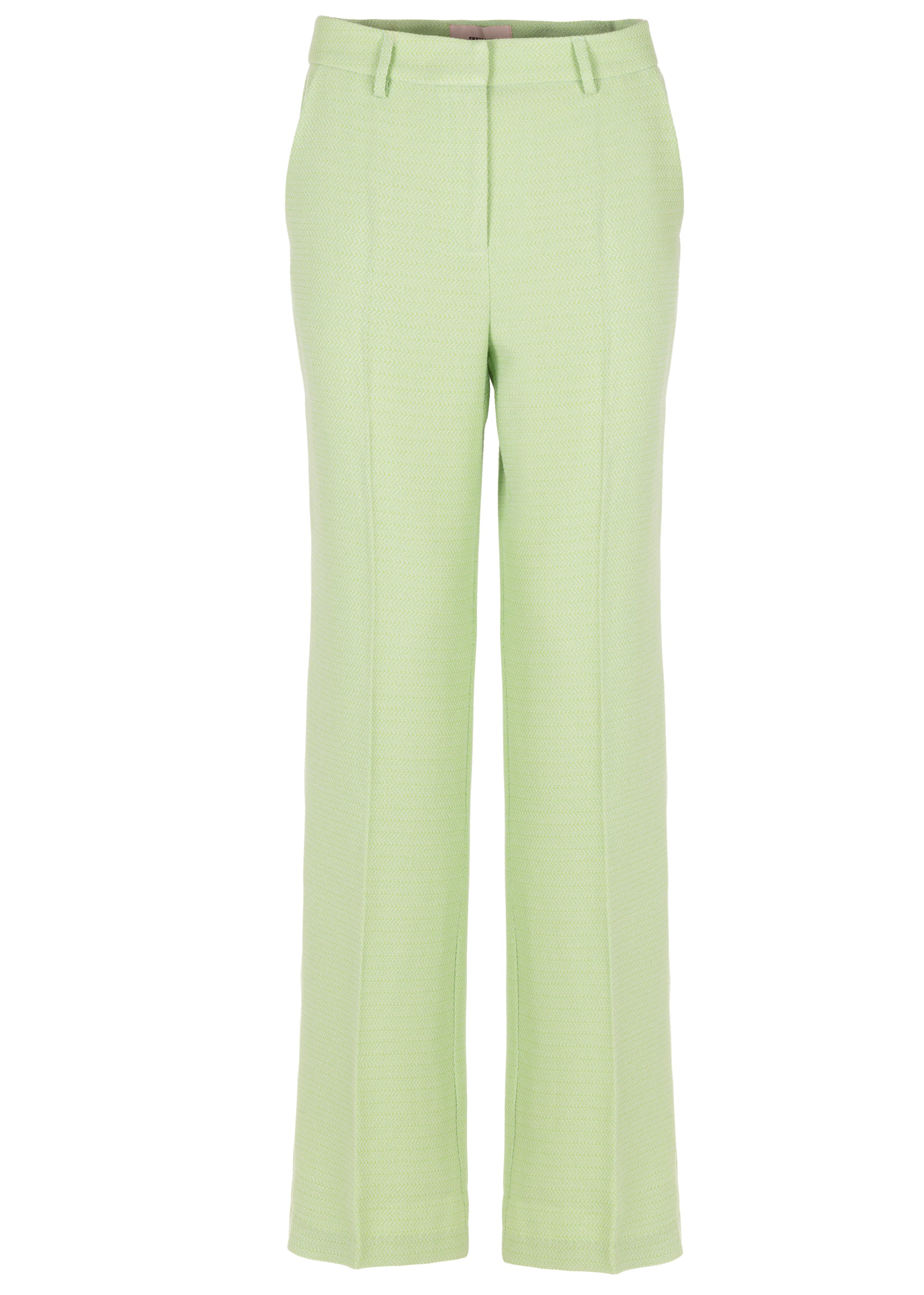Deze elegante high-rise pantalon is gemaakt van een subtiele bouclékwaliteit van polyester, wat zorgt voor een verfijnde en moderne uitstraling. De broek is voorzien van riemlussen en steekzakken, waardoor hij zowel stijlvol als praktisch is. Een tijdloos item dat perfect te combineren is voor zowel zakelijke als casual looks.