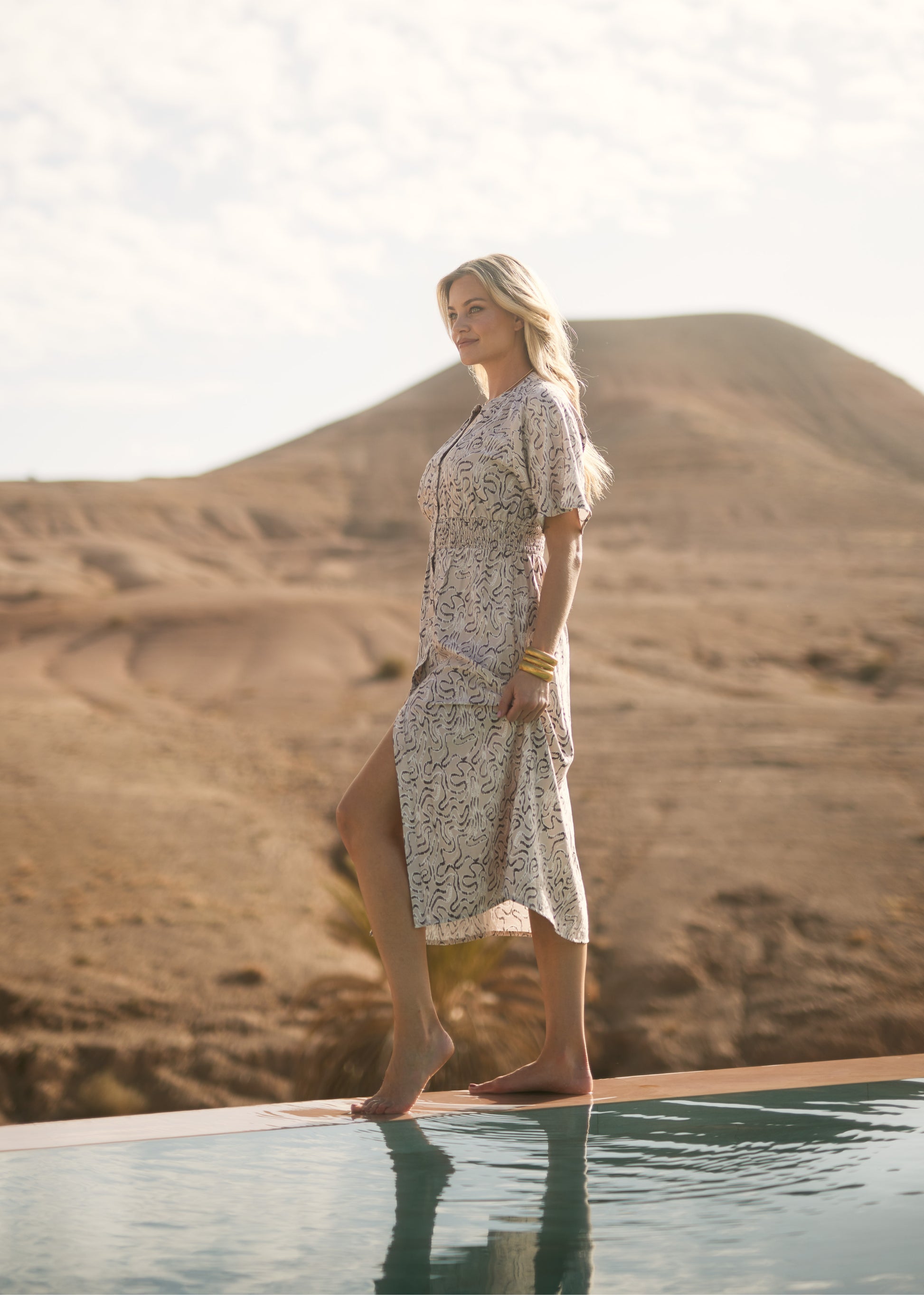 Deze prachtige midi jurk is gemaakt van een hoogwaardige gestructureerde viscose stof, verrijkt met een subtiele gouden foil coating en een unieke print. De V-hals en korte mouwen geven een vrouwelijke touch, waardoor de jurk perfect is voor zowel casual als chique gelegenheden.