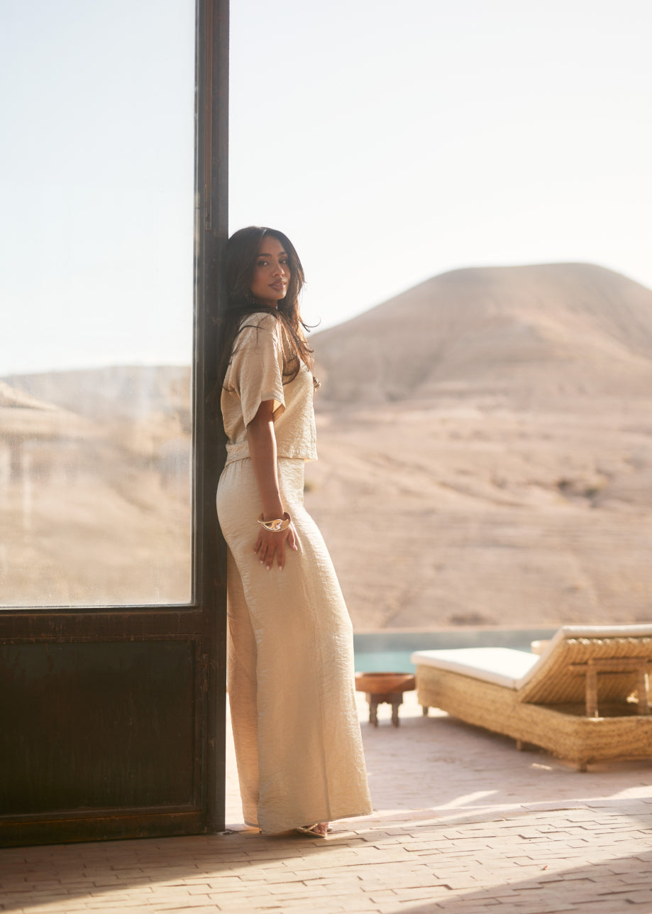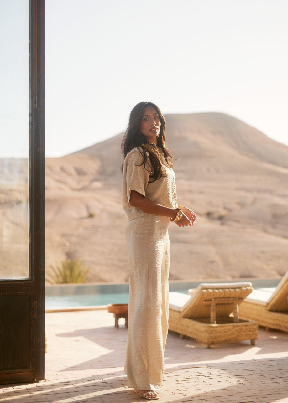 Deze elegante wijde broek is gemaakt van een luxe viscose twill kwaliteit met subtiele lurex details, wat zorgt voor een verfijnde en stijlvolle uitstraling. De elastische tailleband biedt optimaal draagcomfort en maakt de broek perfect voor zowel casual als geklede looks.