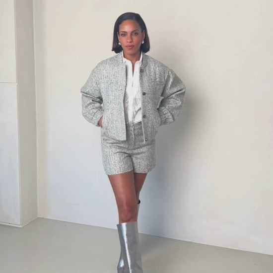 Gemaakt van een zachte fancy stof met zilveren en gouden lurexdraden, straalt deze short pure elegantie uit. Het klassieke pantalontaillebandontwerp zorgt voor een nette, verfijnde uitstraling, terwijl de paspelzakken aan de achterzijde een minimalistische touch geven. Combineer de short met een bijpassende top of blazer voor een chique co-ord set, of draag hem casual met een basic T-shirt en sneakers.