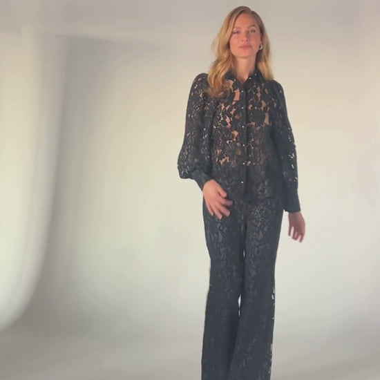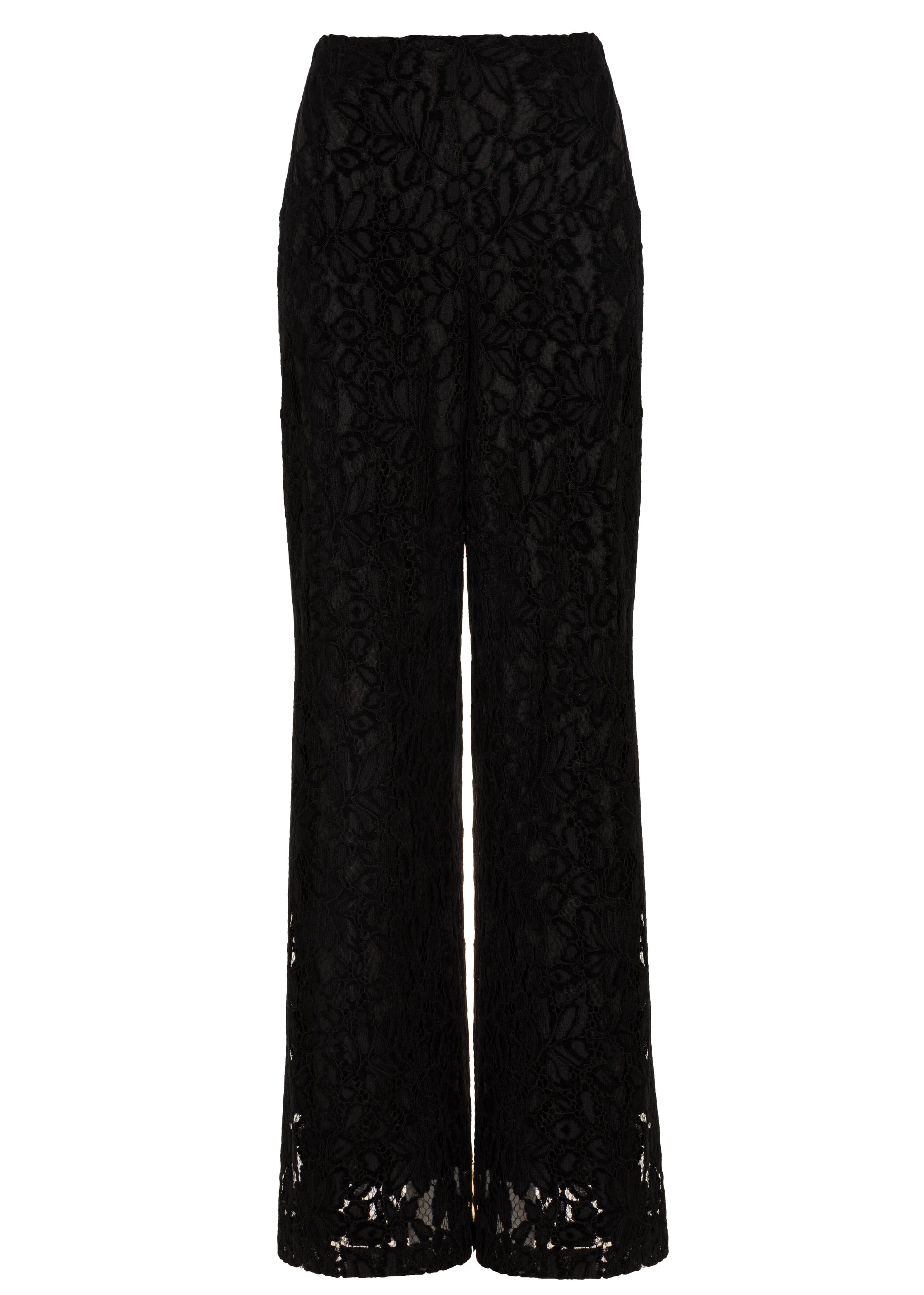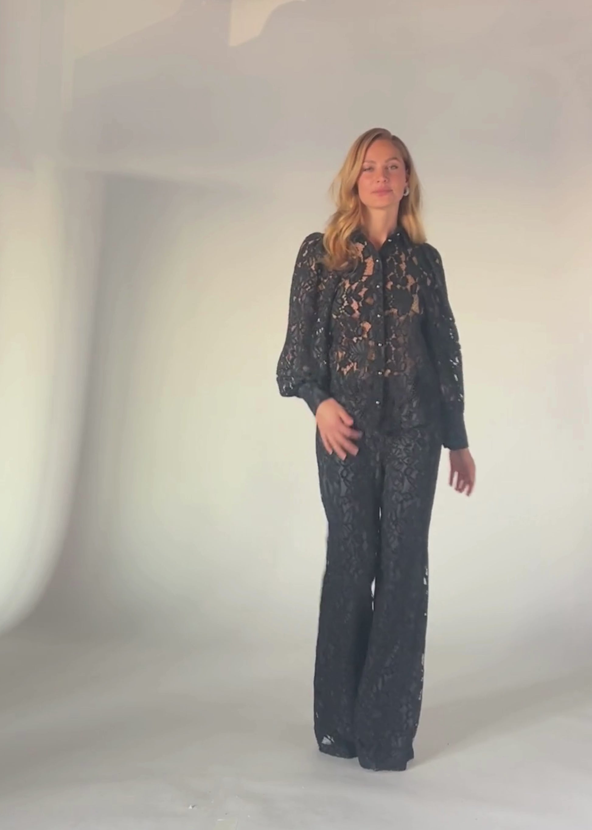 Deze broek is gemaakt van een zachte kanten kwaliteit met een subtiele veloursafwerking, wat zorgt voor een verfijnde textuur en een chique look. De wijde pijpen creëren een soepel en elegant silhouet, terwijl de ritssluiting aan de zijkant zorgt voor een mooie, strakke afwerking. Perfect te combineren met een kanten top of blazer voor een stijlvolle, feestelijke outfit.