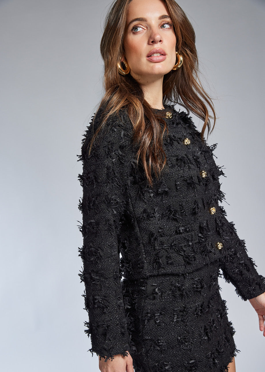 - Luxe woven bouclé kwaliteit met harig effect en lurex