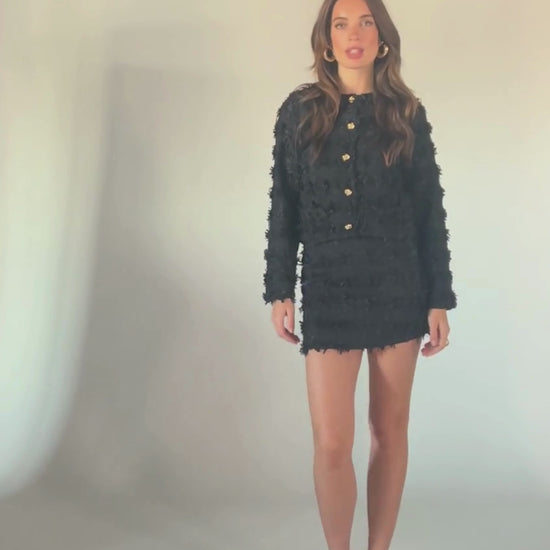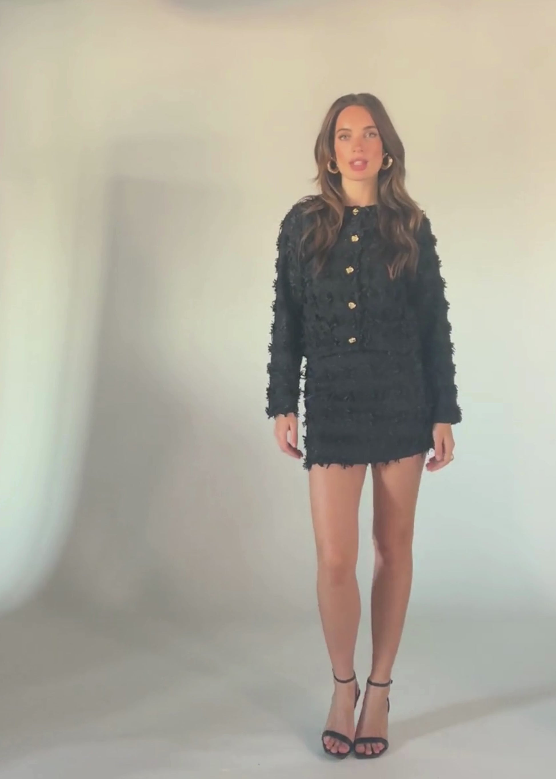 Een stijlvol kort bouclé rokje met een luxe en tijdloze uitstraling.