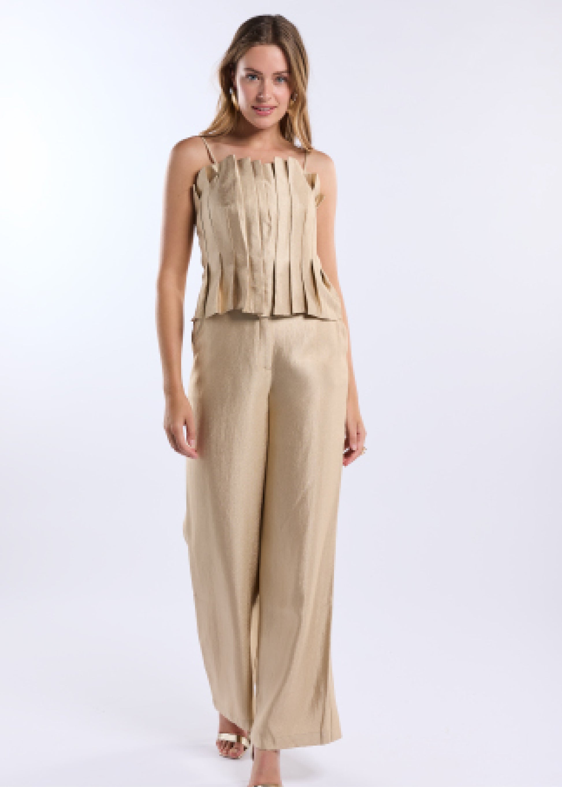 Deze bustier top is gemaakt van een luxe geweven stof met een verfijnde glans. De geplooide voorzijde geeft een elegant silhouet, terwijl de gesmokte achterkant zorgt voor een comfortabele pasvorm. De afneembare bandjes maken het mogelijk om de top op verschillende manieren te dragen.