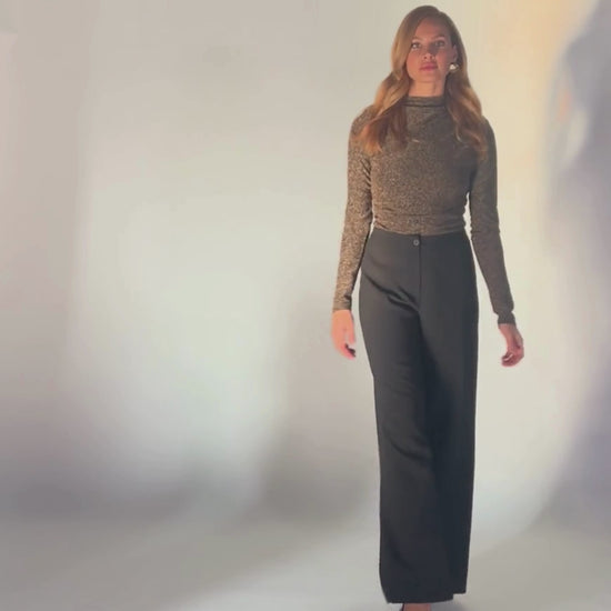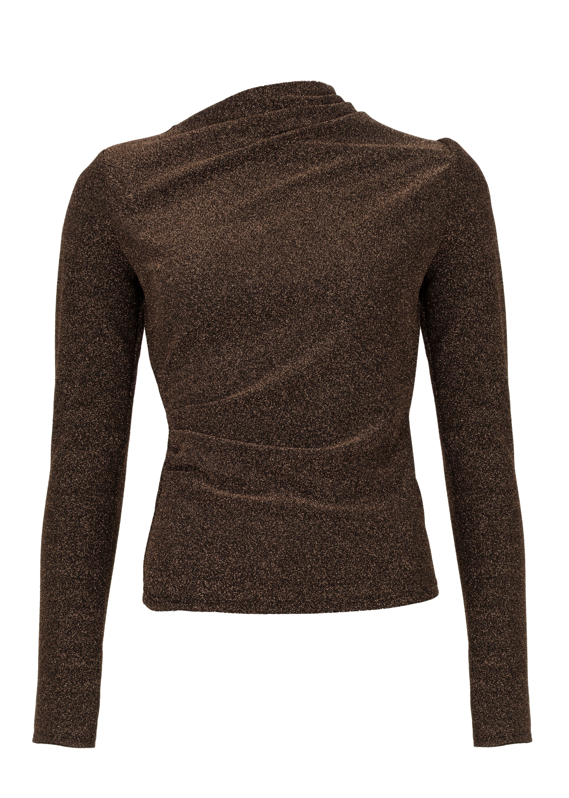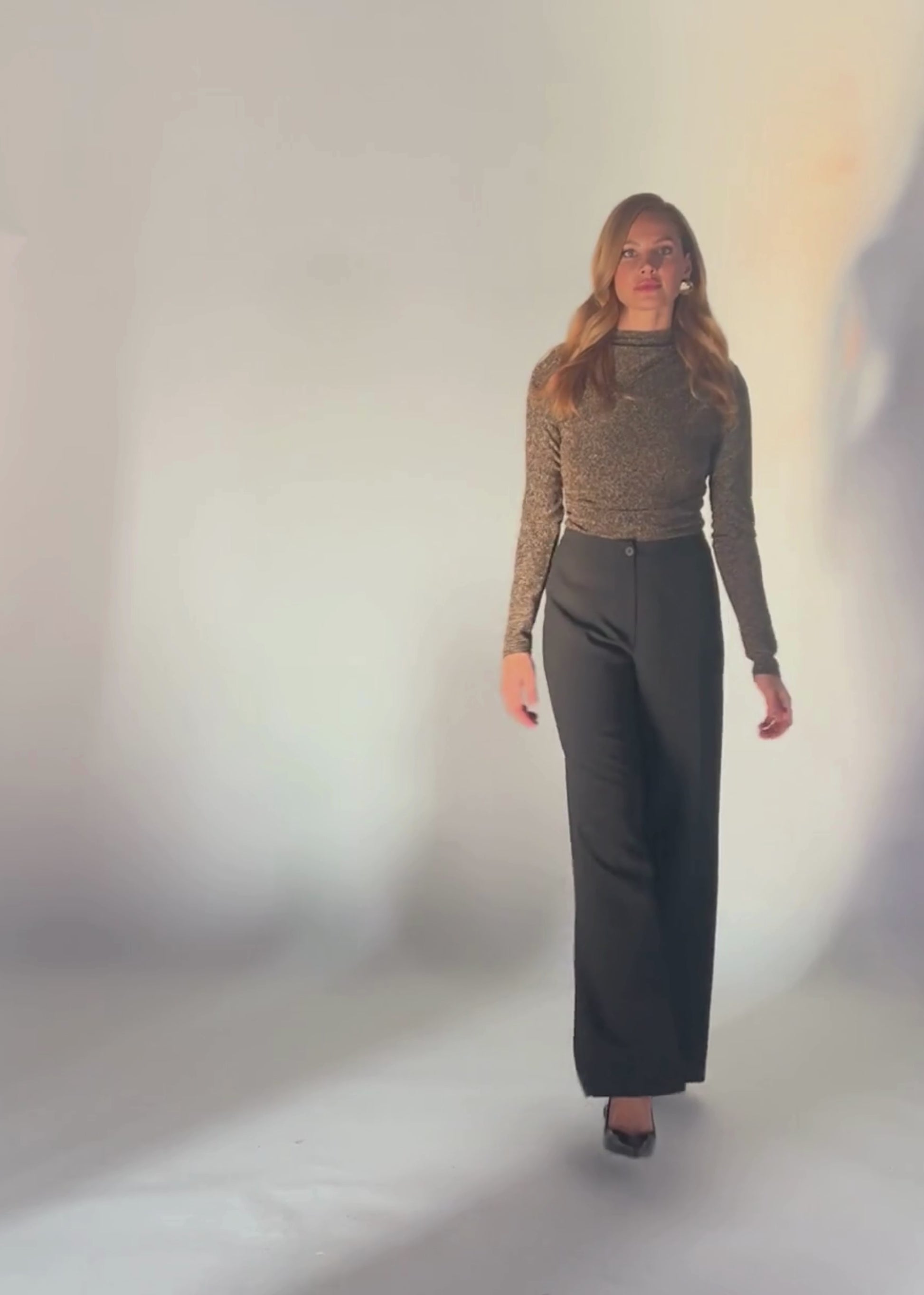 Deze top is gemaakt van een soepele jersey glitterstof met stretch, waardoor hij comfortabel draagt en mooi om het lichaam valt. De hoge halslijn met watervalplooien voegt een verfijnde en vrouwelijke touch toe, terwijl de lange mouwen zorgen voor een tijdloze elegantie. Perfect voor een chique diner, feest of een stijlvolle avondlook.