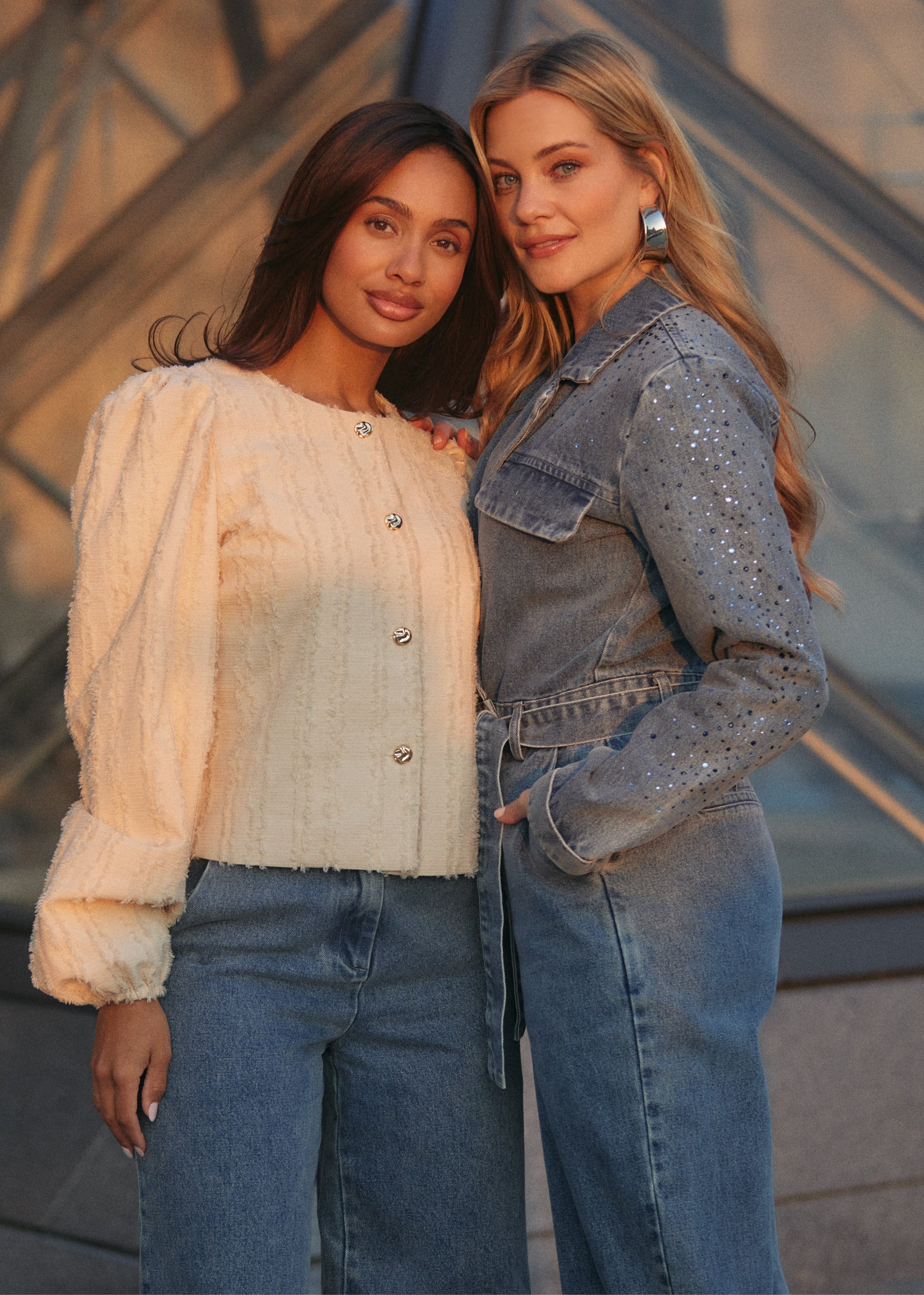 Deze jumpsuit is gemaakt van een zachte, soepele denimstof zonder stretch, wat zorgt voor een comfortabele en stijlvolle pasvorm. De overslag aan de voorzijde en de strikceintuur in de taille accentueren het silhouet op elegante wijze. De toevoeging van tweekleurige strassstenen op de mouwen en schouders geeft dit item een speels en opvallend detail. Perfect voor een stoere maar vrouwelijke look.